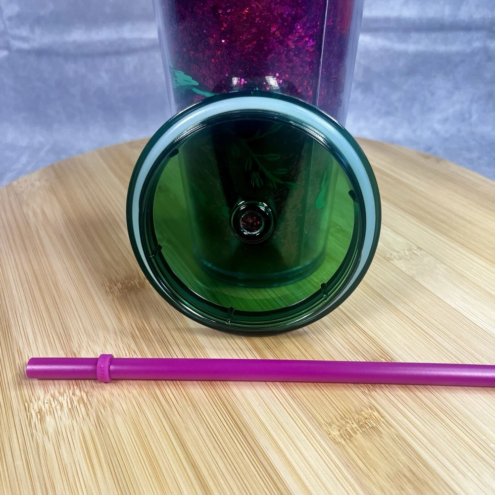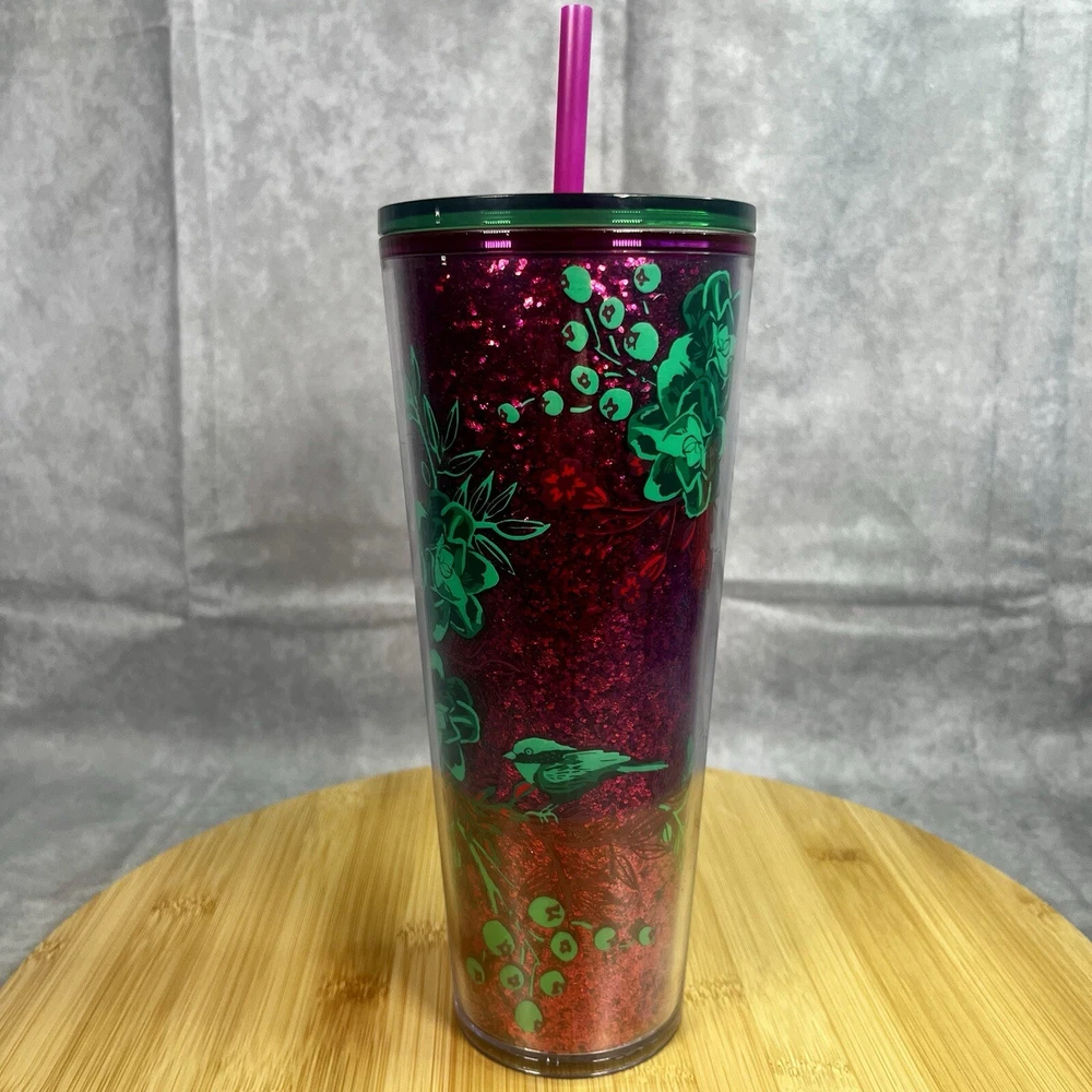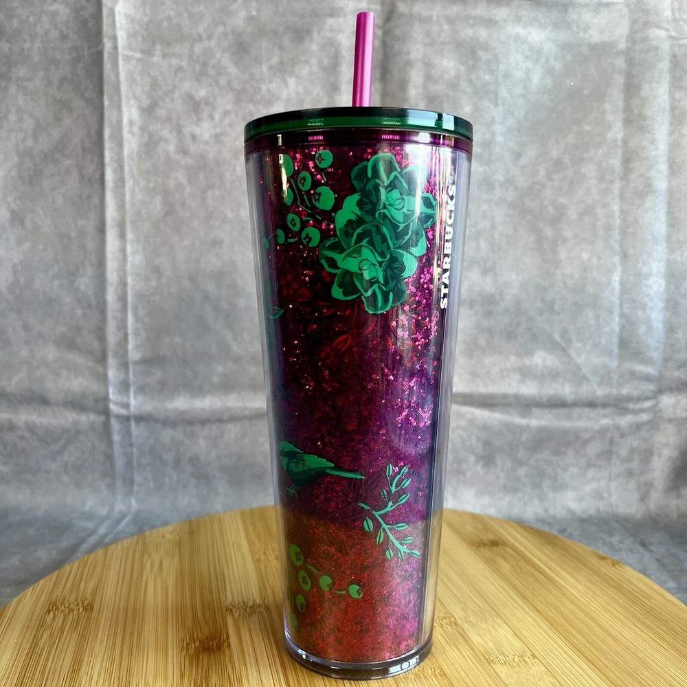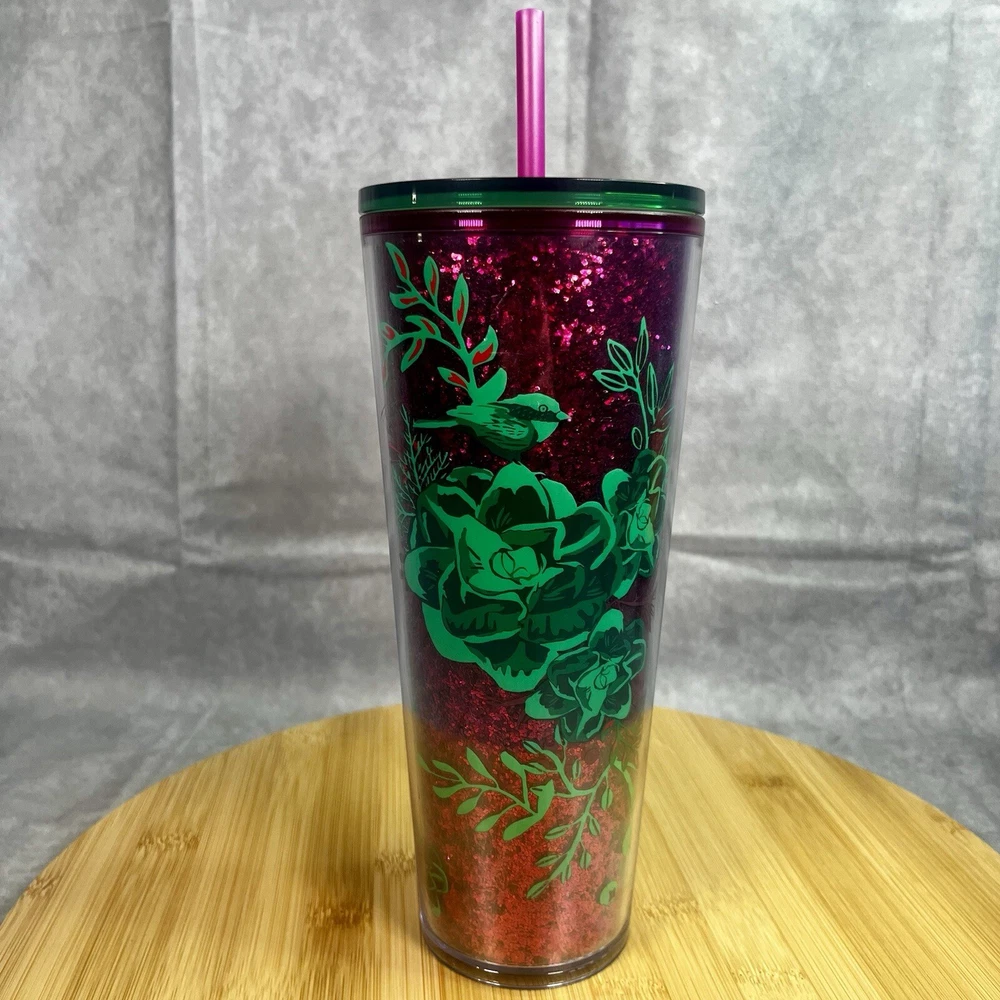 Starbucks Winter Holiday Tumbler Cold Cup 24 oz - Glitter w/ Green Flowers This Starbucks Winter Holiday Tumbler Cold Cup 24 oz is the perfect addition to your collection of coffee and tea accessories. The cup features a glittery design with green flowers, making it a festive and eye-catching piece. It is an original Starbucks product, manufactured in China, and is ideal for enjoying your favorite cold beverage during the holiday season. The cup is labeled as a 24 oz and is perfect for collectors or as a gift for a coffee and tea enthusiast.