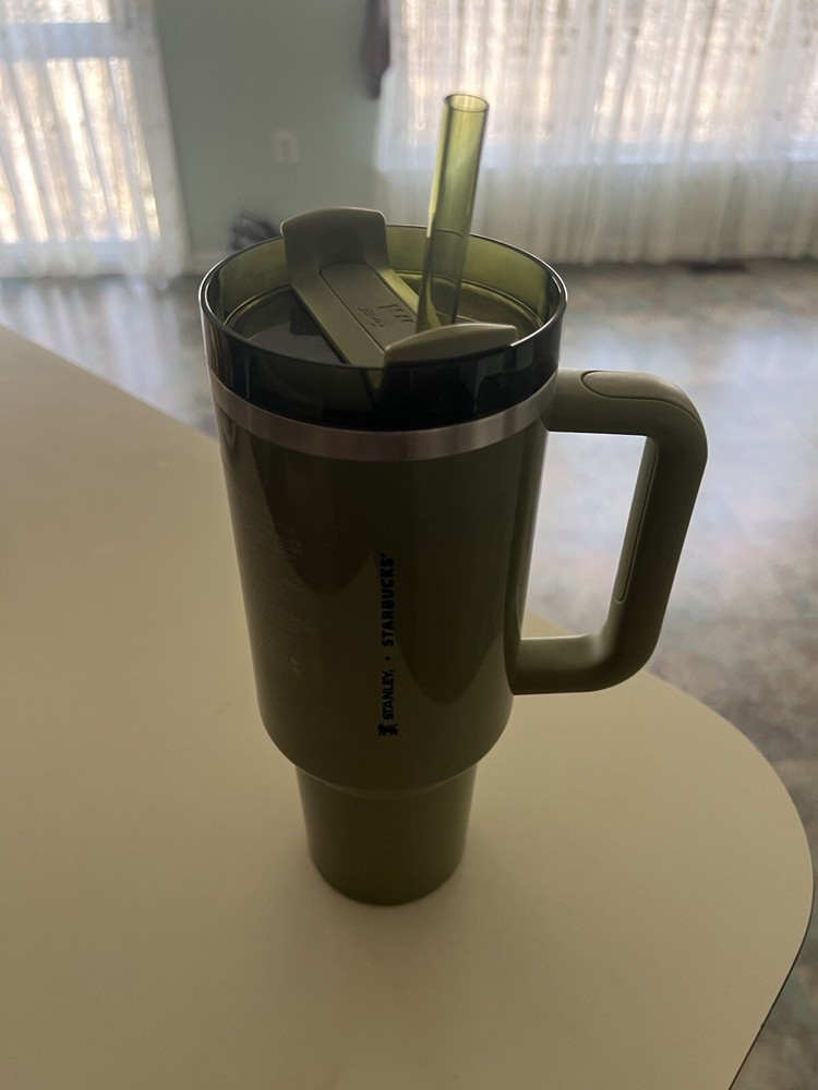 This product is a Starbucks x Stanley Olive Green 40 oz Quencher Tumbler. It features the Starbucks brand, a green color, and a theme related to coffee and tea. The tumbler is likely a collectible item with a large capacity, perfect for keeping beverages cold or hot on the go.