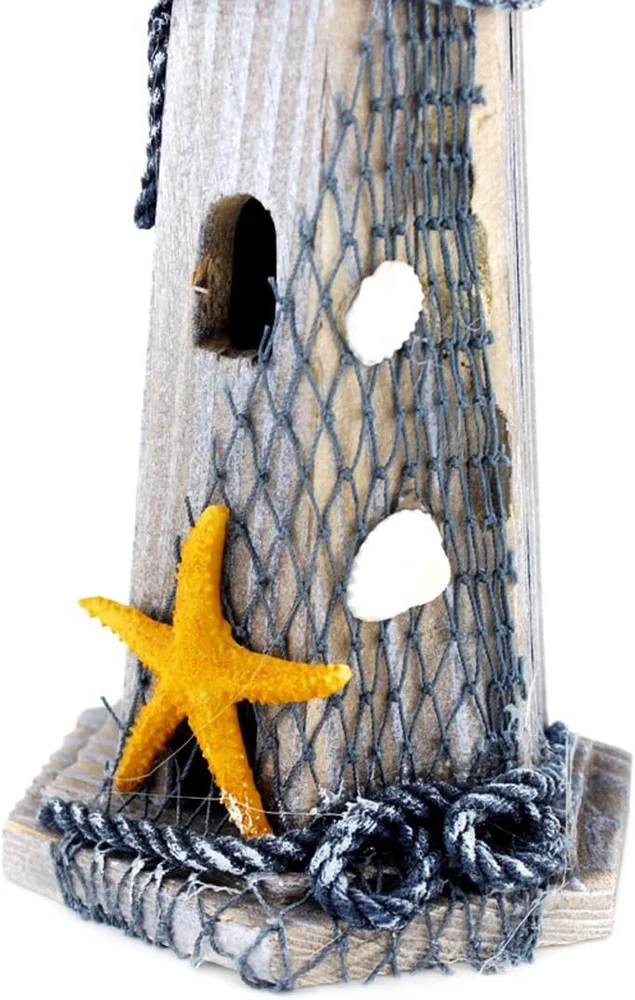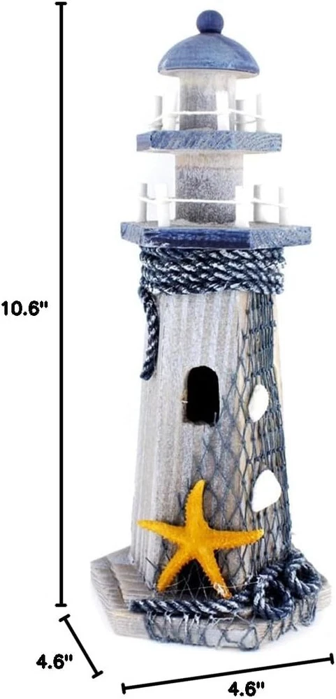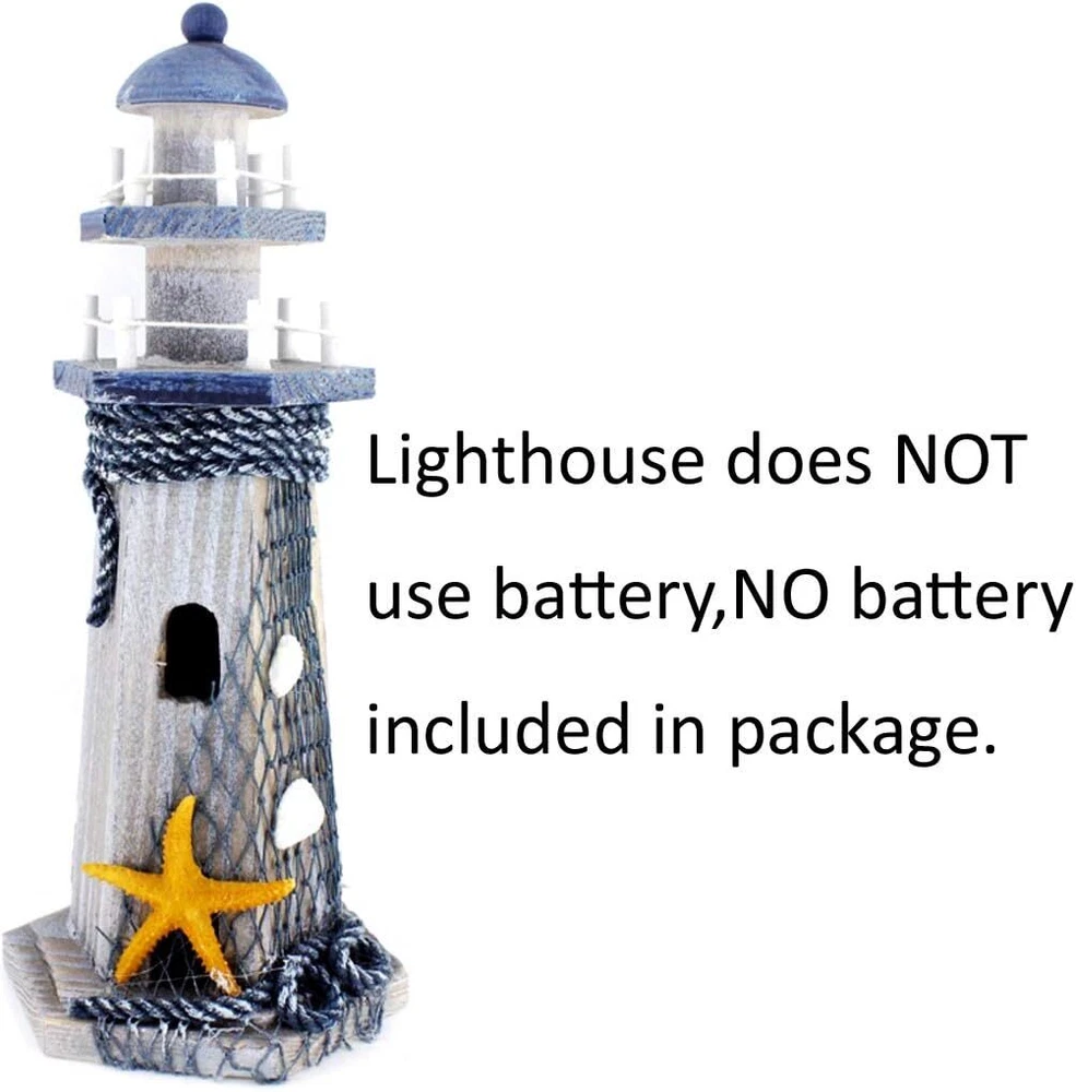 Starfish Wooden Lighthouse 10.6" High Nautical Themed Rooms Multicolor Product Details Color: Multicolor Brand: Chaomian Home Ornaments Theme: Holidays, Architectural, Home Decor, Nature And Outdoors Material: Wood Style: Vintage Occasion: Wedding, Christmas, Housewarming, Thanksgiving Product Dimensions: 4.6"D x 4.6"W x 10.6"H Recommended Uses For Product: Table, Outdoor, Home Mounting Type: Tabletop Cartoon Character: starfish Finish Type: Wood Special Feature: Handmade Product Care Instructions: Wipe Clean Collection Name: All Seasons: All Seasons Number of Items: 1 Item Weight: 9.9 ounces Manufacturer: homesweeter Item model number: B01GZAB5IE Is Discontinued By Manufacturer: No NO battery needed.Perfect gift for kids room decoration to create a nautical world Seashell,conch & fishing net adorn the lighthouse Great decoration for your home or shop,office and more It measures 10.6" in height and the diameter of the beacon bottom is 4.6" This is a handmade and decorated wooden lighthouse with NO battery included. It has no lights and it measures 10.6" in height and the diameter of the beacon bottom is 4.6",please find a ruler to get how big it is,it's NOT A SMALL ONE. It's a great ornament for your home or office,and more.