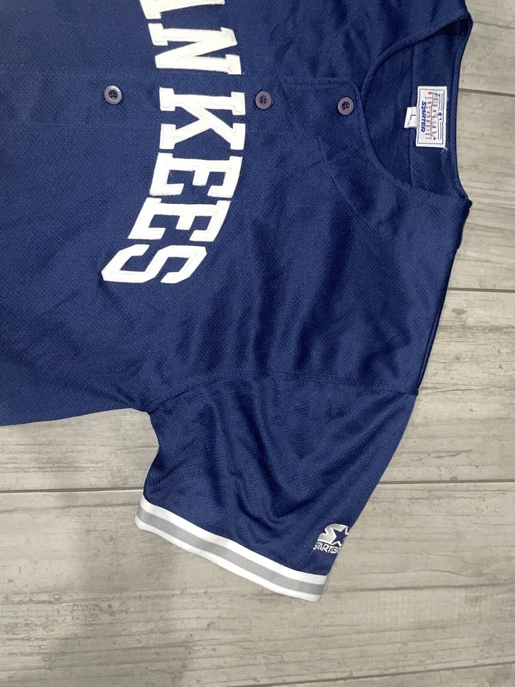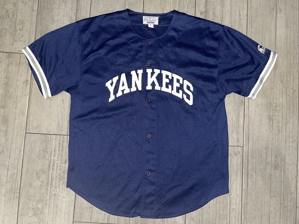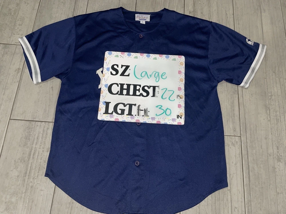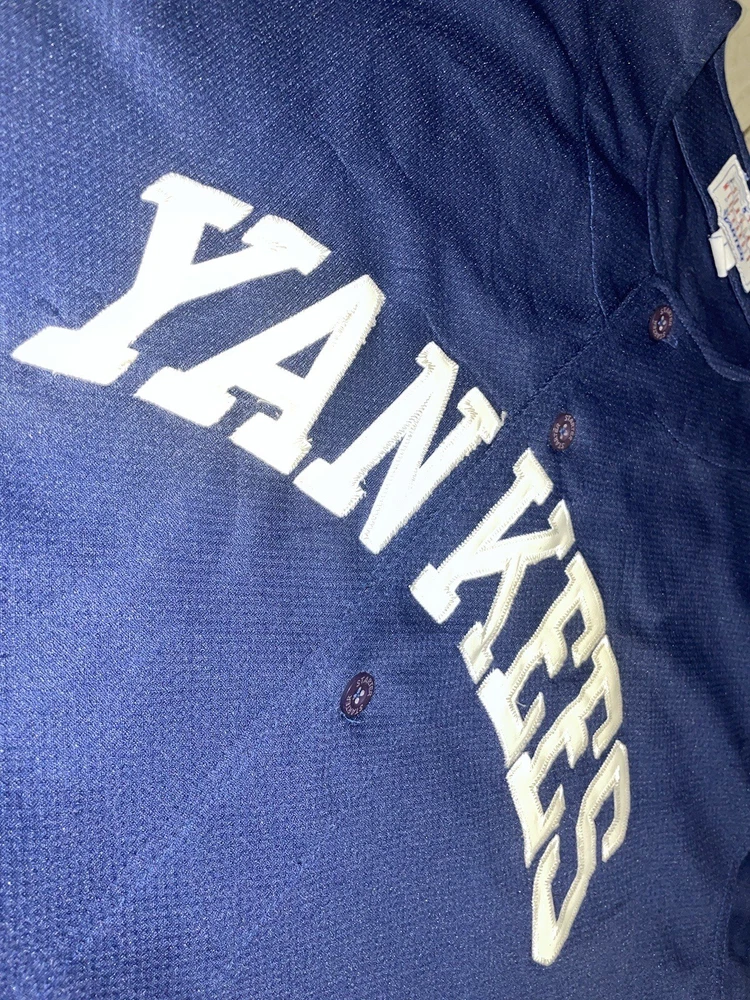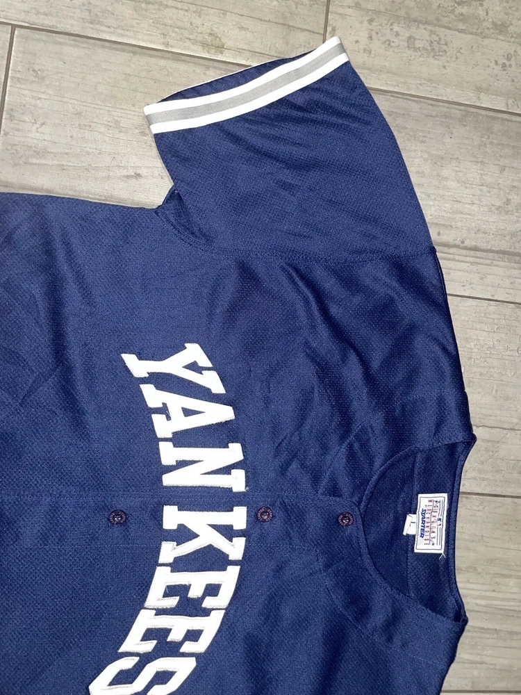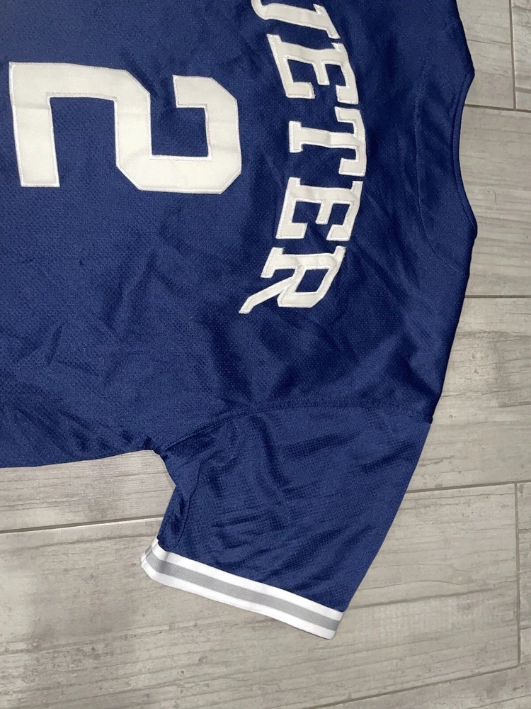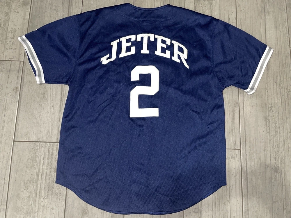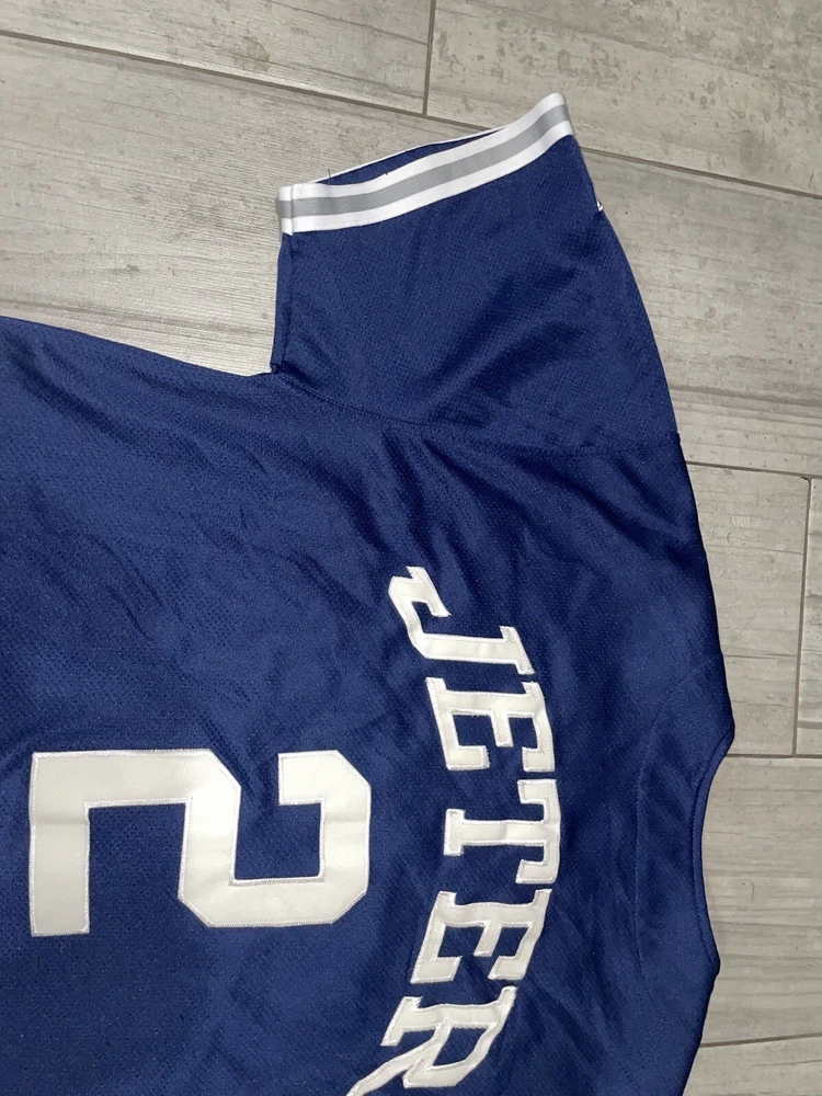 Get your hands on this pre-owned, stitched Derek Jeter #2 New York Yankees jersey in size large. Perfect for any baseball fan, this jersey is a great addition to your collection. Show off your team spirit and love for the game with this high-quality, major league baseball (MLB) jersey. The blue color and Yankees team logo make it a must-have for any true fan. This jersey is made for men and is ideal for casual wear or game day. Don't miss out on the chance to own a piece of sports history.