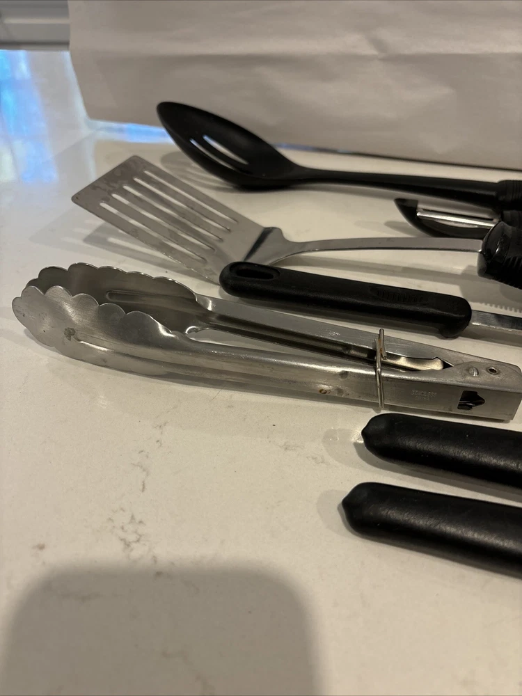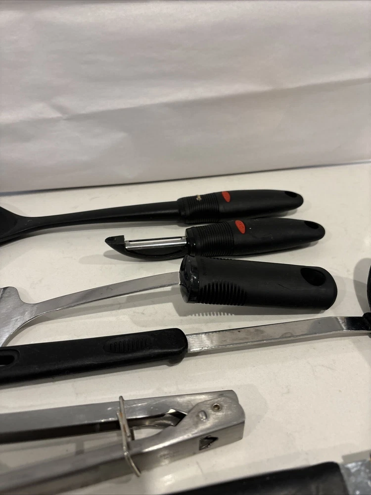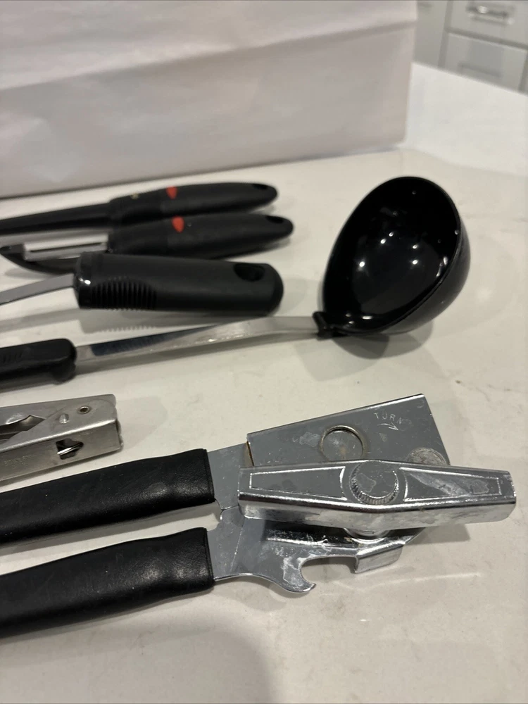 This starter kitchen utensil lot includes a variety of tools that will come in handy for any home cook. The set includes a ladle, cooking spoon, vegetable peeler, spatula, and tongs, all of which are made with durable rubber handles. These utensils are perfect for cooking and serving food, and they are sure to become staples in your kitchen. The set features tongs from Oxo, a trusted brand in the kitchen industry, as well as other useful tools like a ladle and a can opener. Whether you are a seasoned cook or just starting out, this set of kitchen utensils is a great addition to your collection.
