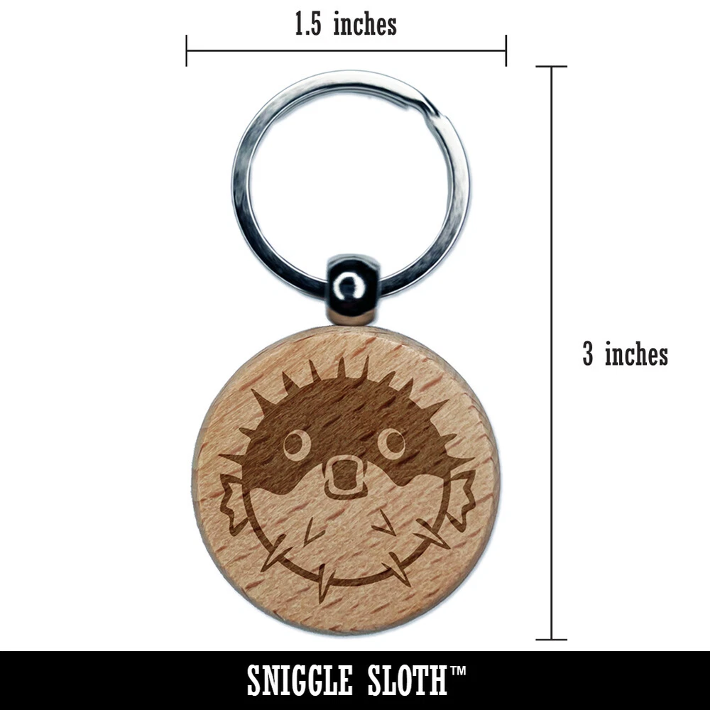 Startled Puffer Fish Engraved Wood Round Keychain Tag Charm