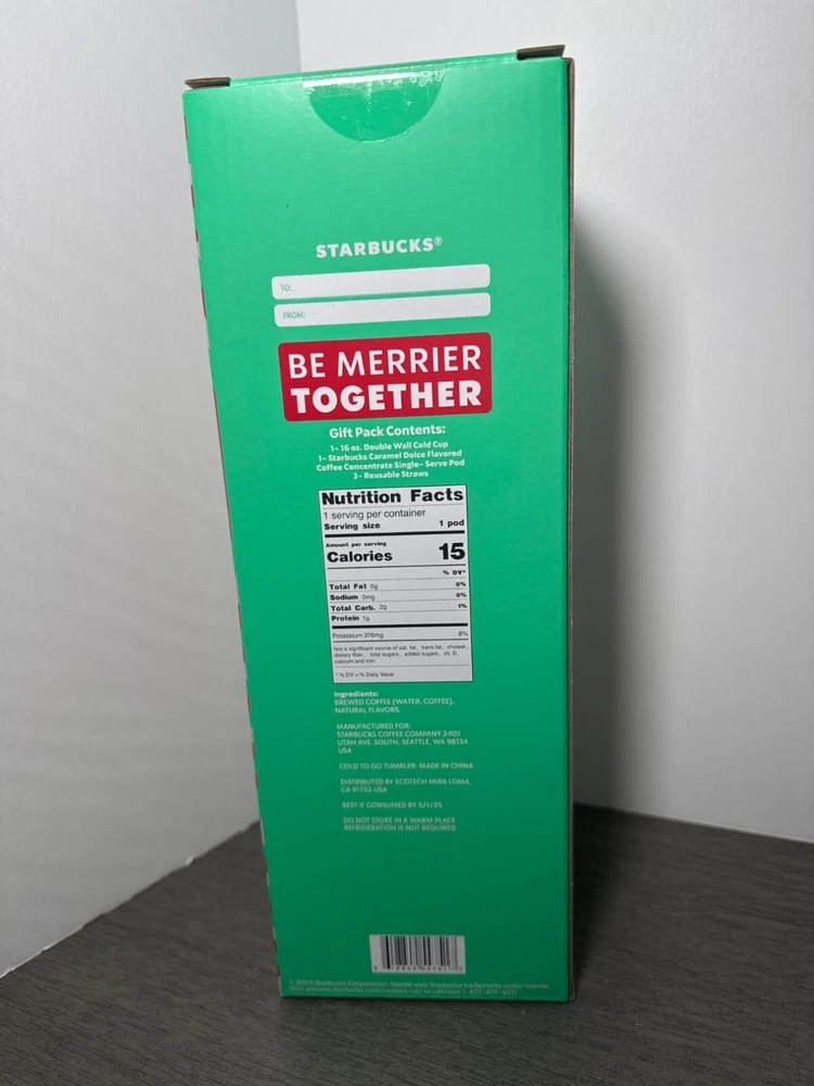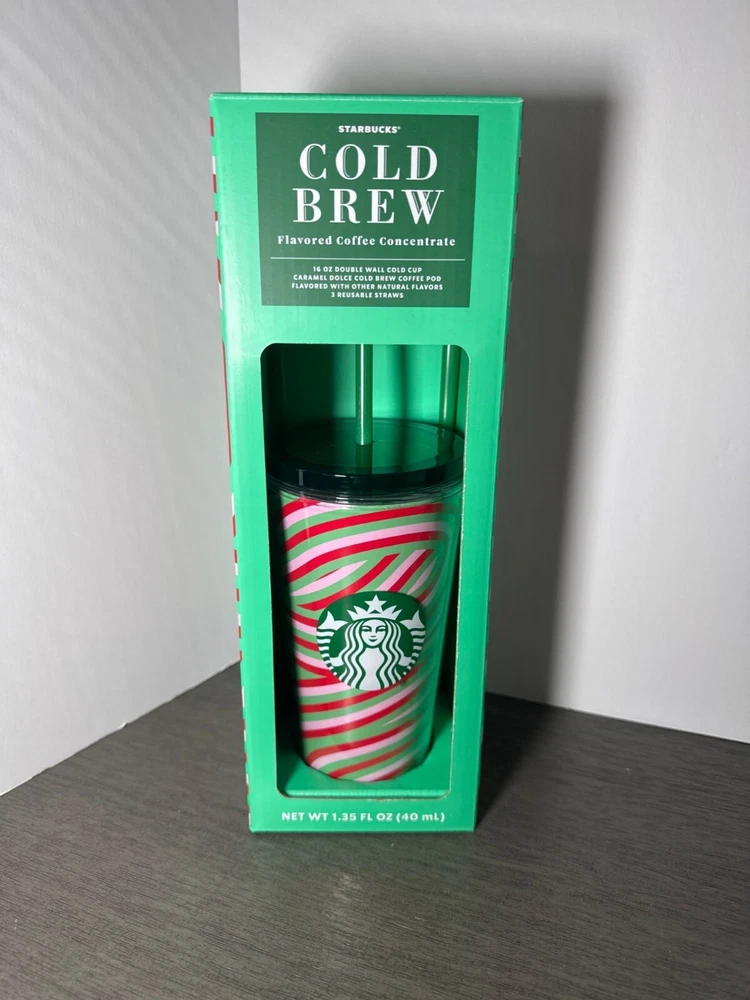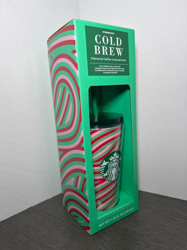 Starbucks Cold Brew 16 oz Double wall cold cup Carmel dolce cold brew coffee pod 3 reusable straws Pink/red/green cup with green straw Condition: New