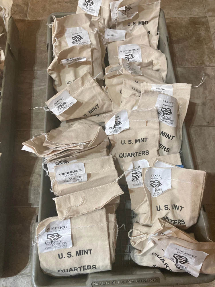 You are purchasing a complete set of original mint sewn bags of 100 bags of 100 Quarters ($25 face value) each Statehood Quarters in uncirculated mint condition; never opened. This sale is for 2 bags from each state (1 P mint and 1 D mint bag). Each of the bags has 100 quarters (each $25 face value). All 50 states included: Alabama, Alaska, Arizona, Arkansas, California, Colorado, Connecticut, Delaware, Florida, Georgia, Hawaii, Idaho, Illinois, Indiana, Iowa, Kansas, Kentucky, Louisiana, Maine, Maryland, Massachusetts, Michigan, Minnesota, Mississippi, Missouri, Montana, Nebraska, Nevada, New Mexico, New Hampshire, New Jersey, New York, North Carolina, North Dakota, Ohio, Oklahoma, Oregon, Pennsylvania, Rhode Island, South Carolina, South Dakota, Tennessee, Texas, Utah, Vermont, Virginia, Washington, West Virginia, Wisconsin, Wyoming. Two mint sealed bags from each state, 1 P mint and 1 D mint. All are in uncirculated condition direct from the US mints in Denver and Philadelphia. (100 bags total) Shipping will be in four medium priority flat rate boxes. Shipping charge is included in the item price. No extra charge for shipping. A lot of time and financial investment went into assembling this seldom offered set.