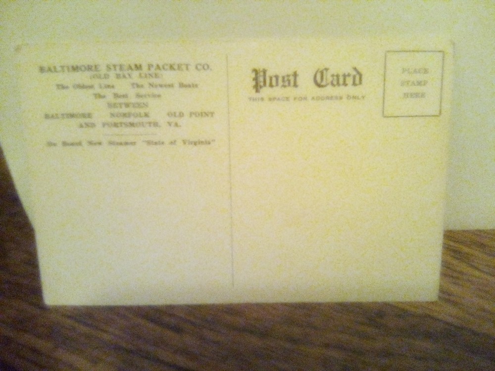 The product is a vintage postcard featuring the State of Virginia Steamer Old Bay Line operated by the Baltimore Steam Packet. The postcard captures the historic boats and ships, reflecting the era of the early 20th century. Made of paper, this original postcard from North America showcases the unique charm of Virginia and its cities, making it a one-of-a-kind collectible for postcard enthusiasts.