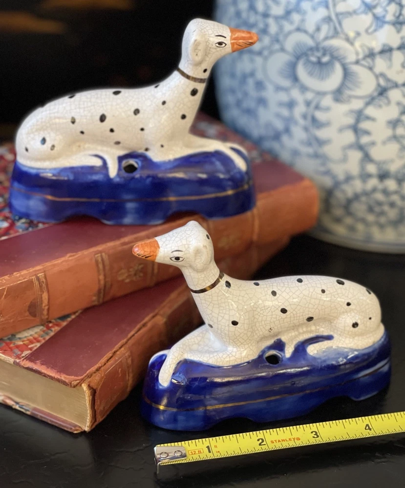 Timeless 19C Antique Original English Porcelain Staffordshire Dalmatian Mantle Dog Ink Well Pair • Height 4” • Length 5.25” • Width 2” This rare gallery quality pair of original 19C antique petite English Staffordshire porcelain dalmatian mantle table dogs is hand painted with spotted coats, burnished gilt collar and cobalt bases on which each figure is seated in semi-recumbent formal pose. Highly desirable and scarce with tan snouts, these elegant period examples will bring a touch of the English countryside to any setting in which they are placed whether paired on their own as a focal point or grouped as part of a collection or arrangement. Condition excellent. Rarely found intact surviving models. Minimal expected age related wear. Display ready.