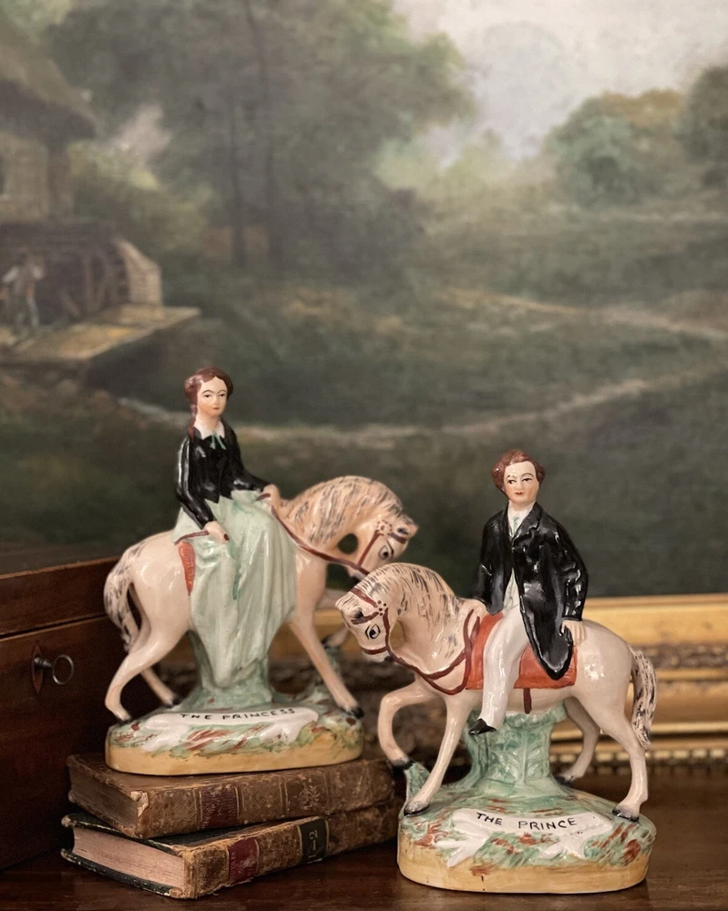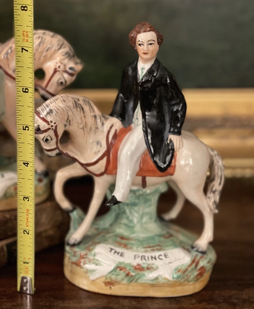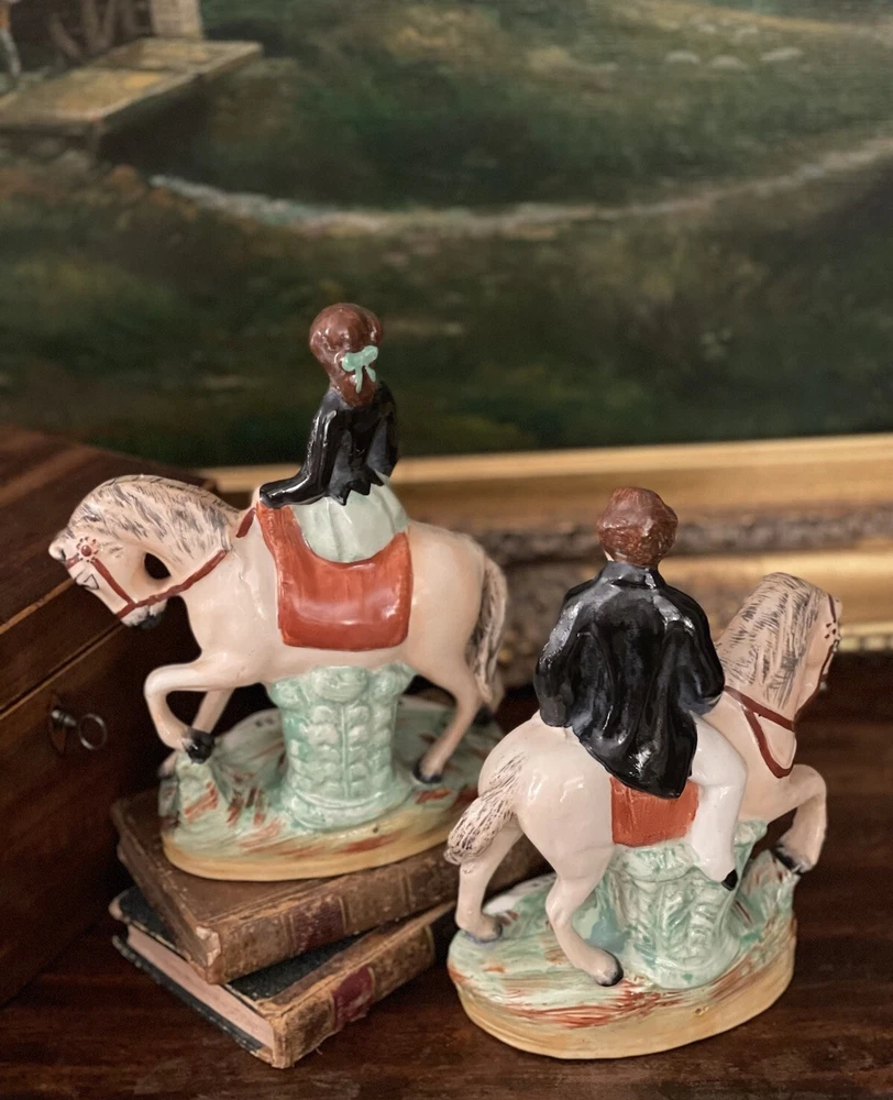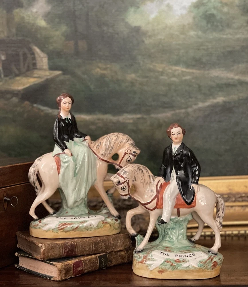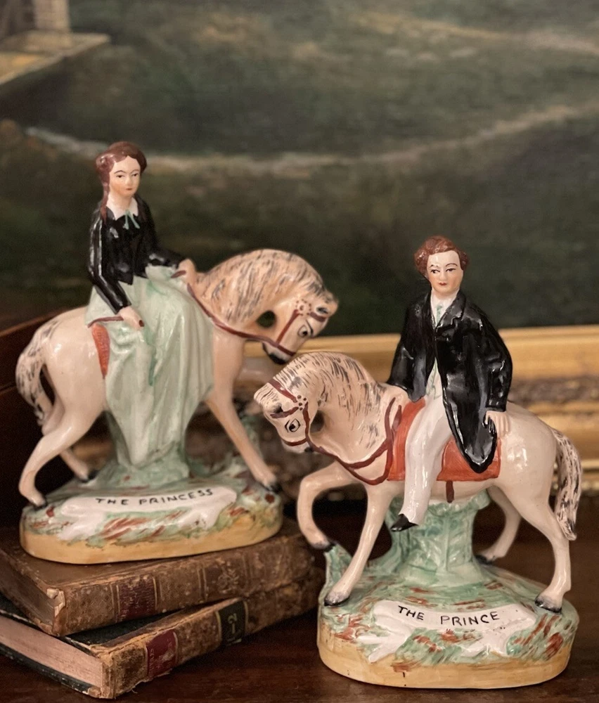 Stunning Rare Antique English Staffordshire Equestrian Mantle Flatback Pair Depicting Elegant Noble Prince and Princess on Horseback β’ Rare Gallery Quality Equestrian Figures β’ Height 7.5β I am delighted to offer this lovely pair of timeless equestrian themed mantle flatbacks featuring elegant right and left facing horses carrying prince and princess (Victoria and Albert) dressed in beautiful riding clothes in classic form from Staffordshire, England. This marvelous statement pair of noble equestrian figures will make elegant showpieces when placed on their own or as a stunning addition to a collection or arrangement. Excellent condition. Marvelous surviving period examples to own and treasure. Turn of century marks to bases. Happy Bidding!! Height 7.5β