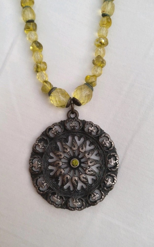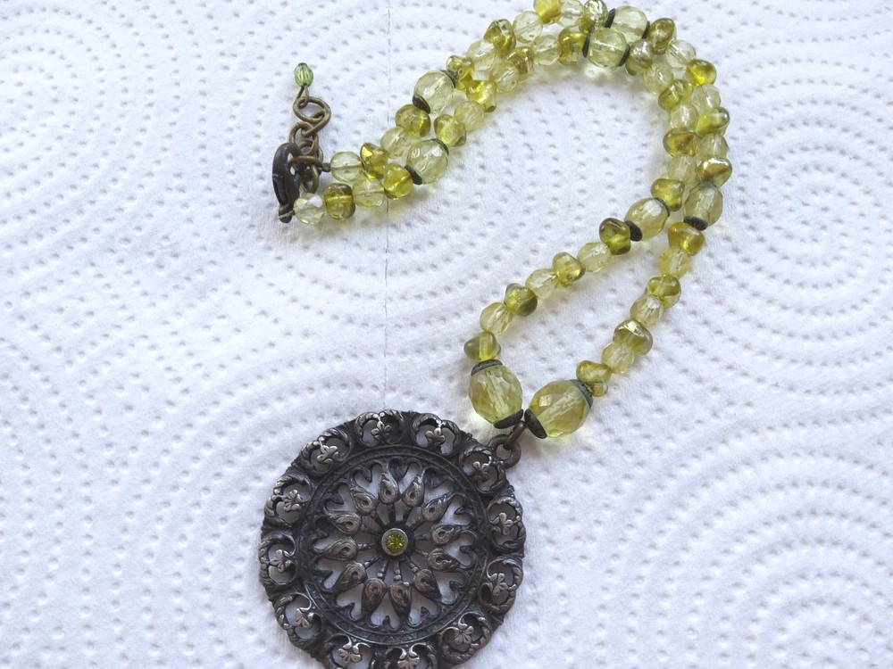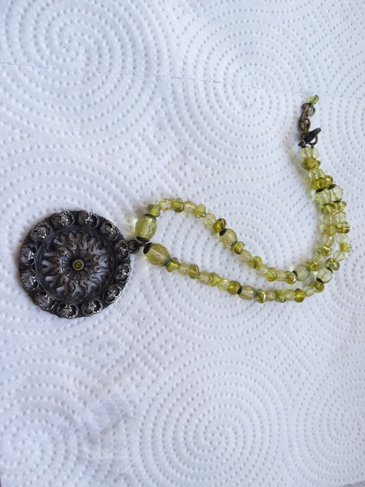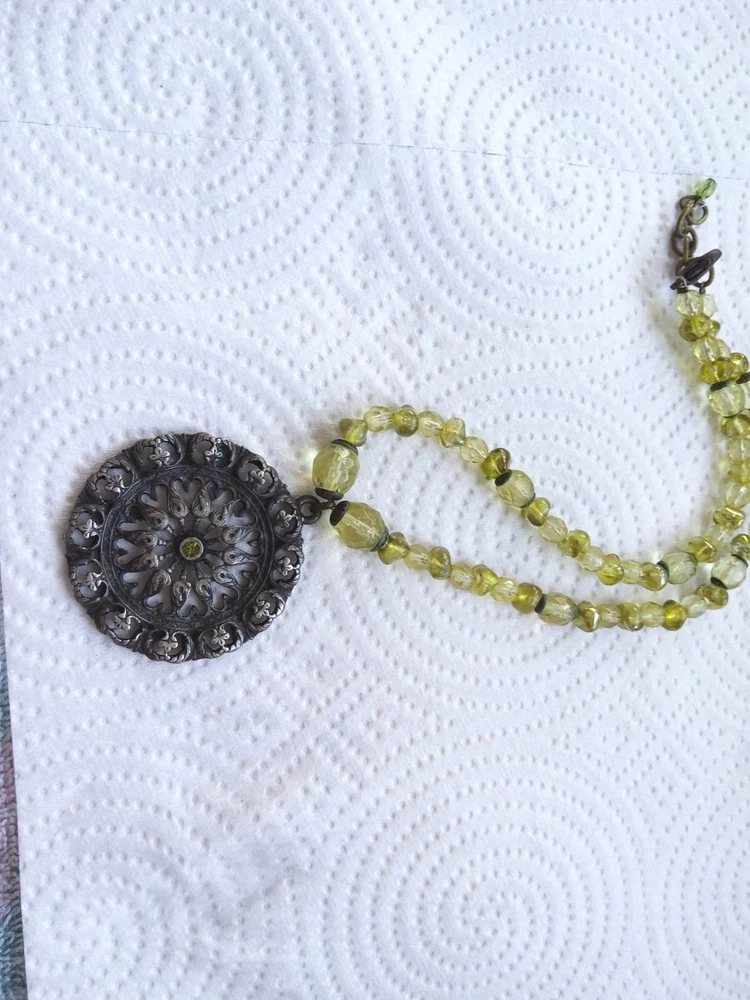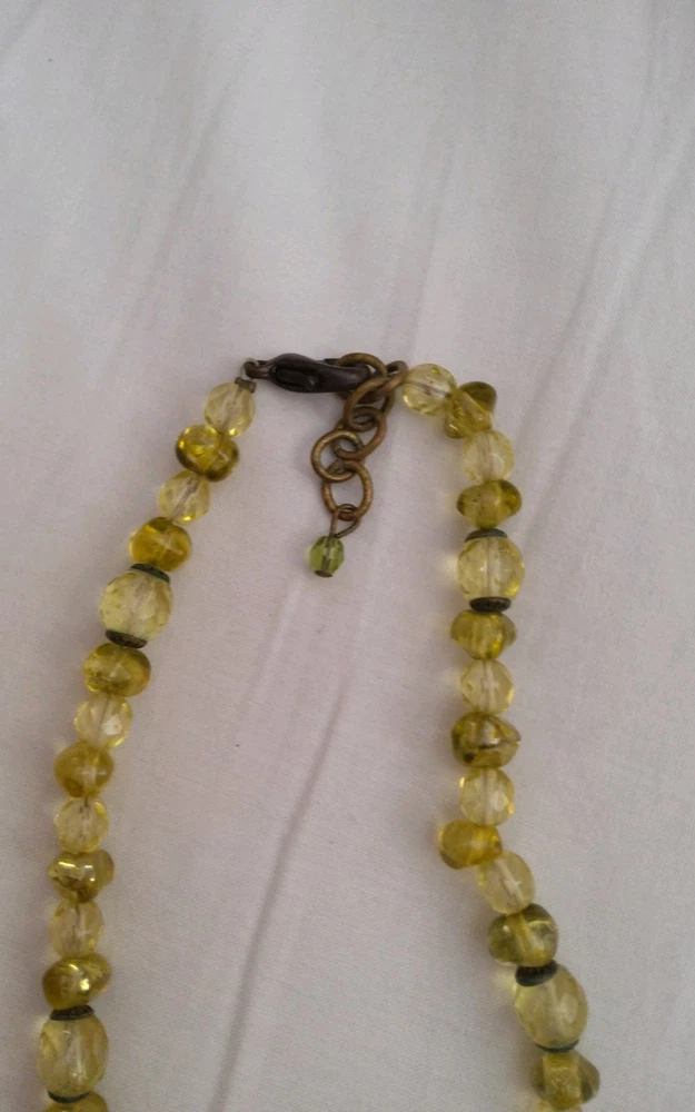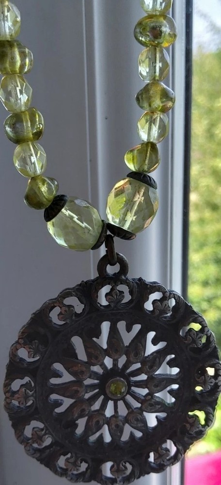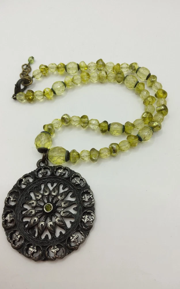 Cool Medallion Choker Style luminous translucent green beaded necklace. Very good condition. Skillfully made. Top of the M and S range when l bought it mid 2000s. Worn only a couple of times. Please examine the accompanying photos carefully when making your purchasing decision. Sold as Seen. No Returns. UK Sales Only.