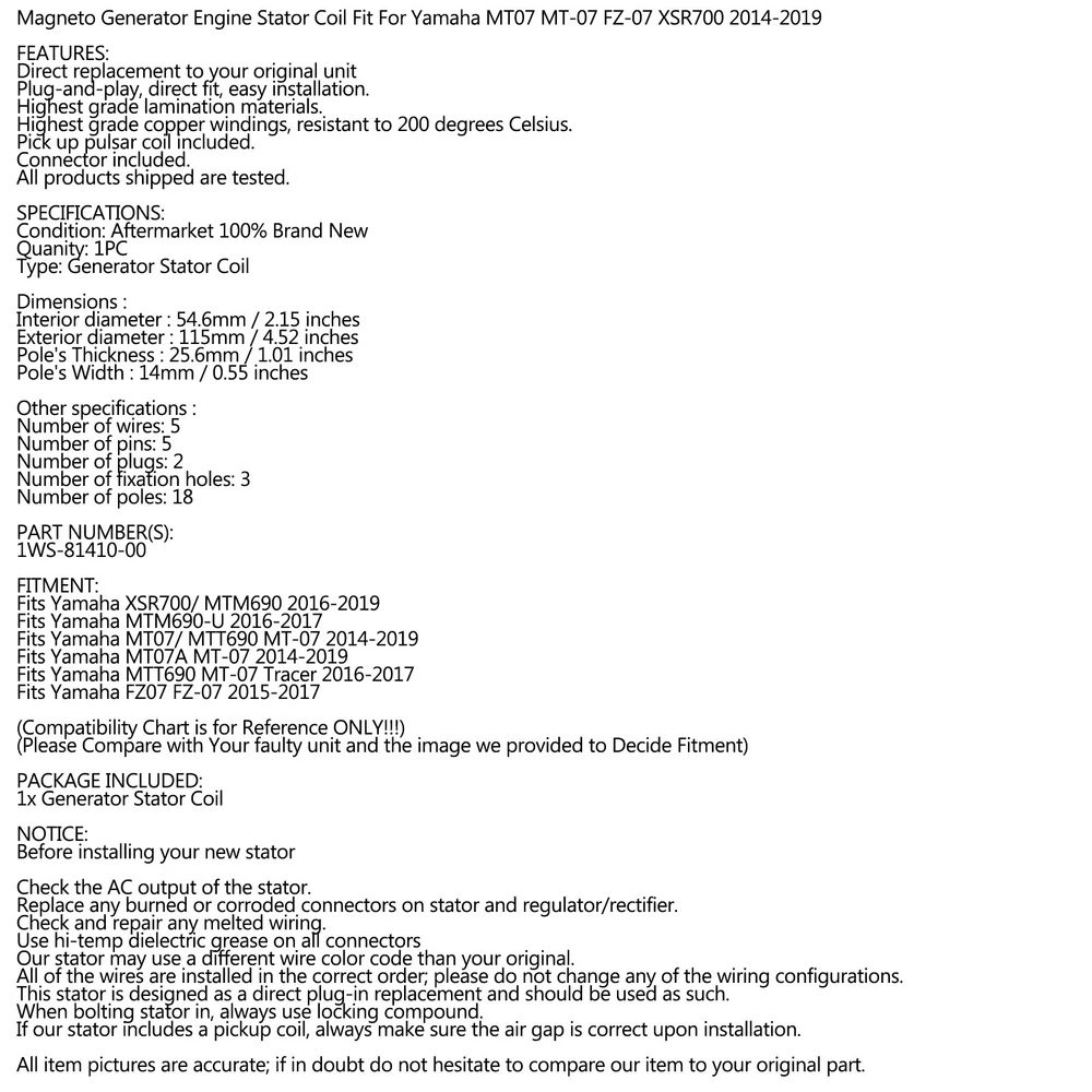 🔥Hot Sale Items On Sale Ignition Stator Generator with Gasket For Suzuki DRZ125 DR-Z 125L 125 2003-2024 59.57 USD 66.19 USD Free shipping 10% off STATOR GENERATOR + VOLTAGE REGULATOR + GASKET FOR BMW F650GS / Dakar 1999-2007 99.53 USD 110.59 USD Free shipping 10% off Magneto Stator+Voltage Rectifier+Gasket For Yamaha WR450F WR 450 F 2012-2015 89.54 USD 99.49 USD Free shipping 10% off Generator Stator Coil 5LV-81410-00 For Yamaha FZS1 FZS1000 FAZER 2001-2005 US 62.57 USD 69.52 USD Free shipping 10% off Alternator Stator Regulator w/ Gasket For Honda CRF 230 L / CRF 230 M 2008-09 F1 79.55 USD 88.39 USD Free shipping 10% off STATOR + REGULATOR RECTIFIER + GASKET FOR KAWASAKI KX250F KX 250F 2011 2012 82.63 USD Free shipping Generator Stator For Kawasaki ER-6 ER-6N ER650 12-2017 Versys KLE 650 17-2023 35.63 USD Free shipping Alternator Stator + Generator Gasket Cover For Honda CRf450r 2004 31120-MEN-003- 69.56 USD 77.29 USD Free shipping 10% off STATOR GENERATOR W/PICK UP FOR MOTO GUZZI V85 TT 850 2021 2022 2023 1A016500 39.63 USD Free shipping Stator Generator For Yamaha YZF R1 04-08 FZ1 FZS1 06-15 FZ8 FZ8N FZ8S 11-13 NEW 23.63 USD Free shipping Regulator Rectifier Magneto Stator Gasket For Kawasaki Z 550 GT550 1983-1994 62.63 USD Free shipping Regulator Magneto Stator Coil Gasket For Suzuki VL 1500 Intruder C1500 05-09 V1 119.63 USD Free shipping SAFE & SECURE SHOPPING 100% SATISFACTION GUARANTEED FAST SHIPPING Store Categories Store Categories Other 🔥US Hot Sale Fairings🏍️ ★US HOT SALE★ ★NEW ARRIVAL★ OTHER MOTO PARTS Stator Generator For Yamaha FZ07 MT-07 Tracer XSR 700 YZF-R7 XTZ 700 2014-2024 Product Description Generator Stator Fit for Yamaha FZ-07 MT-07 MT07 Tracer XSR 700 YZF-R7 XTZ 700 Tenere 2014-2024 Features: Direct replacement to your original unit Plug-and-play, direct fit, easy installation. Highest grade lamination materials. Highest grade copper windings, resistant to 200 degrees Celsius. Pick up pulsar coil included. Connector included. Rubber grommet included. All products shipped are tested. Specifications: Condition: Aftermarket 100% Brand New Quanity: 1PC Type: Stator Coil other specifications: Number of wires: 5 Number of plugs: 2 Number of pins: 2 + 3 Number of poles: 18 Dimensions : Interior diameter : 54.6mm / 2.15 inches Exterior diameter : 115mm / 4.52 inches Pole's Thickness : 25.6mm / 1.01 inches Pole's Width : 14mm / 0.55 inches Replacement Part Number: 1WS-81410-00 Fits Make/Model/Year: Fit for Yamaha FZ07 FZ-07 2015-2017 Fit for Yamaha MTM690-U 2016-2017 Fit for Yamaha MT07 MT-07 MTT690 2014-2024 Fit for Yamaha MT-07 Tracer MTT690 2016-2017 Fit for Yamaha MT07A MT-07 ABS 2014-2020 Fit for Yamaha XSR700/ MTM690 2016-2024 Fit for Yamaha Tenere 700 XTZ700 2021-2024 Fit for Yamaha YZF R7 YZF-R7 2022-2024 (Compatibility Chart is for Reference ONLY!!!) (Please Compare with Your faulty unit and the image we provided to Decide Fitments) Package Included: 1x Stator Generator NOTICE: Before installing your new stator Check the AC output of the stator. Replace any burned or corroded connectors on stator and regulator/rectifier. Check and repair any melted wiring. Use hi-temp dielectric grease on all connectors Our stator may use a different wire color code than your original. All of the wires are installed in the correct order; please do not change any of the wiring configurations. This stator is designed as a direct plug-in replacement and should be used as such. When bolting stator in, always use locking compound. If our stator includes a pickup coil, always make sure the air gap is correct upon installation. All item pictures are accurate; if in doubt do not hesitate to compare our item to your original part. Battery condition is important. No stator can make up for a bad or weak battery. If in doubt charge your battery and have it load tested, or simply replace it. ALWAYS START WITH A FULLY CHARGED BATTERY ! The product on offer is an accessory or spare part and thus is not an original product of the vehicle manufacturer. The name of the vehicle manufacturer is stated only as an indication of the determination of the product being offered as an accessory or spare part, to clarify, for which vehicle the product on offer fits. ⭐ ️ MUST-READ FITMENT INFO • This part fits vehicles listed in the description and compatibility chart ONLY • Critical checks before purchase: ✔ Compare OEM# on your original part ✔ Match mounting hole patterns in photos ✔ Verify electrical connector types (if applicable) ✅ Free fitment confirmation: Send Your specs + VIN + OEM Number + clear photos of your current part! Shipping Returns Warranty Feedback About us Shipping ✔ Order Processing: Ships within 3 business day (Mon-Fri, excludes holidays). ✔ Delivery Time: 3-7 business days (continental U.S.). ✔ International Shipping: Available to 50+ countries (calculated at checkout). Customs/duties may apply for international orders. ✔ Tracking Info: Provided automatically via eBay. ✔ All orders will be shipped through USPS, UPS and Fedex depends on the weight of the items. ✔ Shipping notification will be emailed to you once package has been shipped ✅Fast & Reliable Shipping – Your order is our priority! ✅We package all items with care to ensure safe arrival! Returns We offer 60-day free returns for your peace of mind. To qualify for a full refund: Contact Us First: Please message us through eBay Messages before opening a return request - we'll work with you to resolve any issues promptly. For a faster resolution, please contact us first to discuss your return request. If the return is due to change of mind, select "Didn't like item" or "Ordered by mistake". For tem not as described, provide details and photos to help us assist you promptly. Inspection Process: All returns are inspected upon arrival. We reserve the right to refuse refunds if: ❌Item shows signs of use/wear ❌Return doesn't match the original product condition:missing/damaged How