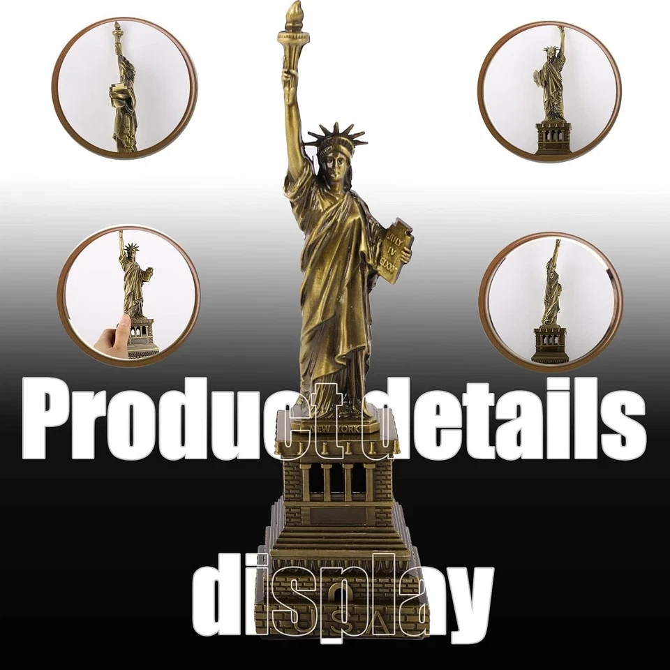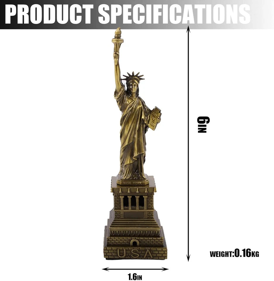 Statue of Liberty America 6 Inches Metal Model Souvenir Home Decor Gift Copper Tint for Friends,New York City Party Supplies (15 cm) 1.【Home Decoration】: The Statue of Liberty ornament is the best choice for home decoration. Perfect for countertops, shelves, bedside tables, gardens, gazebos and more in all homes. It creates a sense of tranquility and peace, one feels calm and peaceful when one sees the noble goddess. 2.【Memorial Value】:The new york souvenirs have a very good commemorative value. It is a symbol of the friendship between the United States of America and the people of the United States and France. It always expresses the lofty ideals of the American people for democracy and freedom. 3.【Product Detail】: Our mini statue of liberty is made of zinc alloy, and the whole body is brass. The overall lines are clear and smooth, and the hand feel is excellent. The Statue of Liberty's facial expressions are vivid and elegant, and the crown and torch are clearly depicted. 4.【Dimensions】: Each home ornament statue measures 6 inches tall. Exquisite packaging, suitable for gifting to friends. The perfect size to fit any table, bookshelf or countertop Shipping We offer FREE shipping on all orders! We ship within Three business days of payment, usually sooner. We use a selection of shipping services such as UPS, FedEx, USPS etc. We only ship to the lower 48 states, no APO/FPO addresses or PO Boxes allowed. Local pickups and combined shipping options are not provided at this time. Return You can return a product for up to 30 days from the date you purchased it. Any product you return must be in the same condition you received it and in the original packaging. Please keep the receipt. Payment We accept payment by any of the following methods: PayPal Please pay as soon as possible after winning an auction, as that will allow us to post your item to you sooner! Feedback Customer satisfaction is very important to us. If you have any problem with your order, please contact us and we will do our best to make you satisfied. Contact Us If you have any queries, please contact us via ebay. We usually respond within 24 hours on weekdays. Please visit our eBay store to check out other items for sale! Thank you for shopping at our store.