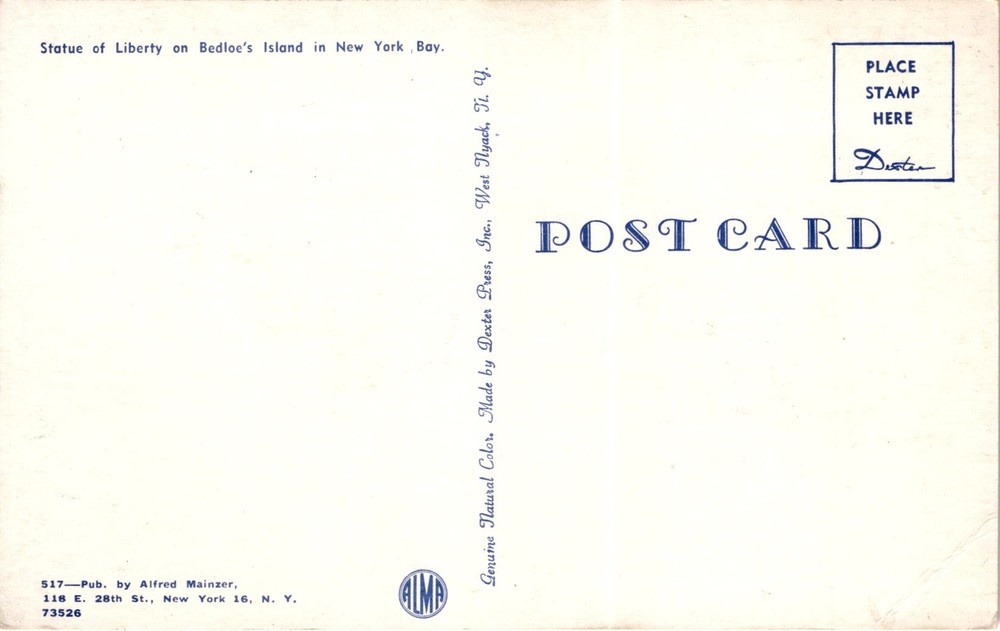 MAKE AN OFFER. THE MORE YOU BUY THE BETTER DEAL I WILL ACCEPT The front of the postcard features a depiction of the Statue of Liberty on Bedloe's Island in New York Bay. The statue is an iconic symbol of freedom and democracy in the United States. Bedloe's Island was renamed Liberty Island in 1956 in honor of the statue.