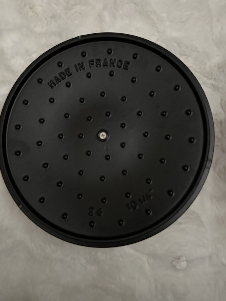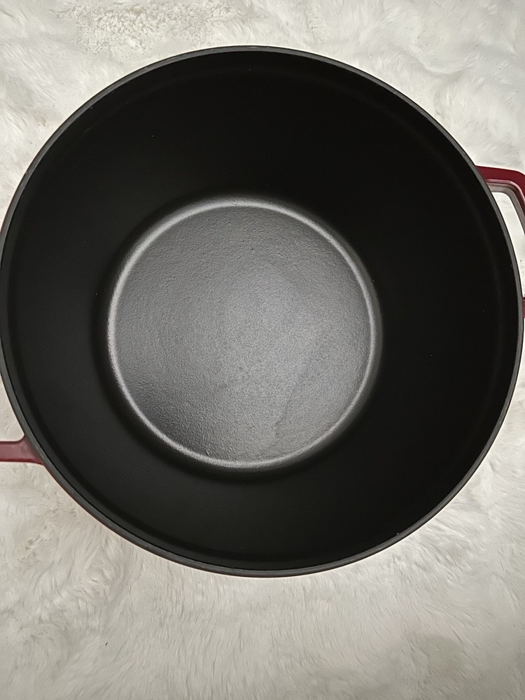 Very good conditions made 26 France 10 1/4 The Staub Enameled Cast Iron Dutch Oven 5.1 QT / 4.9 L in Cherry is a high-quality and durable cookware piece perfect for traditional Dutch cooking. Made from cast iron, this Dutch oven retains heat well and is suitable for a variety of cooking techniques. The rich cherry enamel adds a touch of style to your kitchen while the sturdy construction ensures long-lasting use. With a generous size of 5.1 QT / 4.9 L, this Dutch oven is ideal for creating large batches of soups, stews, and other Dutch oven dishes with ease.