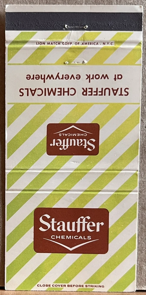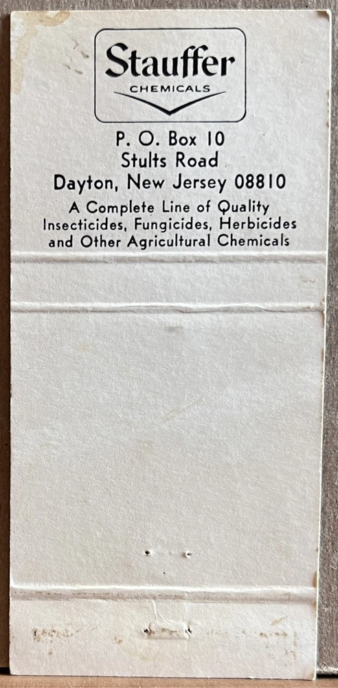 Vintage front-strike matchbook cover advertising for the Stauffer Chemicals, Dayton, NJ New Jersey. Measures approximately 2.00" x 4.50". Matchbook is in good used condition with surface wear, soiling/stains, creases and bumped corners. No matches.