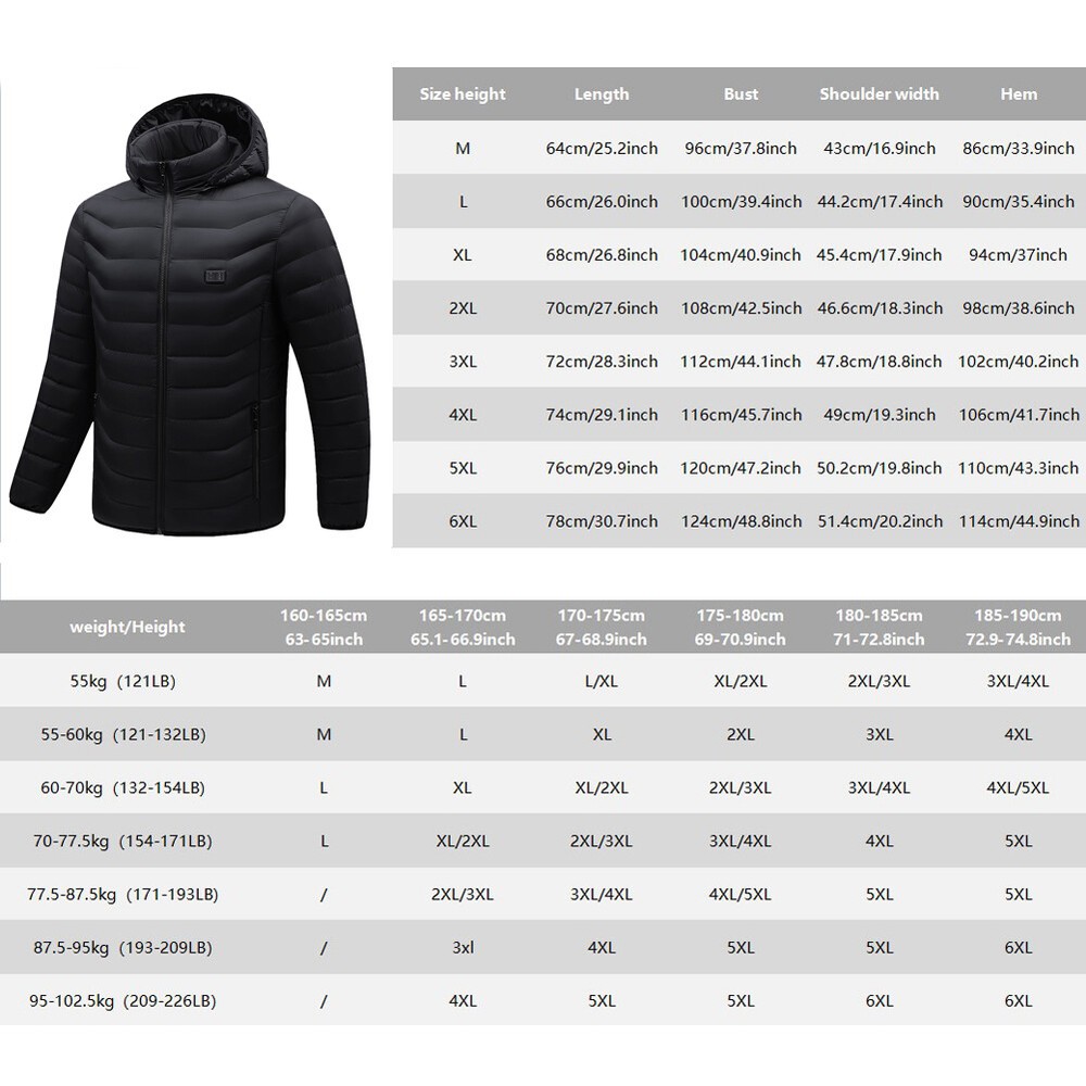 Look , You may also like 23 Heating Zones Heated Vest USB 3Gear Temperature Control Winter Warm Vest 46.09 USD Free shipping Seasonal Sales! Electric Heated Jacket Winter Outwear Warmer Hooded Coat Thermal 17.89 USD Free shipping DIY Coat Heater Smart Jacket Heater Temperature Control Cloth Heating Device 20.13 USD Free shipping 2PCS Reusable Split Raincoat Dust-proof Water-proof Dirt-proof Snow Protection 12.15 USD Free shipping 13 Heated Zones Electric Heating Vest Winter Sleeveless Jacket Body Warmer 25.66 USD Free shipping Men's Heated Vest 23 Zones Electric Heating Coat USB Charge Jacket w/Power Bank 51.24 USD Free shipping Electric Heated Jacket 11 Heating Zones Winter Coat Dual Control Winter Clothing 74.7 USD Free shipping 17 Areas Heating Vest Men Women Heated Jacket Coat 3 Gear Temperature Control 23.09 USD Free shipping 11 Big Heating Zones Unisex Electric Heated Jacket Dual Control Thicken Coat US 24.19 USD Free shipping 9 Areas Adjustable USB Heated Jacket Heating Coat Winter Warmer Thermal Coat 51.86 USD Free shipping 21 Heating Zones Heated Vest USB Powered 3 Gear Temperature Winter Warm Vest 47.6 USD Free shipping Heated Jacket Winter Warm Electric USB Heating Coat Thermal Men Women EU Size 62.55 USD Free shipping Please note that this listing just sell for heating coat,do not include the power bank! please order bigger size to you cart,since the coat is the Asian size so it will be smaller! Please choose more bigger 2 SIZE!!! If you choose the jacket,it only have jacket do not include the powerbank!!! How to choose the your best bust be relaxed when buying clothes? Purchase suggestions: Add 6-8cm to fit type, 8-10cm to fit type, 10-12cm to fit type, and more than 12cm to fit type. We suggest to choose the size of this coat in your actual chest circumference+(10-12) cm Features: *1. It has 15 heating zones: back, neck, shoulders, waist, and abdomen, providing all-rounded warm for your body. *2. Designed with 3 temperature modes for meeting your different needs. *3. USB charging. Connect the 5V 2A mobile power(not included). The 5V far infrared heating is far below the human body safety voltage. Large area carbon fiber wire heater is safe and insulated, ensure safe heating for you. *4. Hand and machine wash. Do not wring. Disconnect and remove the power supply before wash and dry the vest before heating. *5. Thick lining provides strong breathable and warm performance, soft hand touch, warm and comfortable to wear, keeps you warm in cold winter conditions without wearing thick clothes. Description : *1. Size: M/L/XL/XXL/3XL/4XL/5XL Size Length Bust Shoulder Hem(CM/Inch) M 66/25.98 104/40.94 44/17.32 88/34.65 L 68/26.77 108/42.52 45.2/17.8 92/36.22 XL 70/27.56 112/44.09 46.4/18.27 96/37.8 2XL 72/28.35 116/45.67 47.6/18.74 100/39.37 3XL 74/29.13 120/47.24 48.8/19.21 104/40.94 4XL 76/29.92 124/48.82 50/19.69 108/42.52 5XL 78/30.71 128/50.39 51.2/20.16 112/44.09 *2. Material: Lining: Polyester Fabric: Nylon 100% cotton *3. Temperature Adjustment: Warm: 55 ℃ (Red Light) Comfort: 45 ℃ (White Light) Energy Saving: 35 ℃ (Blue Light) Instructions: *1. Take out the USB plug. *2. Connect the mobile charging power source. *3. Press and hold the chest temperature control output switch for 3 seconds. *4. Long press the chest temperature control switch for 3 seconds, start to warm up and then adjust to the medium temperature heat, you need to always connect the mobile power. *5. Manual adjustment to the third gear, warm temperature of 45 degrees Celsius, comfortable gear temperature of 35 degrees Celsius, energy-saving gear temperature of 25 degrees Celsius. *6. Press and hold the chest temperature control switch for 3 seconds, and turn off the light to stop heating. Washing Tips: - Machine wash & hand wash are available. Do not wring or twists. - Unplug the powers before washing and make sure it is dried before heating. Package List: 1* Heated Jacket(not include power bank)