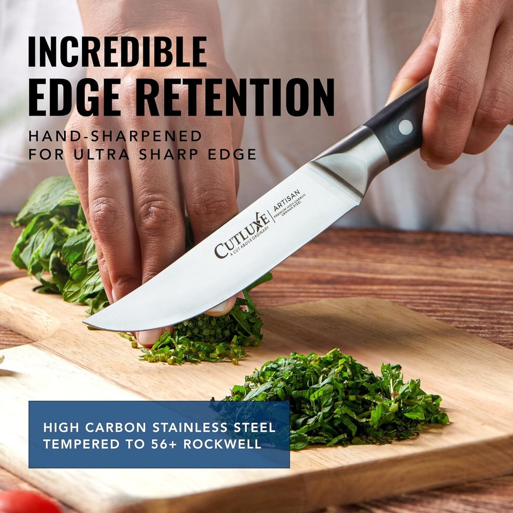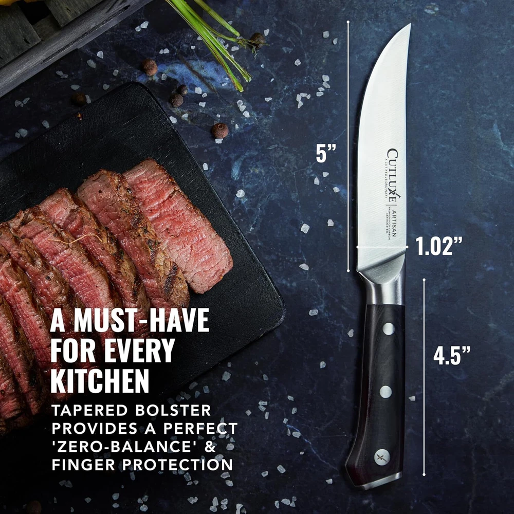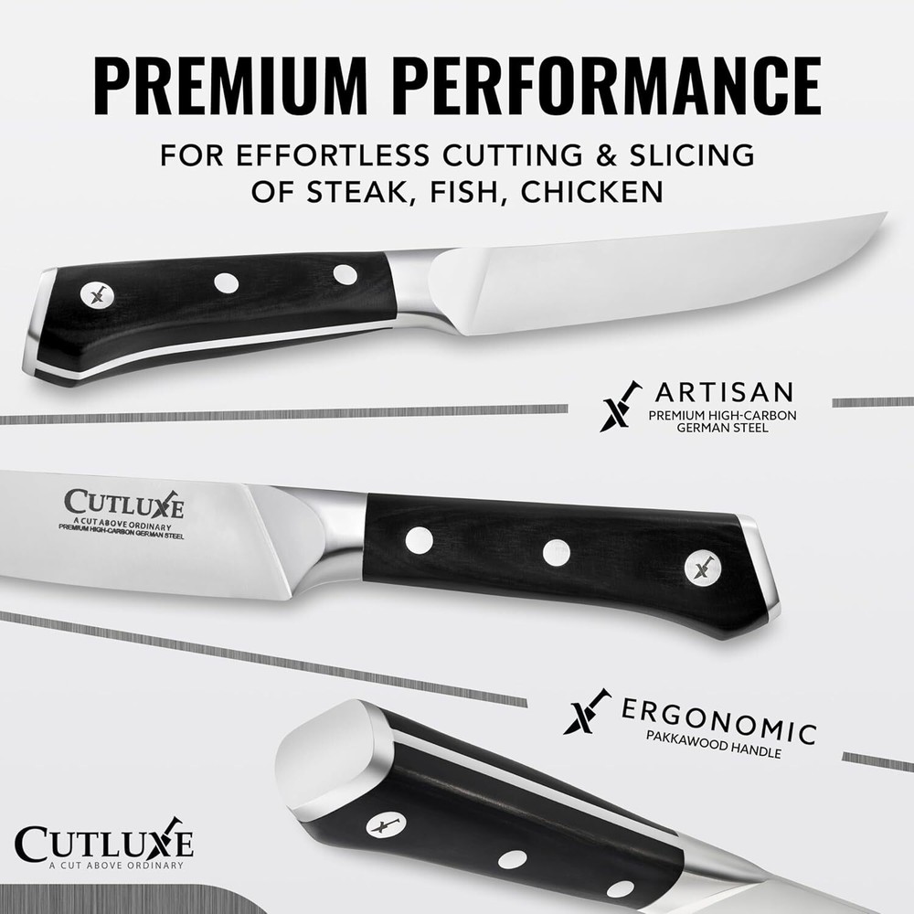 HIGH-END STEAK KNIFE SET - 4 Piece steak knife set with triple riveted luxurious pakkawood handle, imported high carbon German steel, full tang construction and 5 Inch razor-sharp straight blade edge for effortless and precise slicing. IMPORTED GERMAN STEEL – Precisely forged of high-carbon stainless German steel engineered to perfection at 56+ Rockwell hardness for long lasting performance, rust and stain resistant. FULL TANG ERGONOMIC DESIGN - Luxury pakkawood handle that is triple-riveted for sure grip and absolute stability that ensures comfort and maneuverability. Laminated and polished for a sanitary build, perfect for busy kitchens. RAZOR-SHARP BLADE EDGE – Hand sharpened edge at 14-16 degrees per side for maximum sharpness & edge retention ensuring precision slicing every time. On Feb 7, 2025 at 07:49:37 PST, seller added the following information: