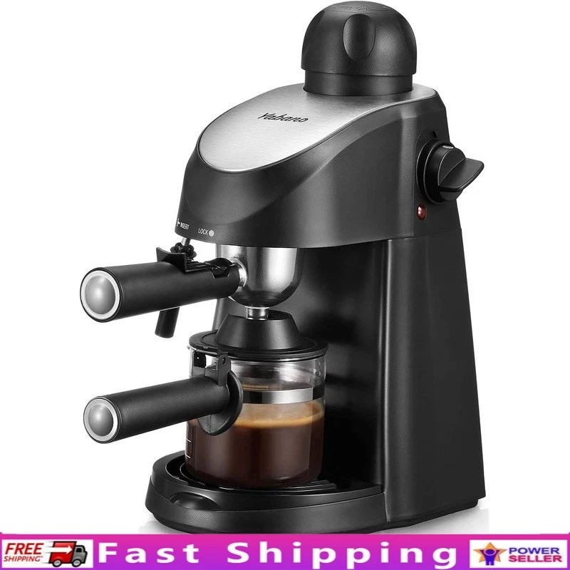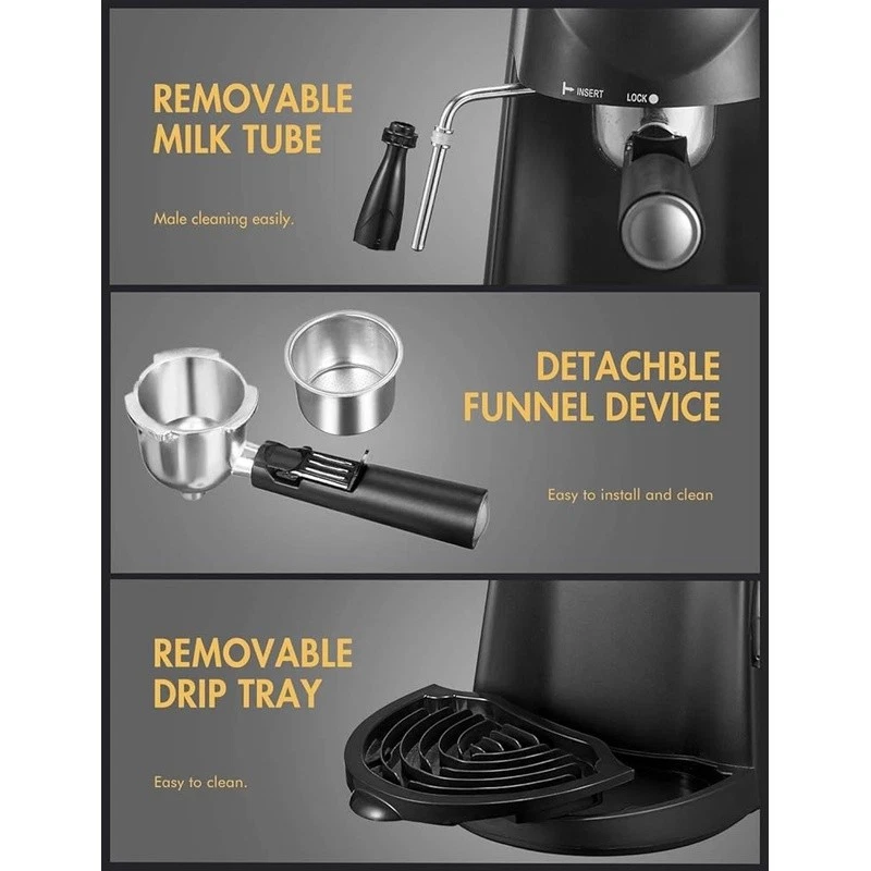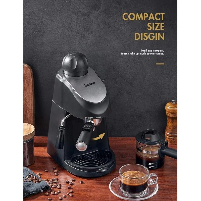 About this item Easy Operation - steam espresso machine is very easy to use, for beginner without requiring much techniques and skills. It can make up to 4 cups espresso coffee at the same time, serving delicious espresso, cappuccinos and lattes for yourself, your friends and family Steam Wand - espresso coffee maker come with a built in steam wand, You can enjoy cappuccino and latte with creamy and rich foam at any time at home. You can enjoy cappuccino and latte with creamy and rich foam at any time at home. Compact Design - It’s small and compact, doesn’t take up much counter space. Dimensions are 13.1" high x 7.7" wide x 10" deep, weight only 4.7 pounds, great for easy handling and storage Easy to Clean - The portafilter, nozzle and drip tray can be easily removed, makes it very easy to clean When installing filter holder, its handle must be aligned at lock position to ensure it’s locked tight. To ensure maximum flavor, Please use medium-coarse coffee ground. Brand: Capacity: 8.15 ounces Color: Black Product Dimensions: 13.43"D x 10.94"W x 7.6"H Special Feature: Milk Frother