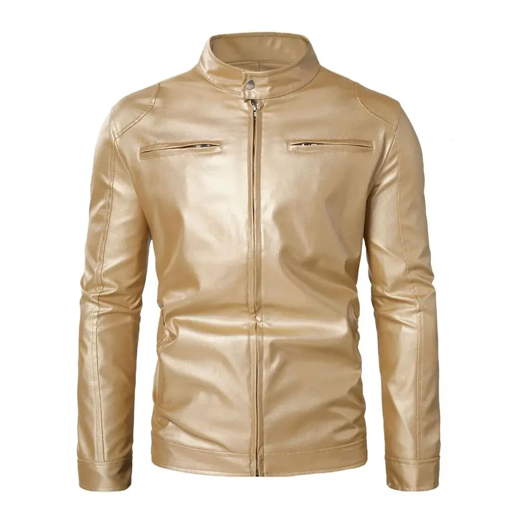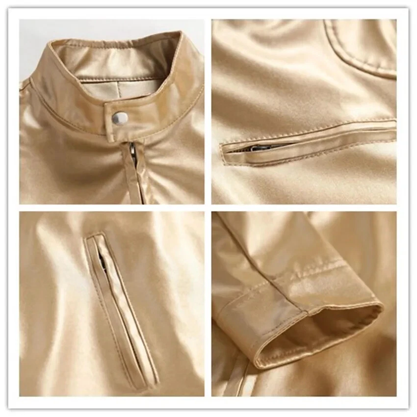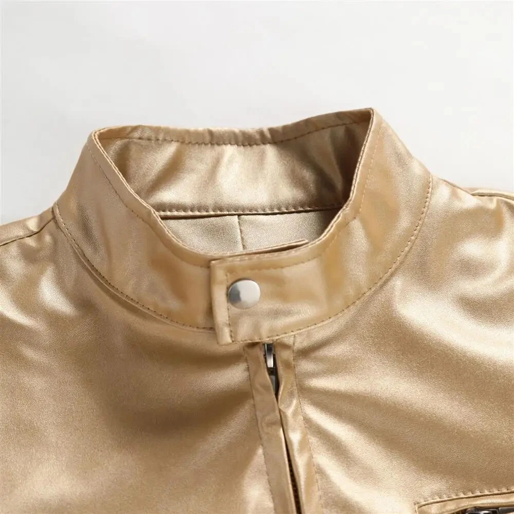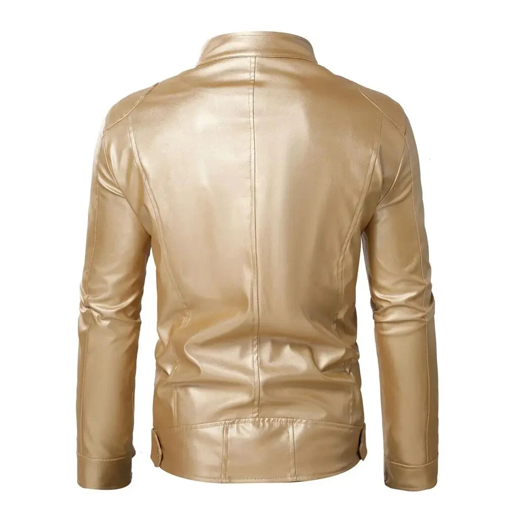 Steampunk Gold Leather Jacket for Men with Metallic Zipper Nightclub Streetwear