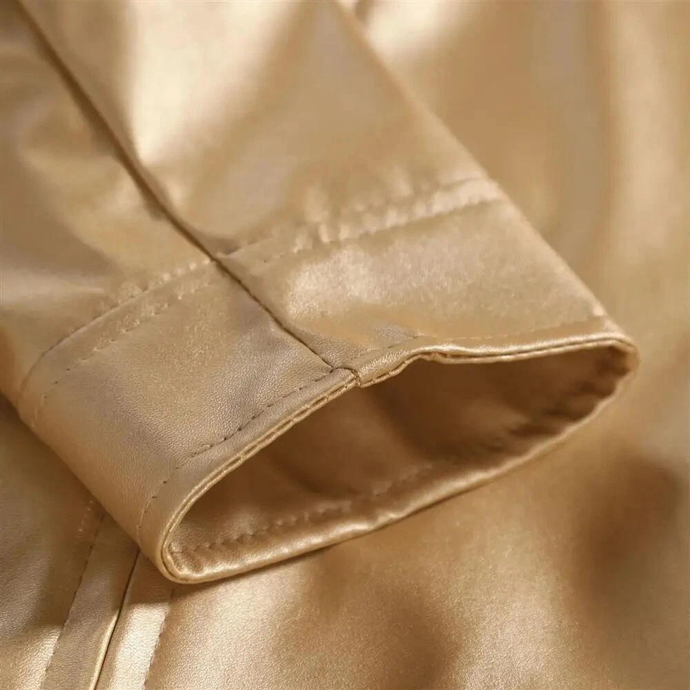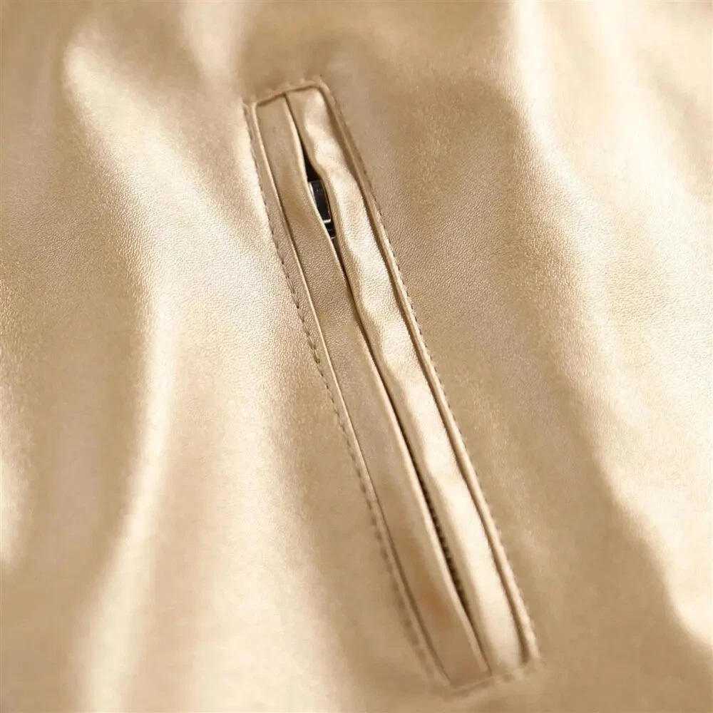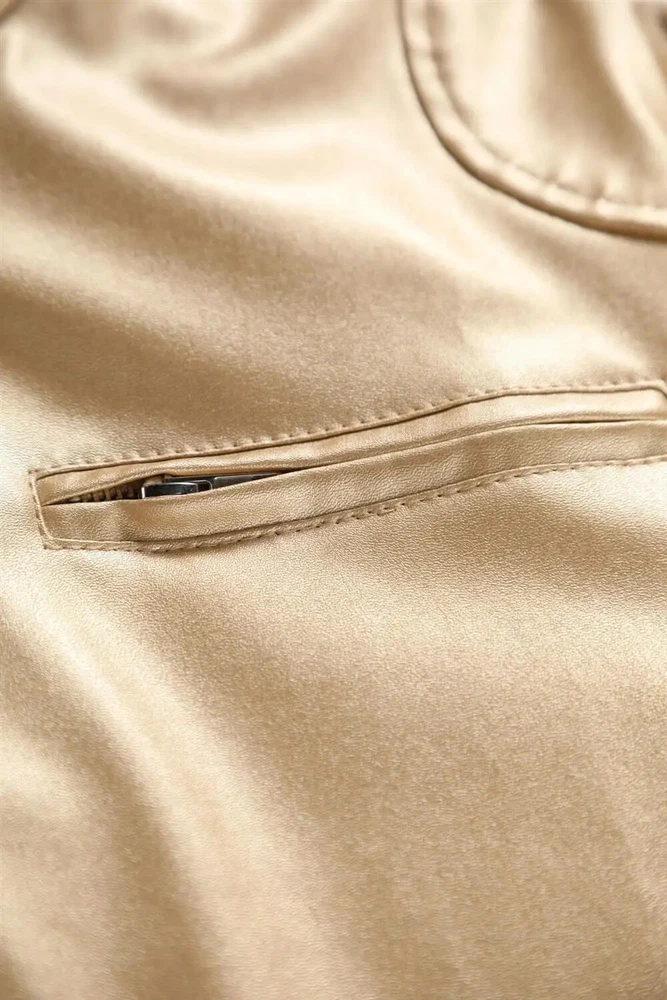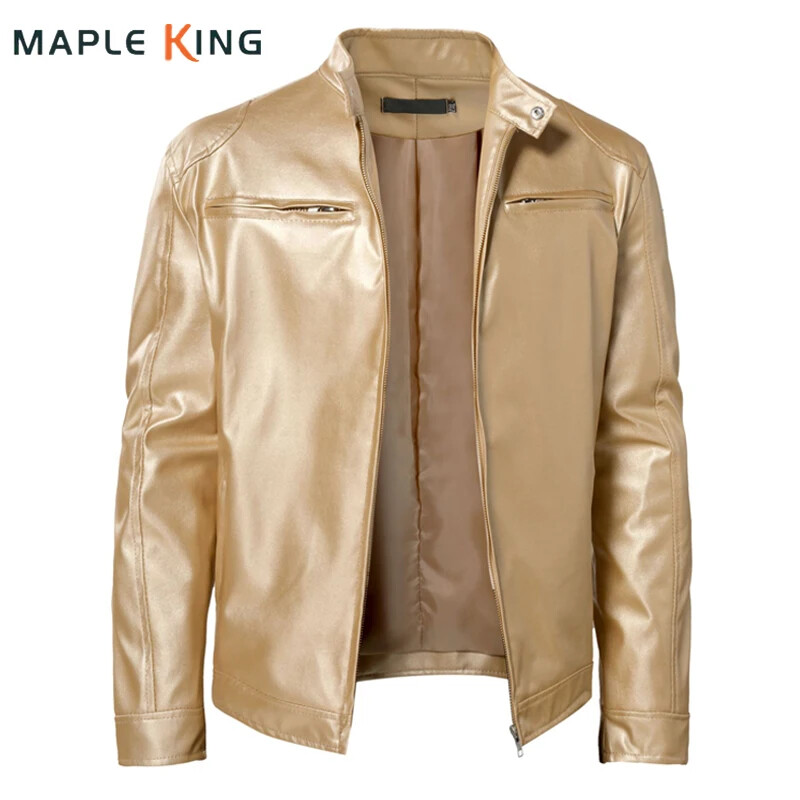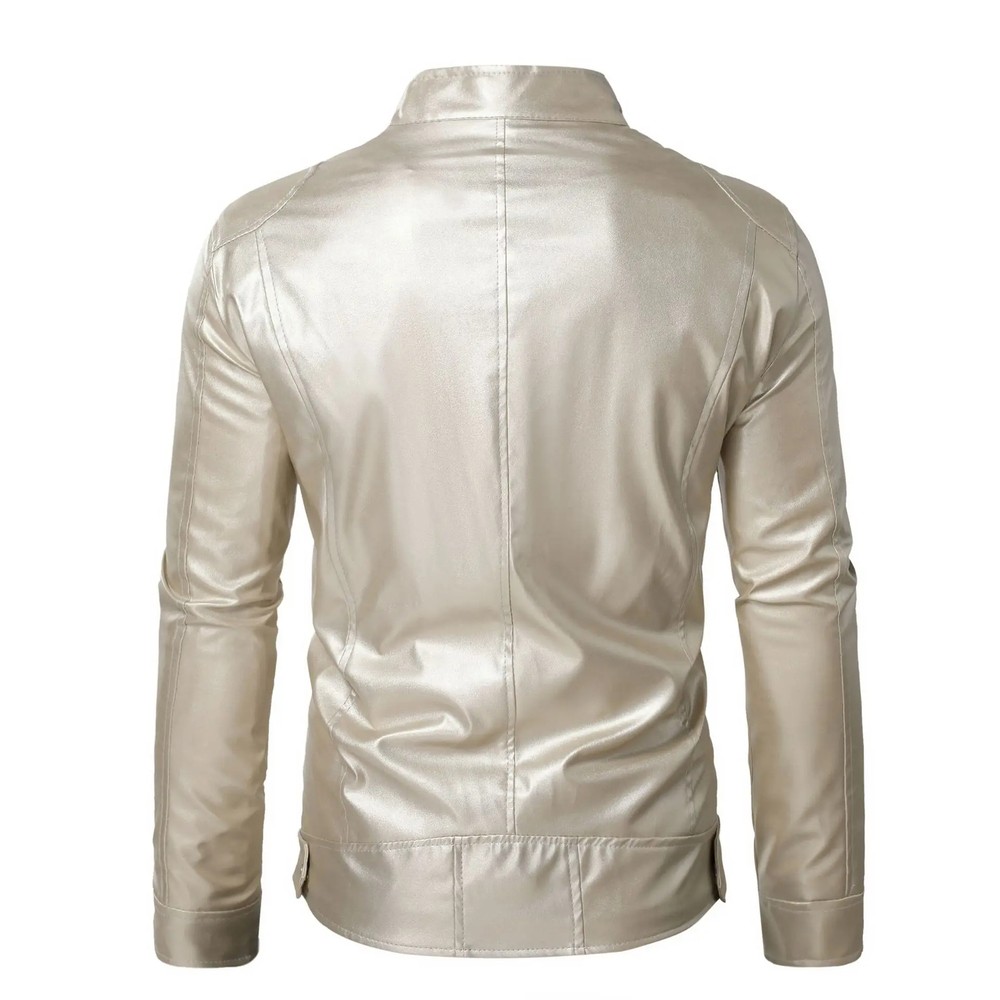 Steampunk Gold Leather Jacket for Men with Metallic Zipper Nightclub Streetwear