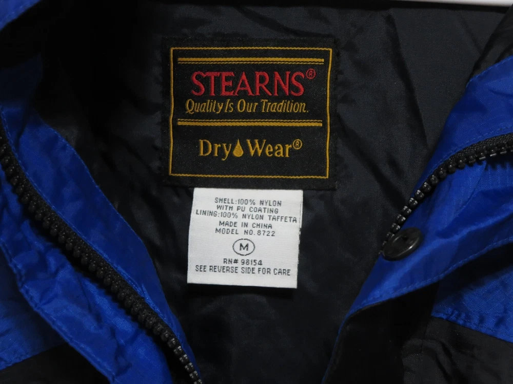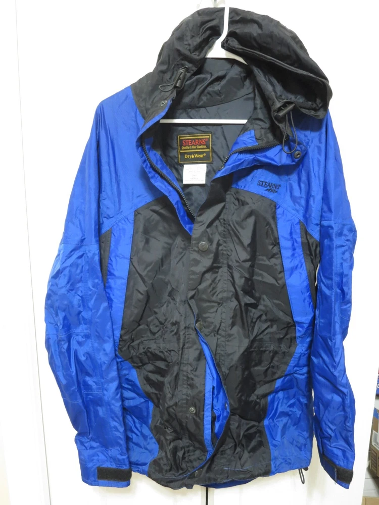 Stearns Outdoors Dry Wear Raincoat Jacket with hood 100% Nylon Men's size Medium Blue/Black Snap & Zipper closure Great shape!