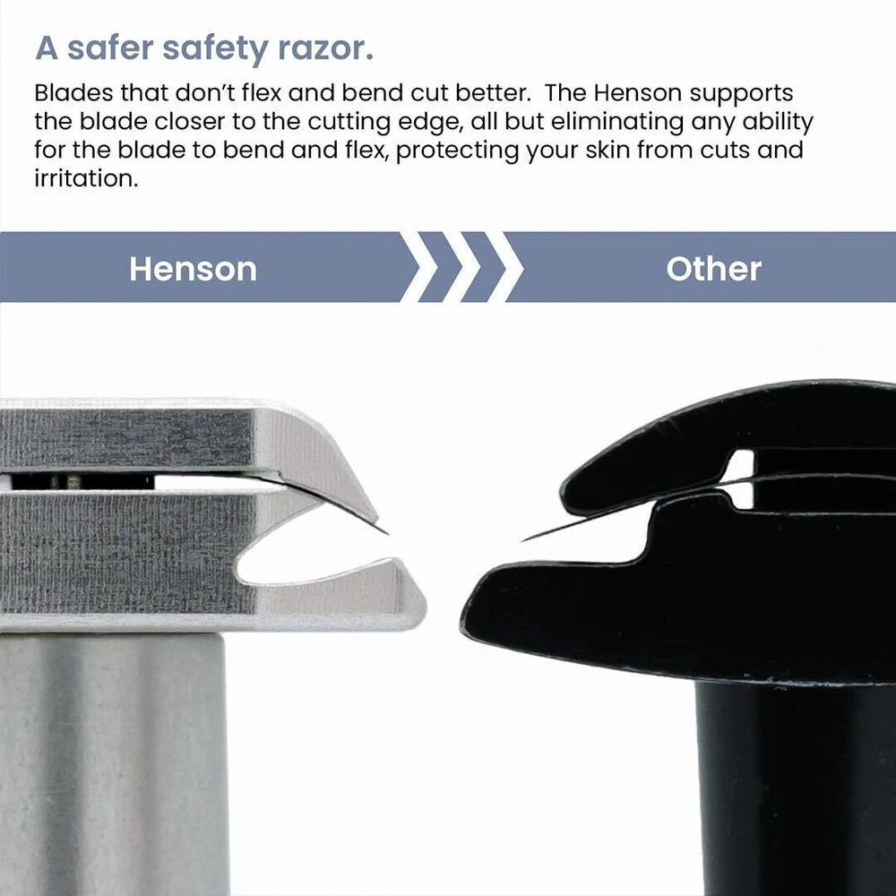 Unit Count 1.0 Count Special Feature Double Edge Skin Type All Number of Items 1 About this item Precision Engineering- Many men experience some form of irritation to the skin when shaving like razor burn, an inconsistent shave and ingrown hairs caused by inferior razors. At Henson, we've addressed this using our 22+ years of aerospace machining expertise to identify major flaws in mainstream razors, such as unsupported cutting blades, and designed the Henson Double Edge Safety Razor in a way that truly protects your skin 30° Blade Angle- Hensons single blade razors for men and women are designed with a 30 degree angle when in contact with the skin, this strikes the perfect balance between shaving efficiency and comfort. This helps minimize skin irritation cuts and razor burn, and allows you to shave with confidence Blade Rigidity & Free End Length - Rather than a gradual bend across the entire width of the blade, the head of the Henson razor creates a focused bend close to the blade’s edge to maximize the rigidity of the blade.The longer the blade the more flex it has which can result in skin irritation and an inferior shave. Our short free end length supports the blade close to the cutting edge, further reducing any chatter during a shave Wide Open Channels - Henson AL13 razor is beginner friendly and easy to clean. Its sleek, open channels let shaving creams and hair rinse effortlessly from the razor’s head, eliminating the need to clear off any clogged hair left from the blade