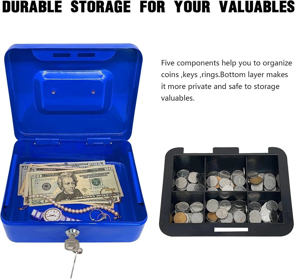 Steel Cash Box with Key Lock, Metal Small Money Blue - 5.9" X 3.1" X 4.7" Product Details Manufacturer: PACOLO Part Number: Steel Cash Box with Key Lock Item Weight: 1.08 pounds Product Dimensions: 5.9 x 3.1 x 4.7 inches Country of Origin: China Item model number: Steel Cash Box with Key Lock Color: Blue - 5.9" X 3.1" X 4.7" Style: Classic Material: Alloy Steel, Metal Item Package Quantity: 1 Mounting Type: Floor Mount Special Features: Key Lock Included Components: Stainless Steel, Alloy Steel, Plastic, Metal Batteries Included?: No Batteries Required?: No Size and Color: Exterior dimensions: 4.9 inch x 3.74 inch x 2.16 inch; Four colors(Black, White, Red, and Blue) are available for you to choose from. Key Lock: This cash box has a key lock to keep valuables safe. The key is easy to operate and can be opened with one hand. Removable Tray: This cash box has a removable tray with six compartments for excellent coin organization and a layer underneath the tray for storing cash and checks. Highly Quality: This solid steel cash box does not fear knocks and shocks.Suitable for storing bills, coins, checks, and receipts. The lock box is lightweight with a convenient handle, so you can take it anywhere and hide it easily. Wide Application: This money box with a key is suitable for indoor or outdoor small businesses, commercial supermarkets, stores, lockers, cabinets, and family use. It is also a perfect gift for your friends and family for birthdays, Mother’s Day, or Christmas. Suitable for storing bills, coins, checks, and receipts.