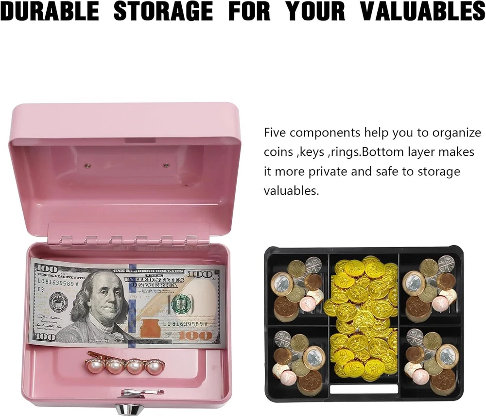 Steel Cash Box with Key Lock, Metal Small Money Pink - 5.9" x 3.1" x 4.7" Product Details Brand: PACOLO Product Dimensions: 5.9"D x 3.1"W x 4.7"H Lock Type: Key Color: Pink - 5.9" x 3.1" x 4.7" Material: Stainless Steel, Alloy Steel Special Feature: Key Lock Mounting Type: Floor Mount Control Type: Key Control Included Components: Stainless Steel, Alloy Steel, Plastic, Metal Water Resistance Level: Not Water Resistant Chamber Depth: 5.9 Inches Manufacturer: PACOLO Item Weight: 1.21 pounds Country of Origin: China Item model number: Steel Cash Box with Key Lock Special Features: Key Lock Batteries Included?: No Batteries Required?: No Brand: PACOLO Product Dimensions: 5.9"D x 3.1"W x 4.7"H Lock Type: Key Color: Pink - 5.9" x 3.1" x 4.7" Material: Stainless Steel, Alloy Steel Special Feature: Key Lock Mounting Type: Floor Mount Control Type: Key Control Included Components: Stainless Steel, Alloy Steel, Plastic, Metal Water Resistance Level: Not Water Resistant Size And Color:Exterior dimensions: 4.9 inch x 3.74 inch x 2.16 inch,4 colors(Black, White,Pink and Blue) available for you to choose. Key Lock:This cash box has a key lock to keep valuables safe. The key is easy to operate,can open it no problem with one hand. Removable Tray:This cash box has a removable tray with 6 compartments which makes for great coin organization,as well as a layer underneath the tray for storing cash and checks. Highly Quality:This cash boxes is made of high quality steel which is solid and not afraid of knocks and shocks.Suitable to store bills, coins, checks and receipts.The lock box is lightweight with a convenient handle, so you can take it to anywhere and hide it easily. Wide Application:This money box with key is suitable for indoor or outdoor small business,commercial supermarket,store,lockers, cabinets, family use.It also is a perfect gift for Birthday, Mother’s day,Christmas for your friends and family. Suitable to store bills, coins, checks and receipts.
