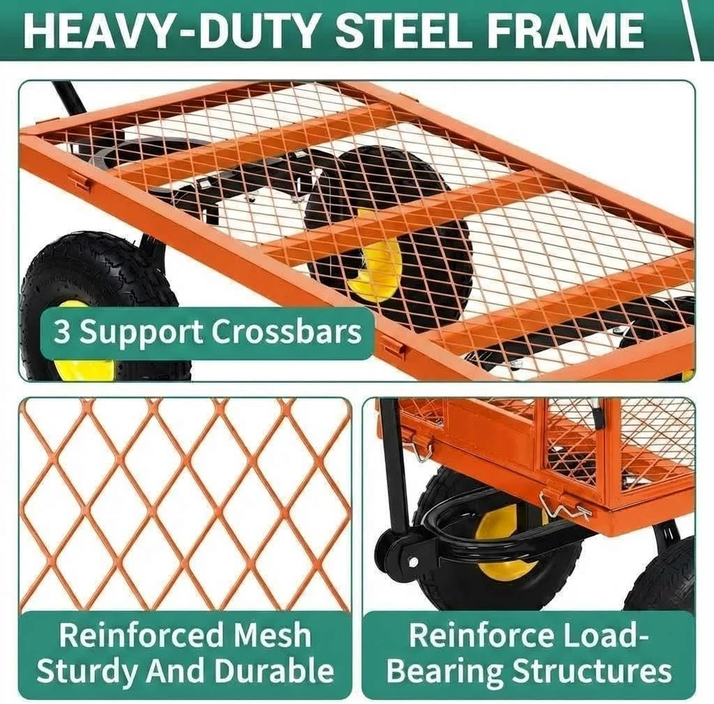 Steel Garden Cart 1100lb Capacity Heavy Duty Yard Wagon Utility Cart 10in Tires About this item: 【 Heavy-Duty Load Capacity】Engineered for serious hauling, this heavy-duty steel garden cart supports up to 1100 lbs, making it the perfect partner for moving heavy soil, rocks, mulch, and firewood. Whether you're working on a farm, yard, or landscaping project, this robust metal wagon provides a reliable solution for all your outdoor transportation needs. 【Versatile 3-in-1 Design with Removable Sides】Maximize your gardening efficiency with our flexible 3-in-1 garden wagon. The removable mesh sides allow you to easily convert the unit from a traditional fenced cart to a flatbed wagon for hauling oversized loads like logs or large equipment. This multi-functional utility cart is a must-have for diverse outdoor scenarios. 【10" All-Terrain Pneumatic Tires】Equipped with 10-inch heavy-duty pneumatic rubber tires, this utility garden cart provides excellent shock absorption and stability. These wear-resistant, all-terrain wheels ensure a smooth and quiet ride across gravel paths, muddy fields, or green grass, reducing the effort required for heavy outdoor hauling. 【180° Rotating Handle & Easy Steering】Navigate through tight spaces and sharp corners with ease. Our garden cart wagon features a 180-degree swivel handle with an ergonomic cushioned grip to reduce hand fatigue. The responsive steering design ensures effortless control, even when the metal garden wagon is fully loaded with heavy gardening supplies. 【Durable All-Steel Construction & Rust-Resistant】Crafted from high-quality reinforced steel, the steel mesh bed is built for industrial-strength durability. The powder-coated finish ensures exceptional rust resistance, allowing the lawn cart to withstand harsh weather conditions. Invest in a reliable Specif ication : Type: Garden Cart Material: Steel Load Capacity: 1100 lb Color: Orange Features: with 10" All-Terrain Wheels, 180° Rotating Handle & Removable Sides Includ ed : 1 x Garden Cart Payment Delivery details Returns details Feedback Payment We accept Payoneer only. All major credit cards are accepted through secure payment processor PayPal. Payment must be received within 7 business days of auction closing. If you have bought multiple items from me, you can send me one payment for all the items instead of paying for them individually. When you click the Pay Now button, eBay will automatically determine if there are other items you have won or purchased from me and will combine them for your review. NOTE: Import duties, taxes and chargers are not included in the item price or shipping charges. These charges are the buyer's responsibility. Please check with your country's customs office to determine what these additional costs will be prior to bidding buying. Delivery details 1. We will delivery out at the handing time when we receive the payment. 2. The delivery time is 3-5 business days to US by usually time.The parcel maybe delay 1-2day of the weekend.Due to the bad weather,Holidays,Hot Season ect.the parcel maybe delay,If you have any problems,mssage us,we will try our best to solve it. 3. We ship to your eBay address. Please make sure your eBay address is correct before you pay. 4. If you want to change the shipping address,message us before our send out. 5. We cannot deliver your order if your state is PR. Returns details 1. If you donot receive the items at the delivery time,the parcel has broken/missing,Please message us before you open case/return,we will try our best to solve it. 2. We offer a 30 day return policy from checkout winning date. 3. An RMA number is required for all returns. Message us for return instructions. Items Returned without a RMA number will not be processed. 4. Items defective upon receipt must be packaged in their retail packaging as if new and returned with a detailed description of the problem. 5. Return shipping fees are not refundable. We reserve the right to decline any returns if the above guidelines are not followed. Feedback If you are not satisfied with the item for any reason, please do not quick to leave negative/neutral feedback even open request and case without any communication with us. We devote ourselves making EVERY CUSTOMER in 100% Satisfactory and resolve any problem. Thank you for your understanding and recognition,we are always leave positive feedback to all our customers. Reply: All replies will be sent to your email box, if you do not get response within 24 hours (Sat. & Sun. excluded) please check your eBay My Messages in case that our emails will be filtered automatically by your settings. Brand Unbranded Type 4-Wheeled Wheelbarrow Weight Capacity 1100 lbs Capacity 1100 lbs Color Orange Wheel Diameter 10 in Material Steel Number of Wheels 4 Suitable For Gardening