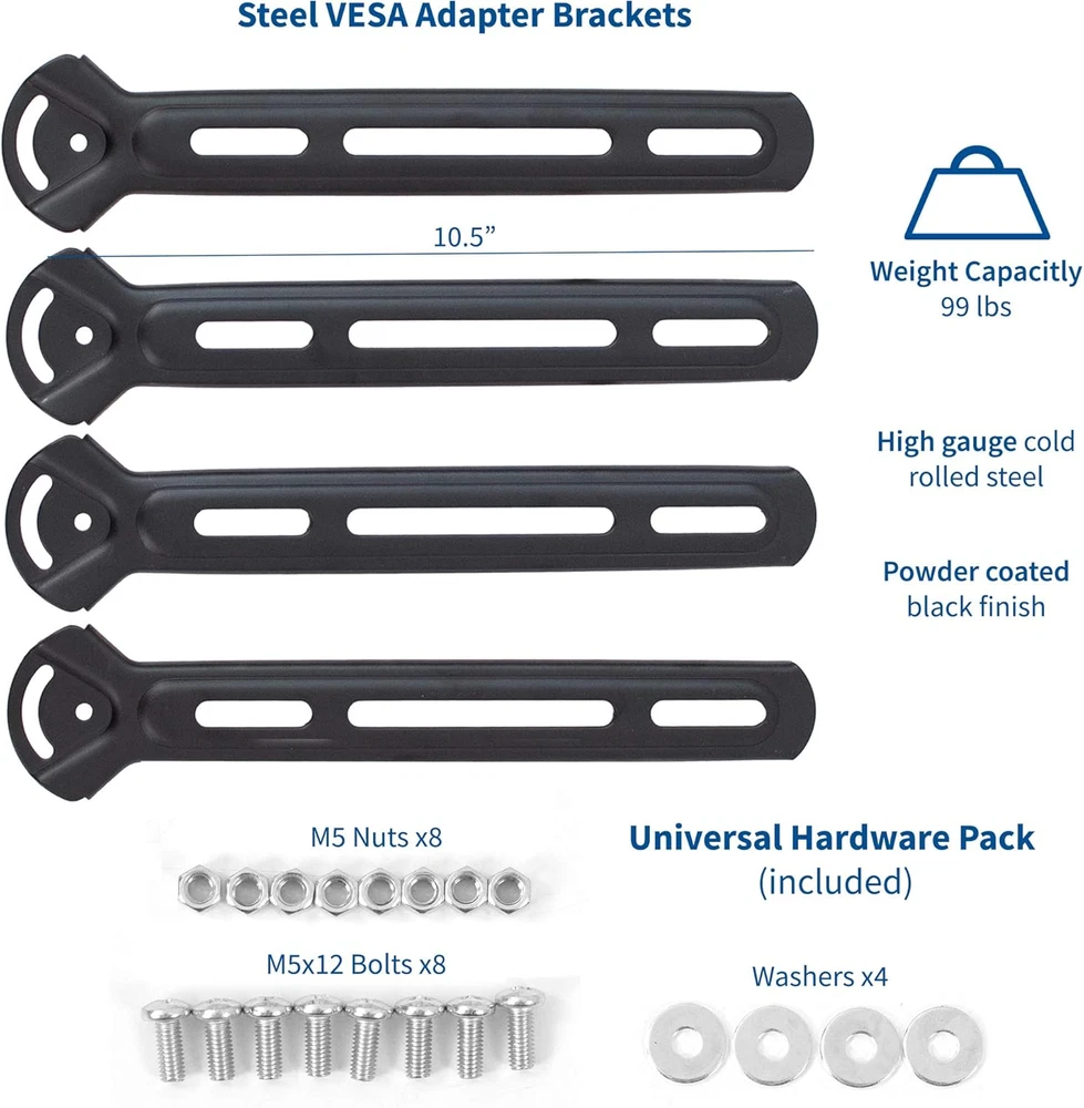 VIVO Adapter Solutions - This VESA Adapter Kit makes it possible for a large LCD screen to fit standard VESA mounts. Adapter Function - Allows any screen with VESA hole patterns up to 400x400mm to fit standard VESA mounts with 75x75mm or 100x100mm mounting compatibility. Solid Steel Construction - High gauge cold rolled steel with powder coated finish ensures long-lasting quality and enables these sturdy brackets to support weights up to 99 lbs. Low Profile - The black matte color blends well with most monitors and mounts to retain a low profile appearance. Easy Installation - A universal hardware pack is included along with all the necessary instructions to get your screen mounted to a compatible stand in no time! Product Description MOUNT-AD4X4 If you have a TV with 400x400mm mounting holes and can't find a VESA compatible mount, we have a solution! With MOUNT-AD4X4 from VIVO, a standard 75x75mm or 100x100mm VESA mount will now fit screens with VESA patterns up to 400x400mm! Solid steel construction makes these brackets designed for security, durability, and scratch resistance. *Check MOUNT and TV Compatibility* FEATURES Increase Mounting Options This sturdy adapter allows screens featuring up to 400x400mm VESA mounting holes to fit monitor stands that never fit before! Now compatible with VESA 75x75mm and 100x100mm wall and desk mounts, display options have increased for your screen! Easy Assembly All the necessary screws and hardware are included for fast and easy assembly, so you can get your screen mounted and providing comfortable viewing angles in no time! Solid Construction These solid steel adapter brackets are built for scratch resistance and durability, supporting up to 99 lbs of weight to accommodate your TV display. Please check the weight capacity for the mount that you want to use as well to make sure it can also hold your screen. Allows VESA 75x75mm and 100x100mm mounts to fit up to 400x400mm mounting patterns Color: Black Material: Steel Surface Finish: Powder Coating Length of Bracket: 10.5” Weight Capacity: 99 lbs