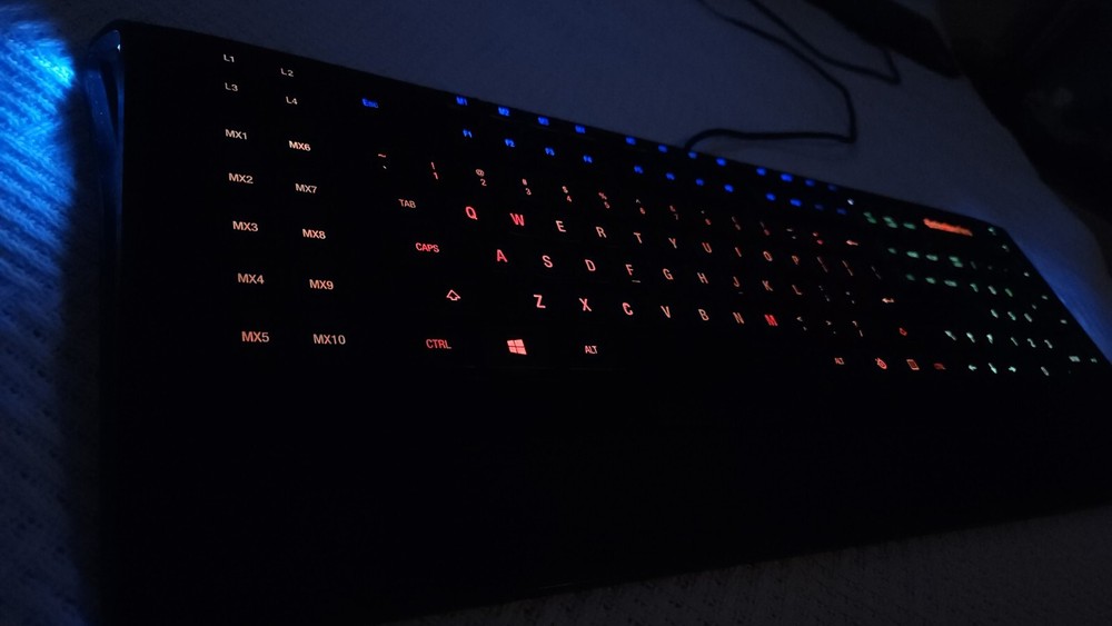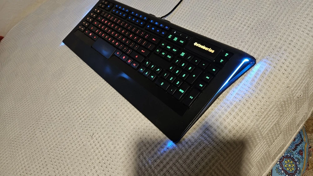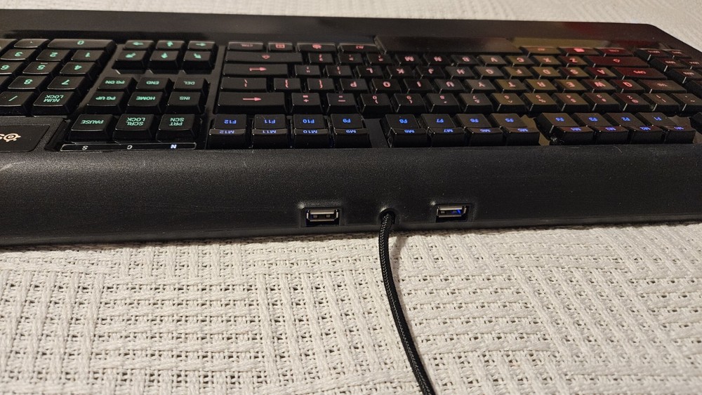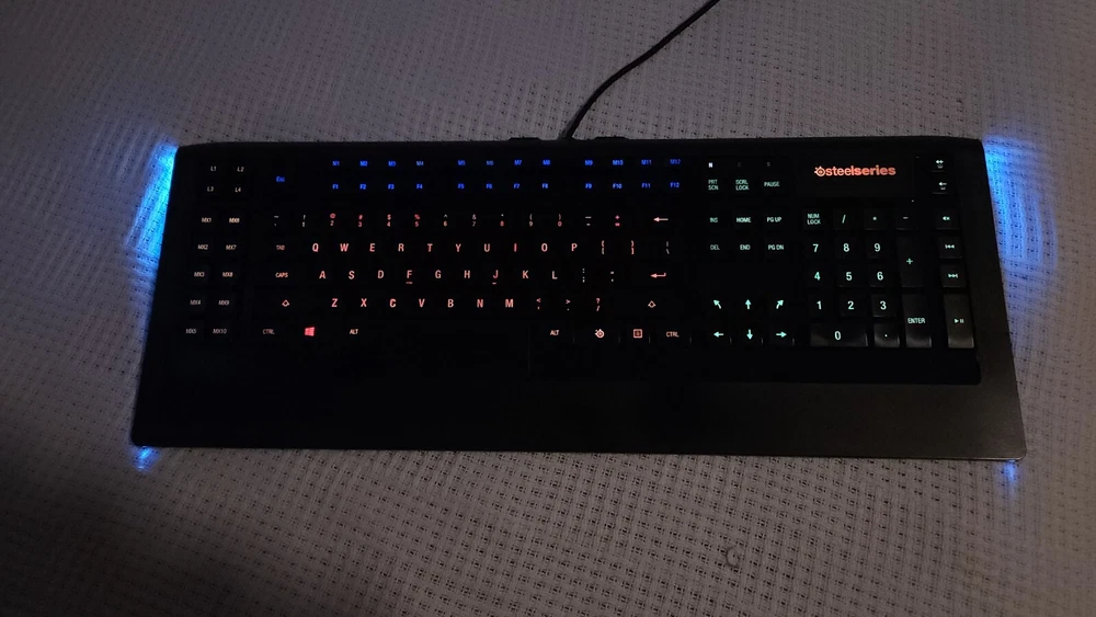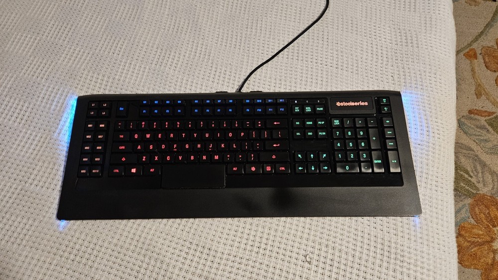 I love my SteelSeries Apex 350! The software (download) allows for any macro you can dream up. Start programs, run macros, repeatable key combinations. 26 programmable keys in addition to all the standard keys including function keys. A jewel of a keyboard. I'm selling because I've renovated my office and sadly my new desk can't accomodate this lovely, full-size keyboard. USB-A connection and two USB-A jacks on the back. FREE shipping in the USA. In excellent fully operational condition with fully backlit keys that you can even assign color schemes to different parts of the keyboard layout - you choose the colors. A true joy to work with.