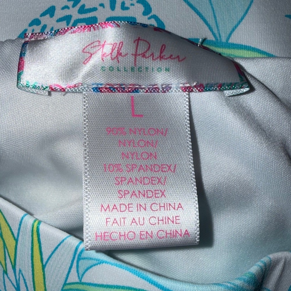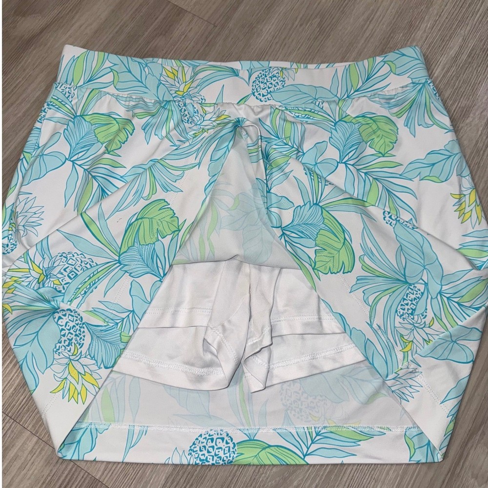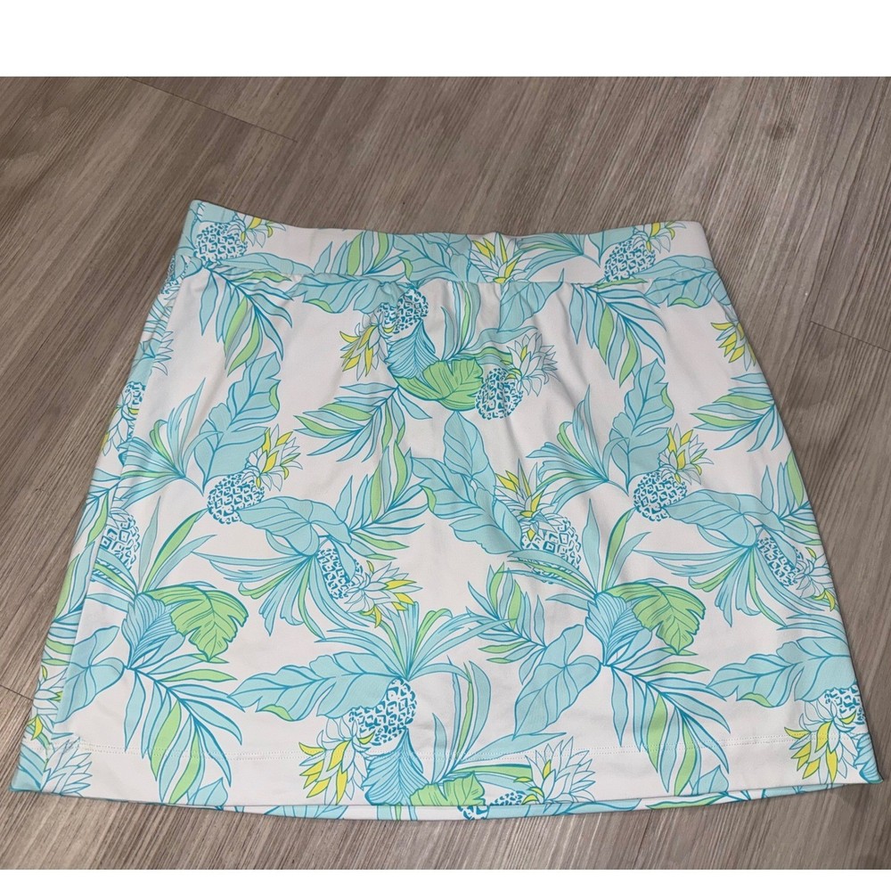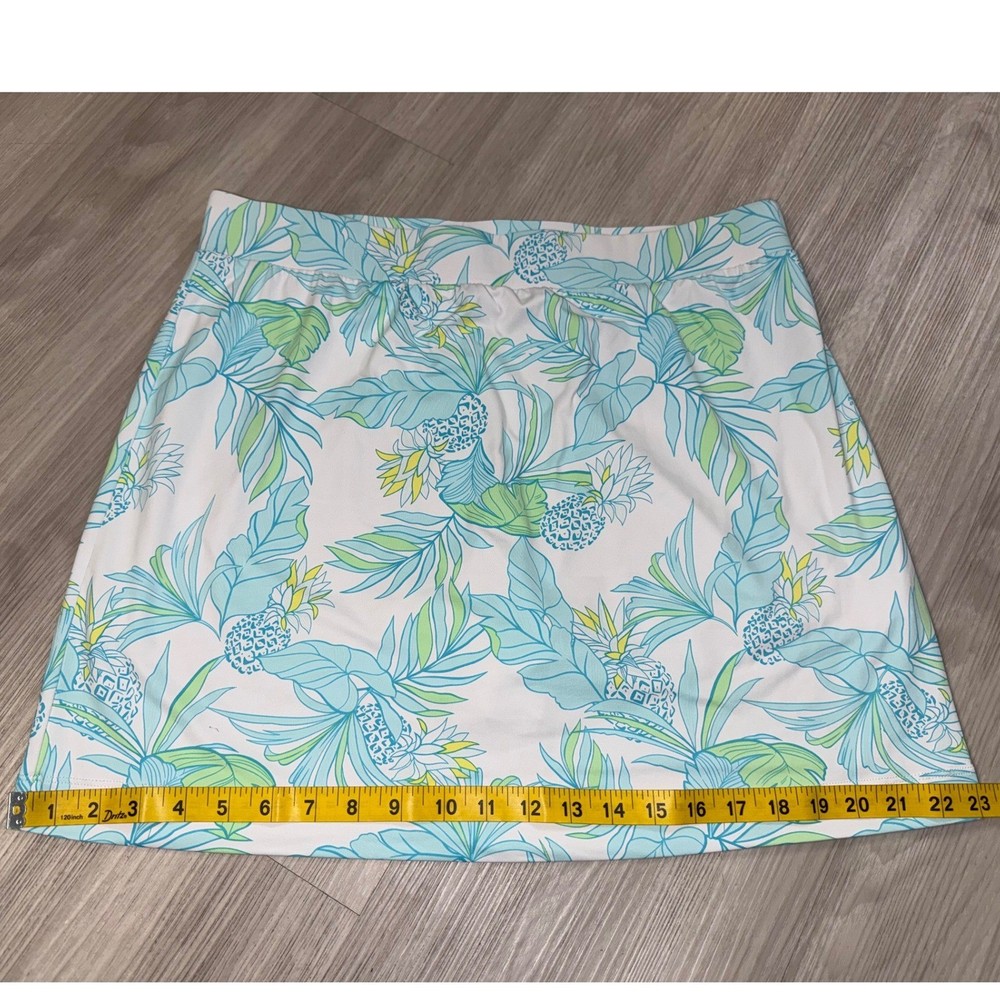 Beth Parker Collection active skort features a vibrant tropical pineapple and palm leaf print in shades of blue, green, and yellow on a crisp white background. Designed for performance and comfort, this pull-on style includes built-in white undershorts and a wide elastic waistband. The moisture-wicking nylon and spandex blend provides a flexible fit, making it an ideal choice for golf, tennis, or casual summer outings. Measurements: • Waist: 17" (34" doubled) • Length: 17" • Hem: 22" (44" doubled)