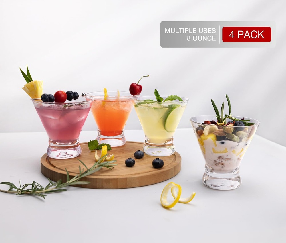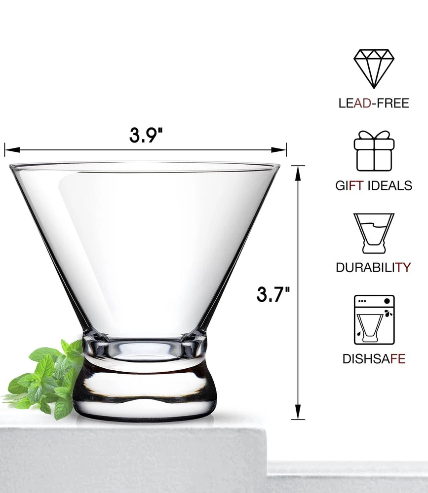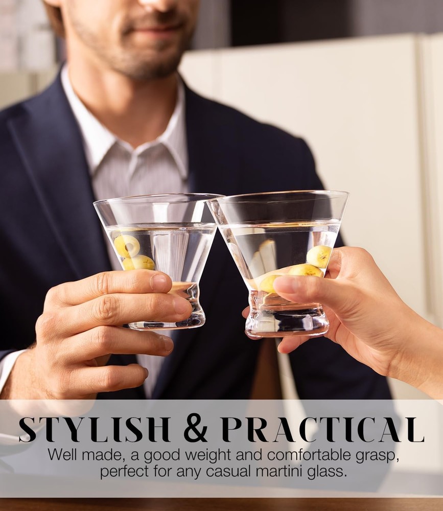 Cocktail Glasses Set of 2 Seamless Cosmopolitan, Martini Glasses with Heavy Base – Perfect Glassware for Home Bar, Restaurant, Parties - Beautiful Housewarming Gift Sturdy Heavy Base: Stemless martini glasses feature a thick and balanced base. So much sturdier than traditional martini glasses, cocktail glasses and fits a drink perfectly. Special for those who need more stability when they’re drinking a cocktail. Just toast to your heart’s content! Whether you're enjoying a quiet evening in or hosting a lavish party Lead-free Crystal & Classic Design: Made of premium lead-free ultra-clarity sturdy crystal. Features V-shape cinched design and smooth rim, intended for a comfortable hold and easy use. Stemless but still in the shape of a classic martini glass and you will fall in love with its gorgeous shape, which brings you a more pleasant drinking experience Enjoy Your Favorite Drinks: 8-ounce stemless wine glasses are especially designed for classic martini, mixed cocktail, cosmopolitan, manhattan, but great for juice, other alcohol drinks, even creative appetizers and desserts. Enjoy your favorite drinks and life’s most leisure times Dishwasher Safe & After Sales: Never spend effort on cleaning, simply toss them in the dishwasher and you will get each like new glass Perfect Gift Ideas: Excellent present for family, friends,partner, workmates. Surprise them with a unique gift and make it a memorable time. Great for parties, weddings, anniversaries, birthdays, housewarming and even treating yourself