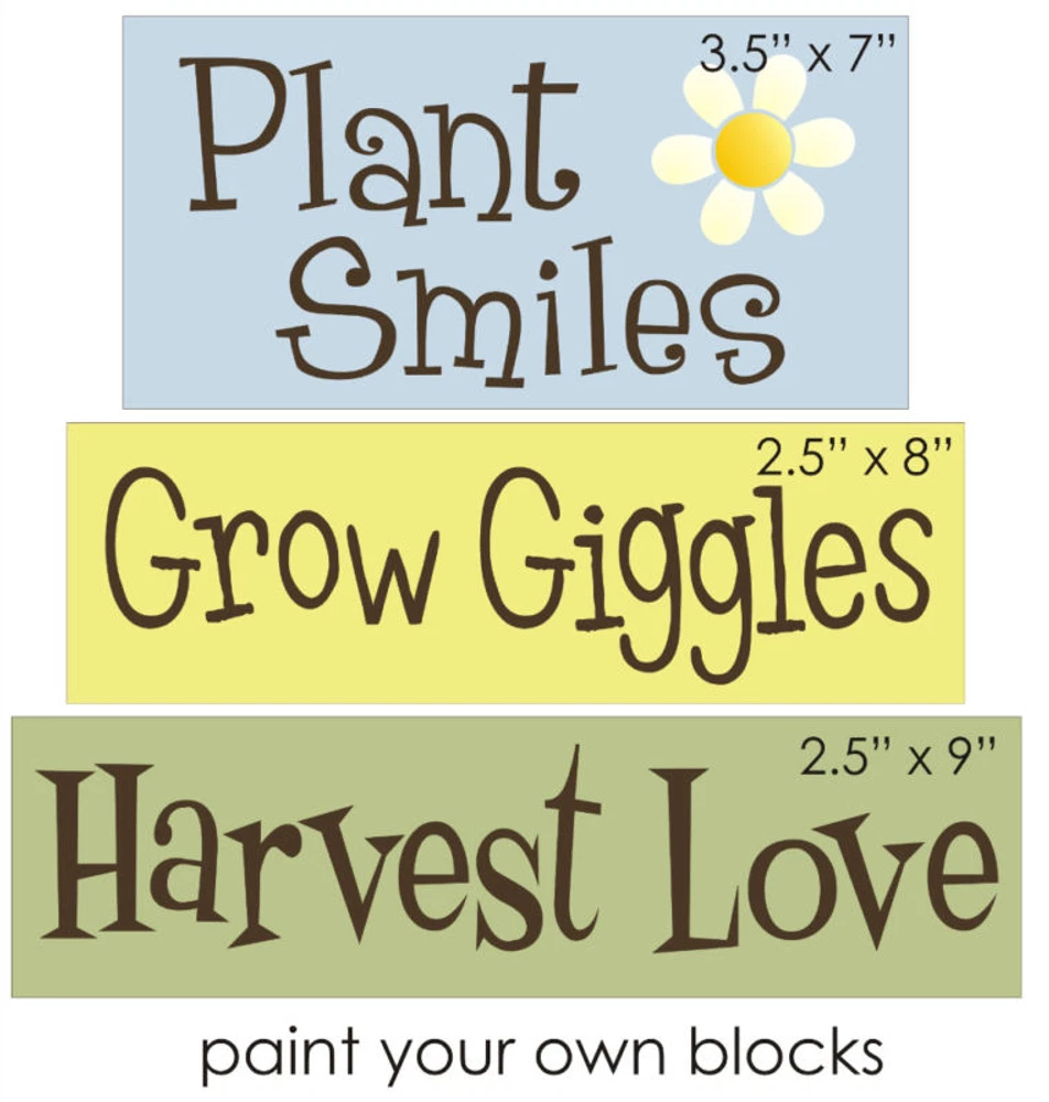 -(1) New Stencil Trio #T297 ~ Plant Smiles Grow Giggles Harvest Love with summer sunflower daisy Create beautiful DIY block signs with this 3-piece craft stencil set from Stencils by Joanie. The set features a charming shelf sitter Block design that will brighten up any home or craft project. Made from durable 7 mil blue mylar material, these stencils are perfect for decorative tole painting and other crafting projects. Crafted in the United States, the Garden theme, Plant Smiles Grow Giggle design are perfect for adding a touch of warmth and cheer to your space. Get creative with this versatile stencil set and let your imagination run wild! Inspire the artist in you with Stencils by Joanie Your purchase includes free shipping from Joanie