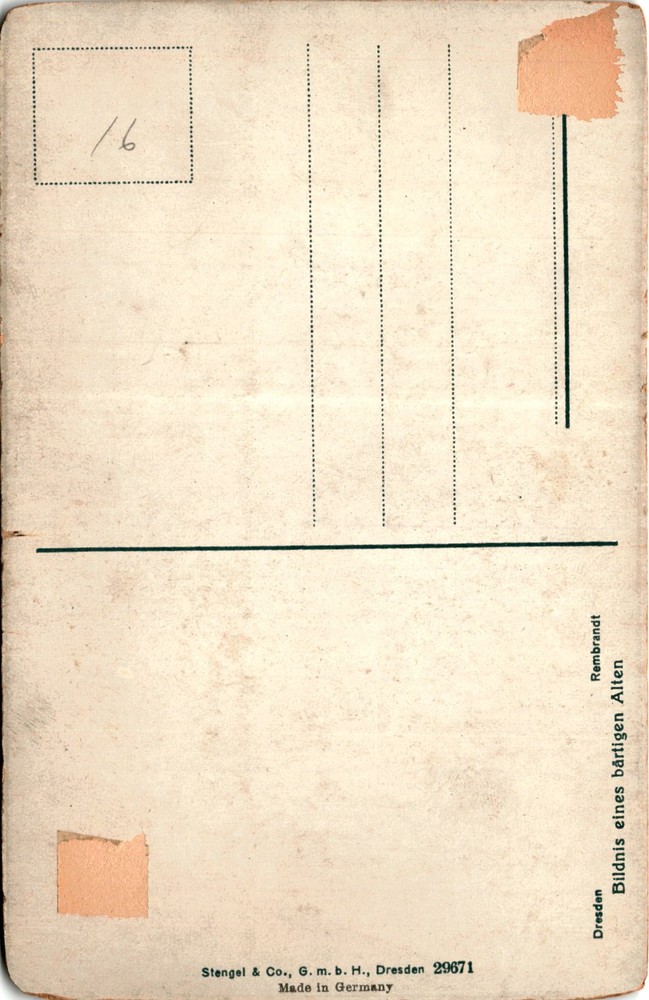MAKE AN OFFER. THE MORE YOU BUY THE BETTER DEAL I WILL ACCEPT The postcard is from Stengel & Co., a company based in Dresden, Germany. The front of the postcard features a painting titled Bildnis eines bärtigen Alten (Portrait of an Elderly Bearded Man) by the artist Rembrandt. The postcard is numbered 16.