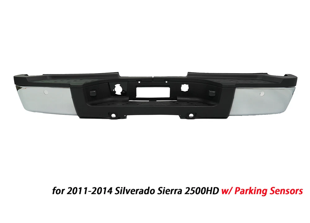 Fitment: For 2011-2014 Chevrolet Silverado 2500 HD 3500 HD For 2011-2014 GMC Sierra 2500 HD 3500 HD For Models With Park Assist Sensors Details Placement on Vehicle:Rear Color:Chrome Material:Steel Package Includes: 1*Rear Bumper Assembly