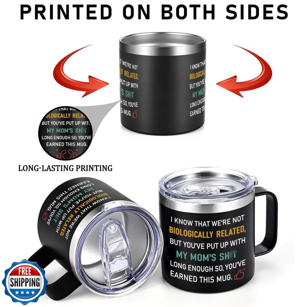 Qtencas Step Dad Gifts, I Know That We're not Biologically Related Coffee Mug, Bonus Dad Gifts, Funny Birthday Christmas Fathers Day Gift for Step Dad Bonus Dad Step-Father,14oz Travel Mug, Black Features [Step Dad Father’s Day Gifts]: Are you searching for an exceptional present to convey your affection and gratitude for Father's Day, Christmas, or a birthday? Consider our Step Dad Gifts 14 oz Insulated coffee mug with handle as an ideal way to honor his unrelenting love and dedication. This thoughtful token is a perfect choice to show appreciation for your stepdad, step father, bonus dad, or dad. [Thoughtful Gifts for Bonus Dad]: Our step father gift box includes a range of practical items sure to bring joy to your bonus dad. The set features a 14 oz coffee mug with handle, a key chain, a spoon, a BPA-free lid, a straw, a straw brush, a cup brush, and a stylish gift box. Receiving this stepdad gift for father’s day will certainly make him feel appreciated and loved. [18/8 Stainless Steel with Good Insulation]: Our dad mug isn't just a pretty face-it's crafted from 18/8 stainless steel for rust resistance and flavor retention. Employing advanced insulation technology, it ensures your cold water, coffee, juice, or any beverage stays chilled for up to 9 hours, and warm for 6 hours. Whether you’re at work or resting at home, it delivers enduring freshness. [Comfortable Handle]: Expertly fashioned with an ergonomic design, this handle is the epitome of comfort. The easy-grip offers convenience and a sense of reliability. No matter how hot the drink inside, the handle remains cool to touch. The handle design also ensures that the stepdad mug remains stable, minimizing the risk of accidental spills. [Easy to Clean]: Convenience is especially important in a busy work environment. Our travel mug is designed with ease of use in mind. The smooth interior surface prevents any residue or stains from sticking, making it effortless to clean. It is also dishwasher safe, saving your valuable time and effort. With this mug, they can enjoy their favorite beverages without worrying about the hassle of cleaning up afterwards. Shipping Free & Fast Shipping: We offer free shipping to most of the USA with a normal delivery time of 3-7 days. However, due to the current situation, additional delivery time (up to 3 weeks) may be required for some items. Alternative Carriers: We may use alternative carriers (e.g., USPS, FedEx, UPS) to ensure your package arrives safely and on time. Due to the use of multiple carriers, we are unable to provide a tracking number automatically. Handling Time: Orders are processed and shipped within 1-2 business days of receiving cleared payment. Shipping Restrictions: Shipping to Alaska, Hawaii, Puerto Rico, Guam, and other US territories may incur shipping charges or delivery restrictions. Please contact us before ordering, or your order can be refunded/cancelled. State Restrictions: Certain items may not be shipped to California due to state regulations. Contact for Tracking Updates: If you require tracking updates or have any concerns about the delivery of your order, please feel free to contact us, and we will be happy to assist you. Return Policy 30-Day Hassle-Free Returns: If you are not completely satisfied with your purchase, you can return the item for free within 30 days of receiving it for a full refund or exchange. Easy Return Process: Contact us, and we will provide you with a prepaid return shipping label and detailed instructions. No Restocking Fee: There are no restocking fees for returns. However, the buyer is responsible for return shipping costs if the return is not due to a seller"s error. Refund Processing: Refunds will be processed within 1 business day of receiving the returned item in its original condition. Feedback Your feedback is extremely important to us. We strive to provide the best products and customer service possible. If you are satisfied with your purchase, please take a moment to leave us a positive review. If you have any concerns or issues with your order, please contact us before leaving negative feedback. We are committed to resolving any problems and ensuring your satisfaction. Contact Us If you have any questions or concerns, please feel free to reach out to our customer support team. You can contact us through the eBay messaging system. We are available Monday to Friday, 9:00 am to 5:00 pm EST, and we will do our best to respond to your inquiry within 24 hours. Thank you for supporting our small family business!