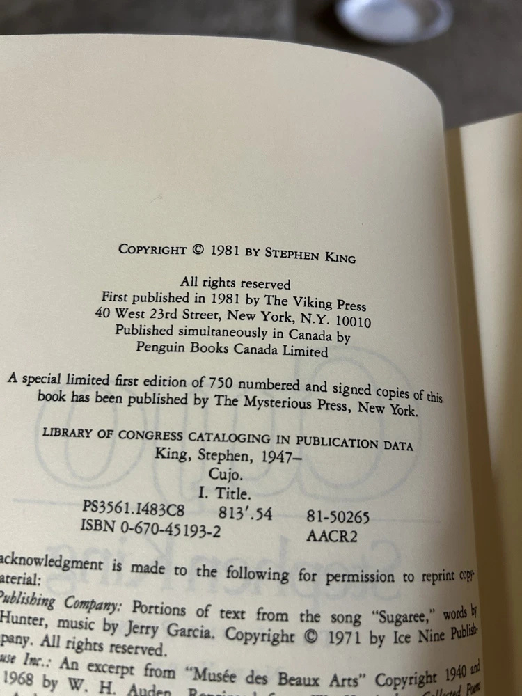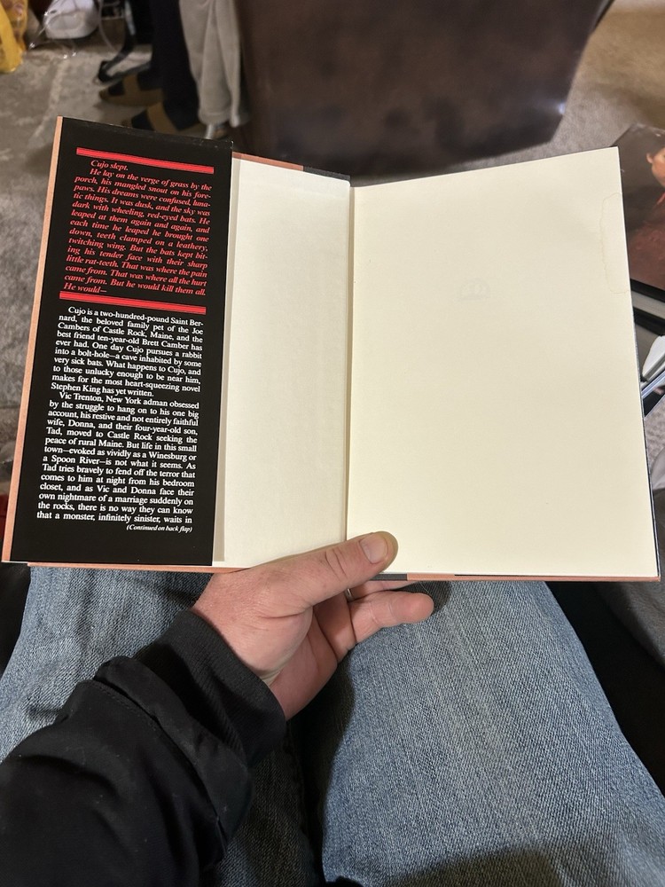 Book Title: Cujo Features: Dust Jacket Country of Origin: United States Author: Stephen King Format: Hardcover Language: English Publication Year: 1981 Publisher: Viking Press Edition: First Edition