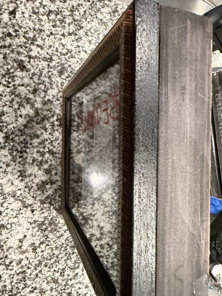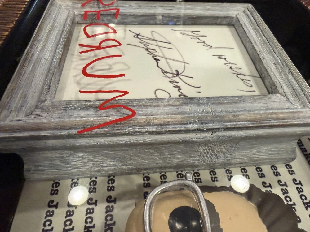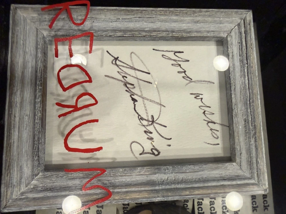 This product is a framed display featuring a Stephen King signed 3 X 5 card with a SK Funko Pop! The autograph has been authenticated by Heroes & Legends, and the framed card is inside a 7 1/2” X 9” shadowbox containing a Stephen King Funko pop figure standing next to the framed signature, and in front of a backdrop of , “ all working no play makes Jack a dull boy. “  the certificate of authenticity has been secured to the back of the shadowbox. This collectible item would be a valuable addition to any fan's entertainment memorabilia collection, showcasing a piece of horror genre history with a personal touch from the renowned author himself.