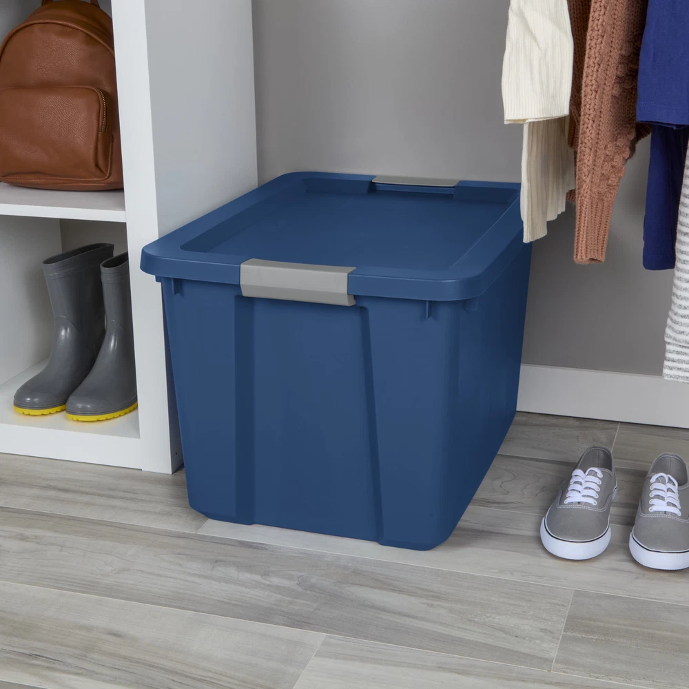 Step up to Sterilite's versatile 20 Gallon Storage Bin with latching lid, ideal for a variety of household storage challenges! The deep recessed lid surface allows totes to stack securely for efficient use of vertical storage space. Large latches keep the lid attached to the base, so contents stay safely stored inside, and provide a comfort grip when carrying. The sturdy design makes it a great option for garages, basements and attics, where you might need a bit more durability. This size plastic storage container is perfect for storing and concealing blankets, seasonal items, sporting gear, and more! Sterilite 20 Gallon Latch Tote, Stackable Plastic Storage Bin with Latching Lid, Blue Outside Dimensions: 23 5/8" x 18 1/4" x 15 1/2" Interior Dimensions at bottom: 18 1/8" x 14 7/8" x 14 3/8" Large latches secure lid to base, keeping contents safely stored inside Deep recessed lid allows for secure stacking, maximizing vertical storage space Comfortable integrated handles for easier lifting and transporting Use good judgment when stacking items, keep heaviest bin at the bottom BPA-free and phthalate-free