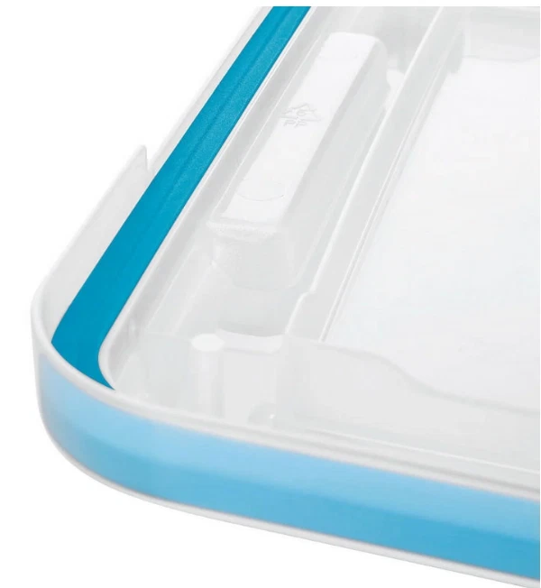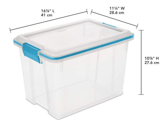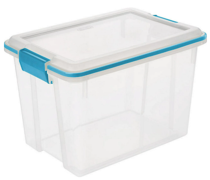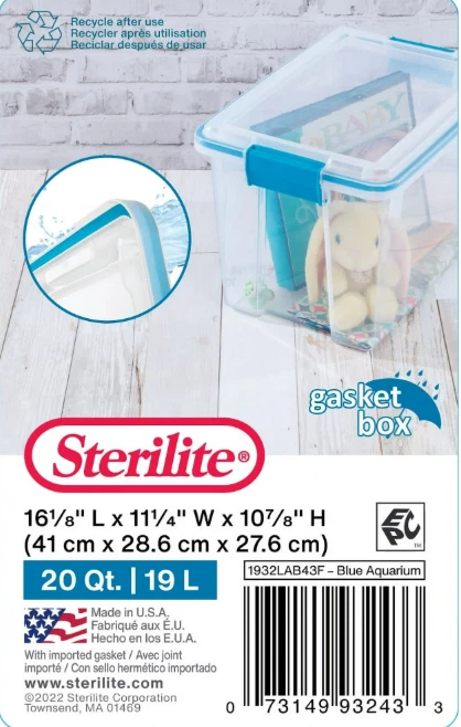 Sterilite 20 Qt. Clear Gasket Storage Box, Blue Latches with Clear Lid. About this item : Overall Assembled Size: 16 1/8" x 11 1/4" x 10 7/8" Ideal solution for those items that need to be stored away and protected Gasketed seal safeguards items from air and moisture, dust and pests Durable, tight-fitting latches keep the lid secured to the base Clear base and lid allow for easy identification of contents, without having to open it. Product details : Sterilite' s Gasket Box line is the ideal storage solution for keepsakes, photographs, important documents, linens, and other items that need to be stored away and protected. Gasket Boxes offer a gasketed seal to safeguard items from both air and moisture, keeping those special belongings safe from the elements, dust and pests. Durable, tight-fitting latches keep the lid secured to the base, and the clear lid and base allow contents to be easily identified, without opening the lid. The 20 Quart size is ideal for organizing school projects, paperwork and photographs that need to be protected, and fits conveniently on 16" wire closet shelving, making it ideal for organizing and storing small items in the closet. The gasketed seal also helps to keep pet food and other bulk foods fresh longer. The Gasket Box line has eight sizes, ranging from 7.5 Qt to 120 Qt, providing a variety of storage options for those items that need to be kept safe as well as for longer term storage needs. The 12 Qt and 20 Qt Gasket Boxes use the same lid, allowing both the shallow and deep sizes to be stacked in same footprint.