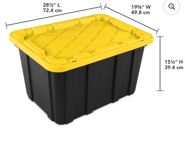 Material:PlasticProduct Height:15.2 inFinish:NAShape:RectangleCountry/Region of Manufacture:United StatesAge group:AdultItem Depth:28.5 inTheme:See DetailsColor:Black and YellowProduct Width:19.6 inItem Weight:NALid/Top Mechanism:DetachedNumber of Compartments:1Product Depth:28.5 inItem Length:Dose not applyNumber in Pack:1Original/Reproduction:OriginalColor/Finish:Black-YellowPattern:SolidModel:999-27GStyle:ModernStorage Features:Built-in Handles, Durable, Heavy Duty, NestableSize:LargeFeatures:LiddedItem Width:Dose not applyNumber of Items in Set:ONEItem Height:Dose not applyType:ContainerCapacity:75 lbBrand:SteriliteMounting:Free Standing