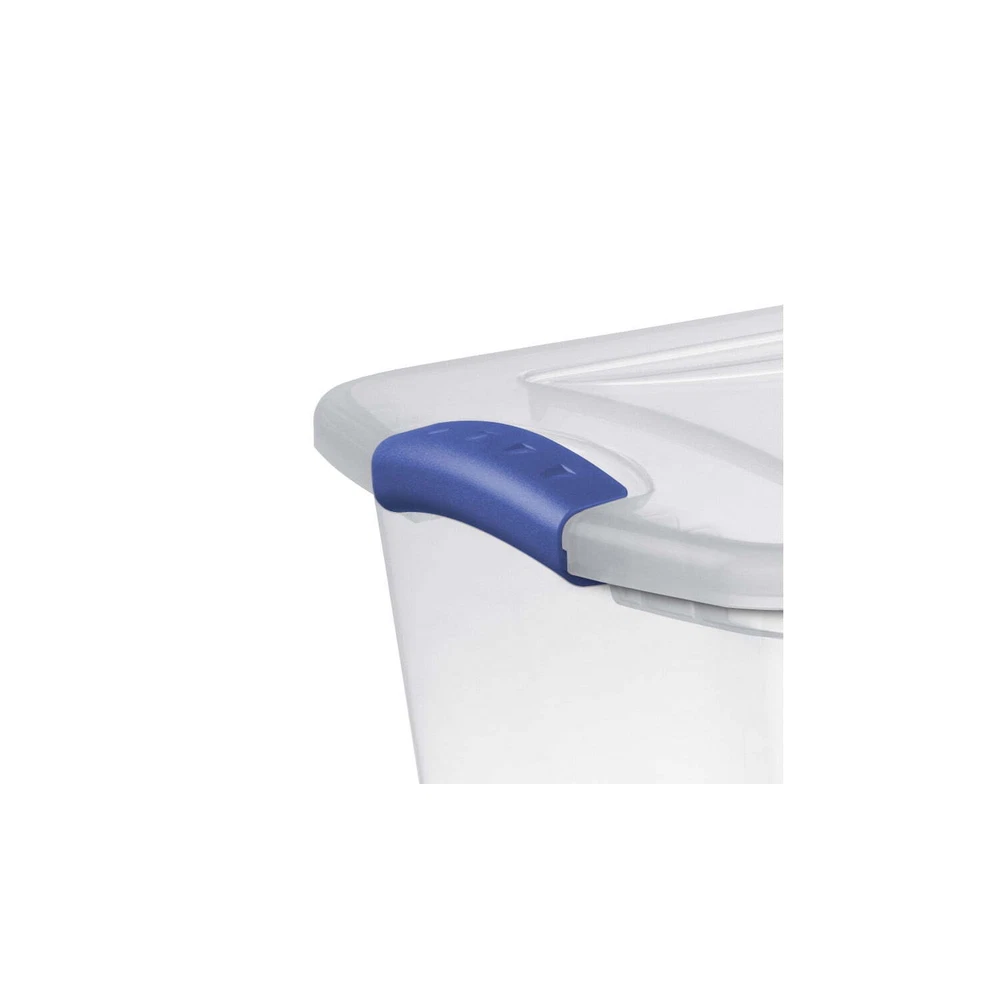 Step up to Sterilite’s versatile 27 Quart Clear Latching Storage Bin and get organized! The clear base and lid let you easily view and locate stored contents from any angle. The color accent latches keep the lid attached to the base, keeping items contained. The recessed lids help bins stack to efficiently use vertical space. This size plastic storage container is perfect for boots, accessories, clothing, linens, crafts, and more, and conveniently fits on standard shelving. This is the ideal solution for a variety of storage challenges, helping to bring order to closets, bedrooms, craft rooms, and dorms! Sterilite 27 Quart Latch Box, Clear Plastic Storage Bin with Lid, Blue Latch Outside Dimensions: 16 1/2" x 13" x 12 1/4" Interior Dimensions at bottom: 12 3/8" x 10 5/8" x 11 3/8" Clear lid and base for easy identification of contents from any angle Color accent latches keep lid secure and stored items in place This size conveniently fits on standard closet shelving to optimize your storage area Recessed lids allow bins to stack neatly to maximize vertical storage space, and the 15 Qt and 27 Qt bins use the same size lid allowing both the shallow and deep sizes to be stacked in same footprint Use good judgment when stacking items, keep heaviest bin at the bottom BPA-free and phthalate-free
