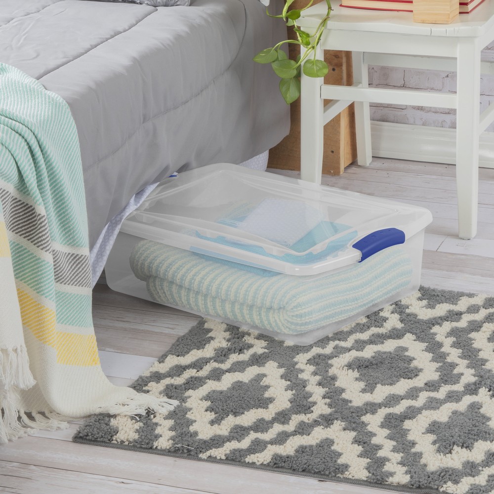 Step up to Sterilite’s versatile 32 Quart Clear Latching Storage Bin and get organized! The clear base and lid let you easily view and locate stored contents from any angle. The color accent latches keep the lid attached to the base, keeping items contained. The recessed lids help bins stack to efficiently use vertical space. This size plastic storage container is perfect for linens, towels, and seasonal clothing, and fits neatly underneath beds to optimize storage space. This is the ideal solution for a variety of storage challenges, helping to bring order to closets, bedrooms, craft rooms, and dorms! Sterilite 32 Quart Latch Box, Clear Plastic Storage Bin with Lid, Blue Latch Outside Dimensions: 24" x 16" x 7" Interior Dimensions at bottom: 20 3/8" x 14 1/4" x 6 1/8" Clear lid and base for easy identification of contents from any angle Color accent latches keep lid secure and contents in place This size fits neatly underneath beds to optimize your storage space Recessed lids allow bins to stack neatly to maximize vertical storage space, and the 32 Qt and 66 Qt bins use the same size lid allowing both the shallow and deep sizes to be stacked in same footprint Use good judgment when stacking items, keep heaviest bin at the bottom BPA-free and phthalate-free