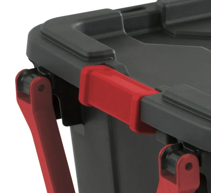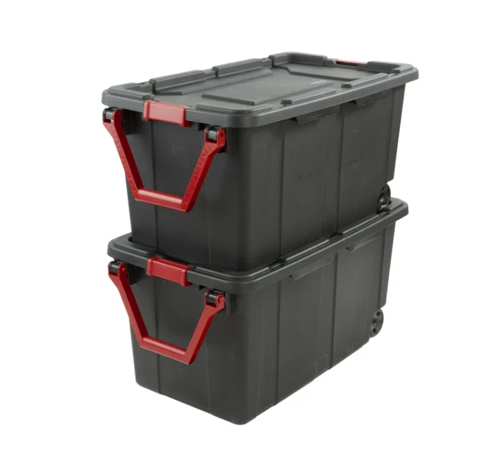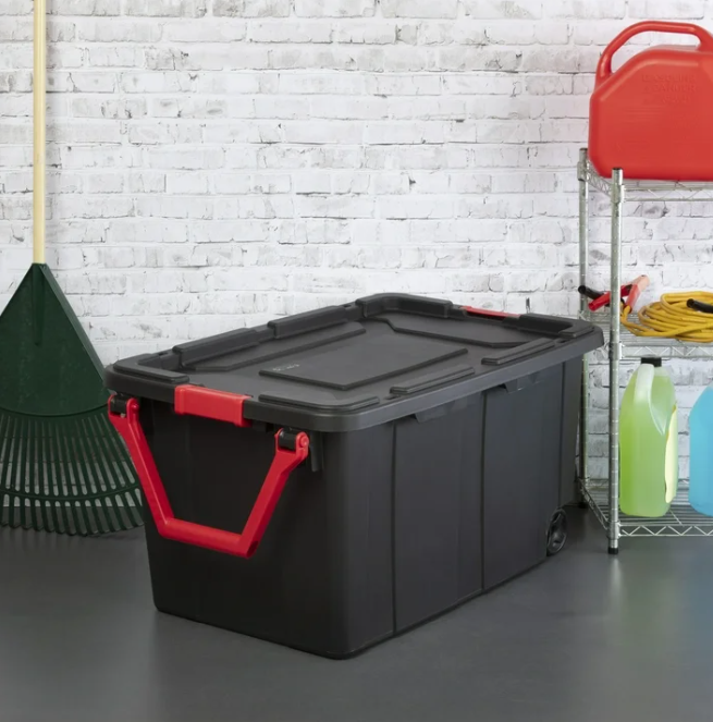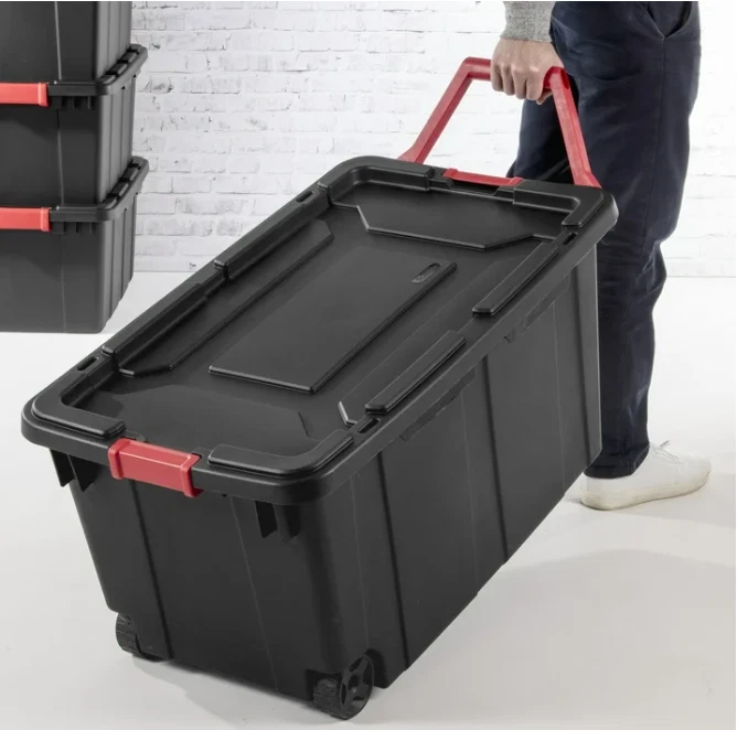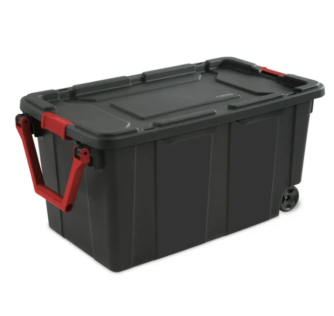 Bring order to garages, basements, and attics with the rugged design and unique features of Sterilite’s Industrial storage tote line. Be confident that stored items will stay protected in the durable 40 Gallon Wheeled Industrial storage tote, the ideal portable solution for larger and heavier supplies. The grooved lid design and keyholes provide options for tie-downs to simplify transportation and keep storage totes in place in the back of a pick-up truck. The ergonomic handle rotates up for easy pulling, while the large wheels and metal axle roll smoothly over rough surfaces. The innovative, drip-resistant lid offers maximum protection from moisture, while the tight-fit lids for storage bins keep contents secure. Robust latches ensure the lid stays attached, and the textured surface provides a secure grip during transport. With deep recessed lids, these stackable storage bins allow for efficient use of vertical space. Channeled walls add strength and help resist crushing under heavy loads. Perfect for active storage needs, this heavy-duty plastic container is great for storing camping equipment, tools, sports gear, and workshop supplies. Use it as a durable storage box for larger items or to complement your existing plastic storage bins setup in your garage or basement. Whether you're organizing long-term storage or frequently used gear, these storage boxes and bins with lids for storage deliver dependable performance with added mobility. Overall Assembled Dimensions: 36 3/4" L x 21 3/8" W x 18" H Sterilite 40 Gal, 151L Wheeled Industrial Tote, Black, Available in Case of 2 or Single Unit: Overall assembled size: 36-3/4" x 21-3/8" x 18" Rugged construction with robust non-slip grip latches Large wheels and metal axle allow for rolling over rough surfaces Ergonomic handle rotates up for easy pulling Tight-fit, drip-resistant lid provides maximum protection against items getting wet Plastic storage box available as single unit or in case of 2 Sterilite Adult Plastic 40 Gal. Wheeled Industrial Tote Black Set of 2: Outside Dimensions: 36 3/4" x 21 3/8" x 18" The 160 Qt Wheeled Storage Box is ideal for large bulky items or multiple items you want stored together Set of 2 Durable channeled walls provide added strength while clear base allows you to quickly identify contents - Black Interior Dimensions at bottom: 30 1/2" x 16" x 17 1/8" Rugged construction with robust non-slip grip latches Ergonomic handle rotates up for easy pulling and large wheels with metal axle allow for rolling over rough surfaces Deep recessed lids offer secure stacking capabilities helping to maximize available storage space Tight fit drip-resistant lid provides maximum protection against items getting wet