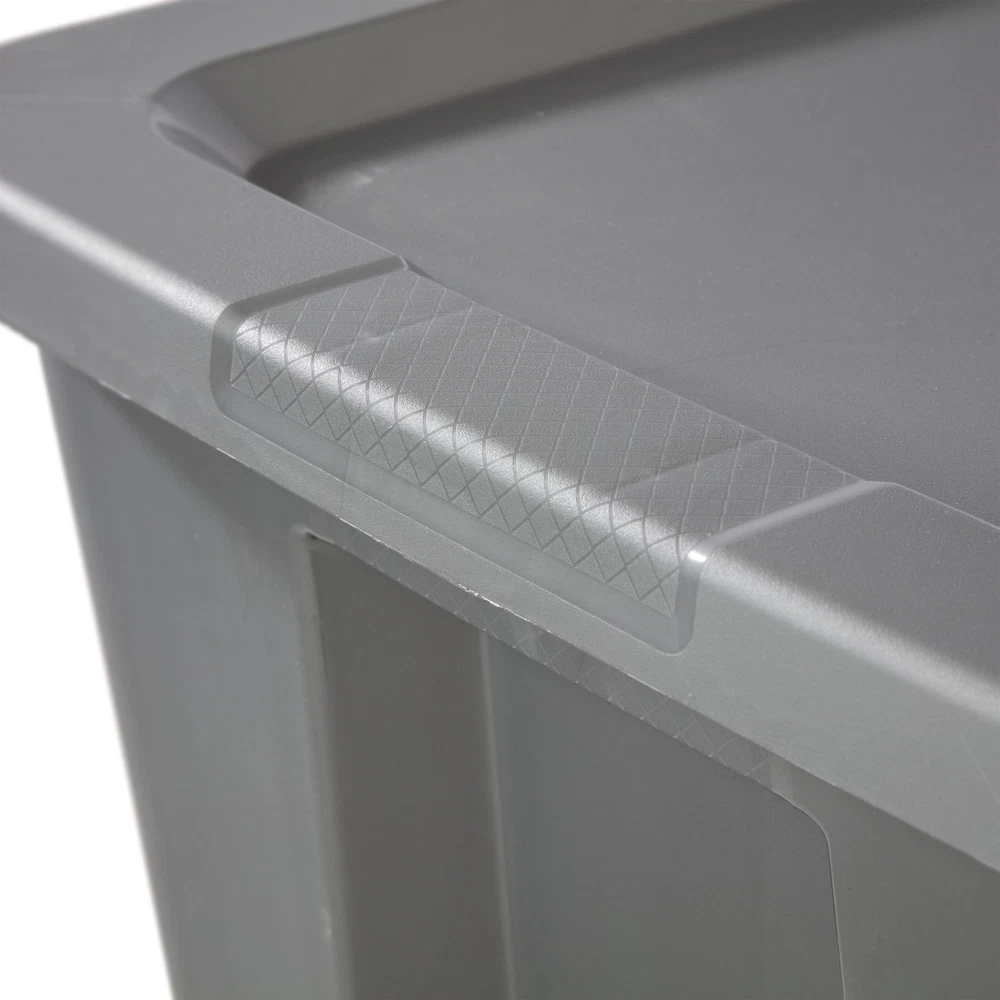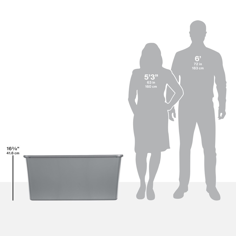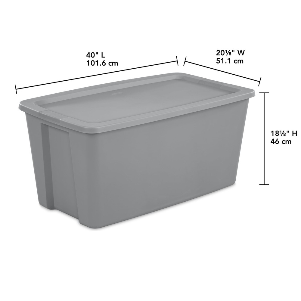 About this item Sterilite 50 Gallon Tote, Plastic Storage Bin with Snap-on Lid, Gray Outside Dimensions: 40" x 22 1/8" x 18 1/8" Interior Dimensions at bottom: 33" x 17 1/4" x 17 5/8" Integrated handles with textured surface provides a sure grip Deep recessed snap-on lid allows for secure stacking Jumbo capacity is ideal for storing larger, bulky items in the garage, basement and attic Use good judgment when stacking items, keep heaviest bin at the bottom BPA-free and phthalate-free About this item Sterilite 50 Gallon Tote, Plastic Storage Bin with Snap-on Lid, Gray Outside Dimensions: 40" x 22 1/8" x 18 1/8" Interior Dimensions at bottom: 33" x 17 1/4" x 17 5/8" Integrated handles with textured surface provides a sure grip Deep recessed snap-on lid allows for secure stacking Jumbo capacity is ideal for storing larger, bulky items in the garage, basement and attic Use good judgment when stacking items, keep heaviest bin at the bottom BPA-free and phthalate-free Sterilite 50 Gallon Tote, Plastic Storage Bin with Snap-on Lid, Gray Stay organized with Sterilite’s 50 Gallon Storage Bin. The square, space-efficient shape features a deep recessed lid which allows bins to stack securely, maximizing vertical storage space. The broad rim adds strength and the textured integrated handles make for easier carrying and lifting. Contain and conceal clutter throughout your home to create a neat and tidy living space! This jumbo size is ideal for bedding, off-season clothing, seasonal decorations, sporting gear, and more in the basement or attic. Note: Use good judgment when storing items, don’t overload, keep heaviest bin at bottom, and don’t stack too high. The overall assembled dimensions of this item are 40" L x 22 1/8" W x 18 1/8" H. On Jun 12, 2025 at 21:23:39 PDT, seller added the following information: