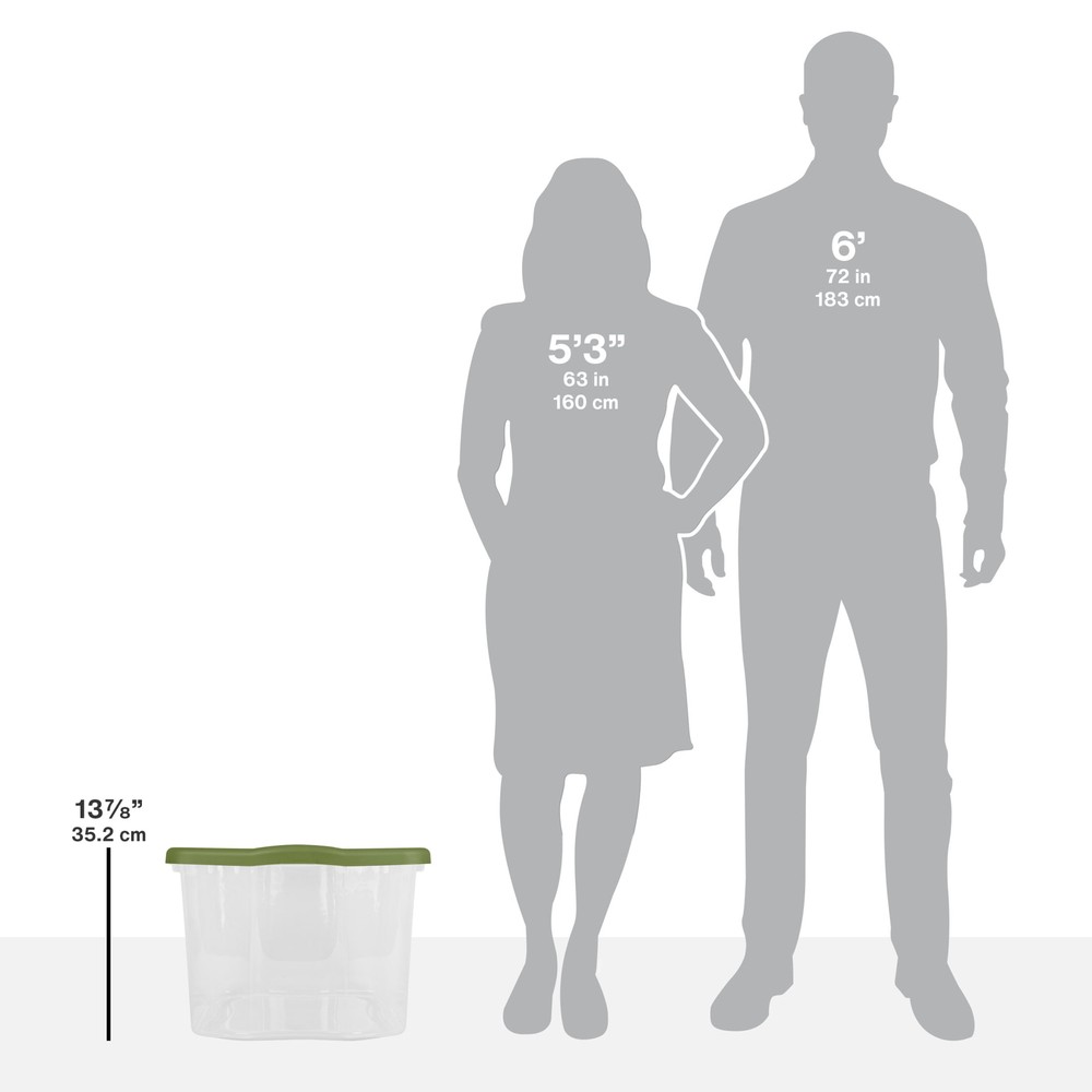 Sterilite's innovative line of EZ Carry Storage Boxes makes moving your storage easier! Unique through handles are designed to provide full grip access for comfortable lifting and carrying, as well as easier maneuvering through narrow doorways, hallways, and up and down stairs. The 70 Qt size is ideal for bedding, seasonal clothing, sporting gear, and other bulky items around the home. The clear base allows for quick viewing of contents, and the recessed lids allow same size storage boxes to stack neatly on top of each other to use vertical storage space efficiently. The 70 Qt EZ Carry Clear shares the same lid as the 95 Qt size, allowing secure stacking of both the shallow and deep storage boxes in one footprint. The 17.5 Gallon EZ Carry Tote shares the same lid so the clear and opaque versions can be stacked interchangeably. The overall assembled dimensions of this item are 24 5/8" L x 18 3/4" W x 13 7/8" H. Sterilite 70 Quart EZ Carry, Storage Bin, Full-Grip Handles, Green Outside Dimensions: 24 5/8" x 18 3/4" x 13 7/8" Interior Dimensions at bottom: 18 3/8" x 15 1/8" x 13 1/8" Carry through handles allow for full grip access and easier portability Ideal for a variety of household storage needs, with a wide range of sizes The clear base provides quick viewing of contents Deep recessed lid allows for secure stacking of multiple bases BPA-free and phthalate-free
