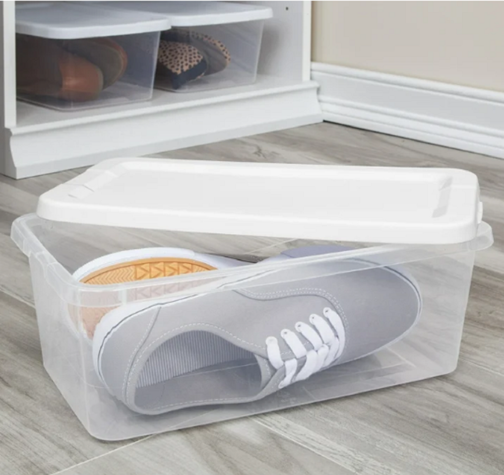 Sterilite Set of (10) Small Storage Bin, 6 Quart Clear Plastic Storage Container with Snap-On Lid, White Description : Organization is made easy with Sterilite's Set of (10) 6 Quart Storage Boxes! The convenient pack includes ten of the popular 6 Quart size storage bins with lids. The clear base lets you see what's inside while the snap on-lid keeps everything contained. The space-efficient shape and deep recessed lids allow bins to stack securely, maximizing vertical storage space. Sort and store a variety of household items to bring order to closets and bedrooms! This size plastic storage container is ideal for storing shoes, accessories, crafts and more, and conveniently fits on standard closet shelving. Note: Use good judgment when storing items, don’t overload, keep heaviest bin at bottom, and don’t stack too high. The overall assembled dimensions of this item are 13 1/2" L x 8" W x 4 5/8" H. Sterilite Set of (10) 6 Quart Storage Boxes, Clear Plastic Storage Bin with Snap-on Lid, White Outside Dimensions: 13 1/2" x 8" x 4 5/8" Interior Dimensions at bottom: 11 1/2" x 6" x 4 1/4" Clear base allows you to view contents at a glance Snap-on lids keep contents contained and are recessed to allow for stacking Ideal for basic storage needs throughout the home, and fits on standard closet shelving Use good judgment when stacking items, keep heaviest bin at the bottom BPA-free and phthalate-free