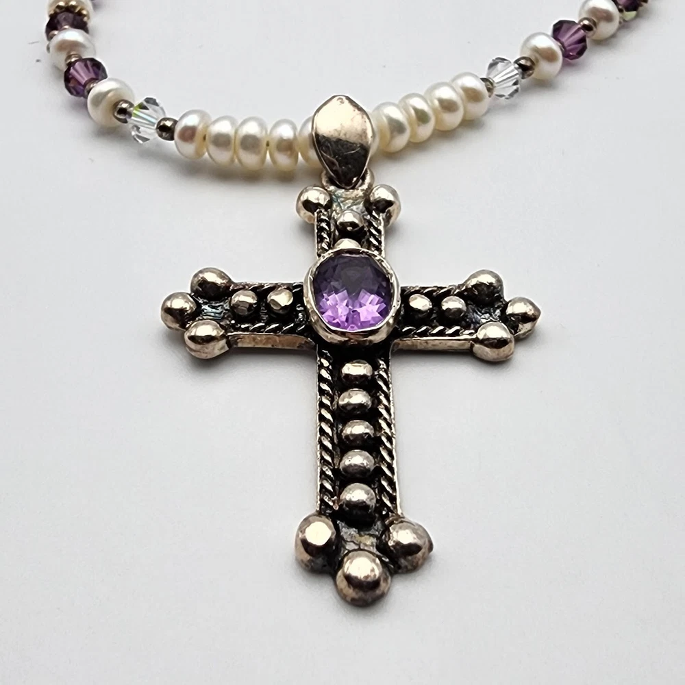 Sterling Cross Bezel Set Amethyst Pendant Button Pearl Crystal Necklace Handmade This Is A Signed Piece. I Cannot Identify the Maker. Beautiful Piece. Beads Are 4mm