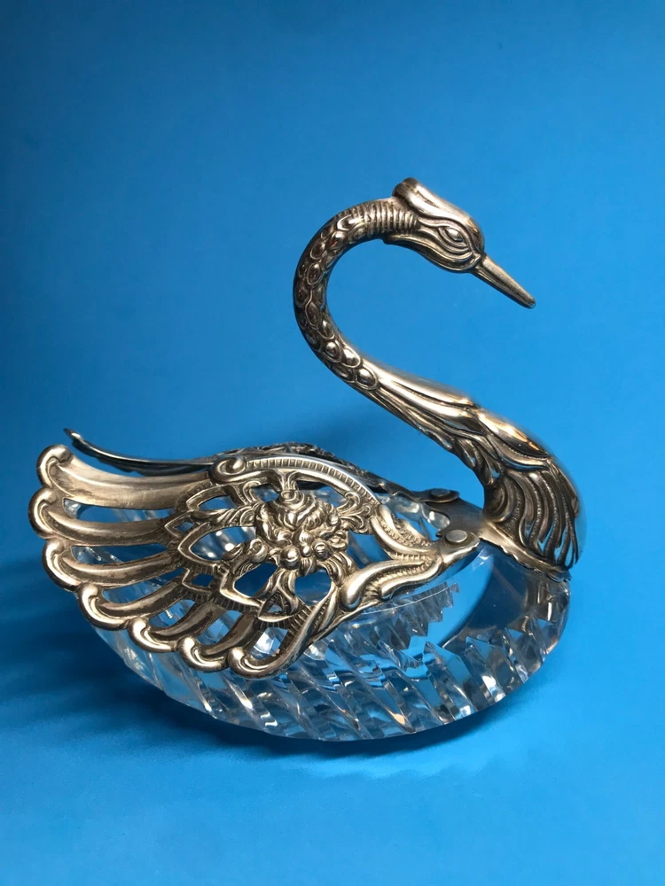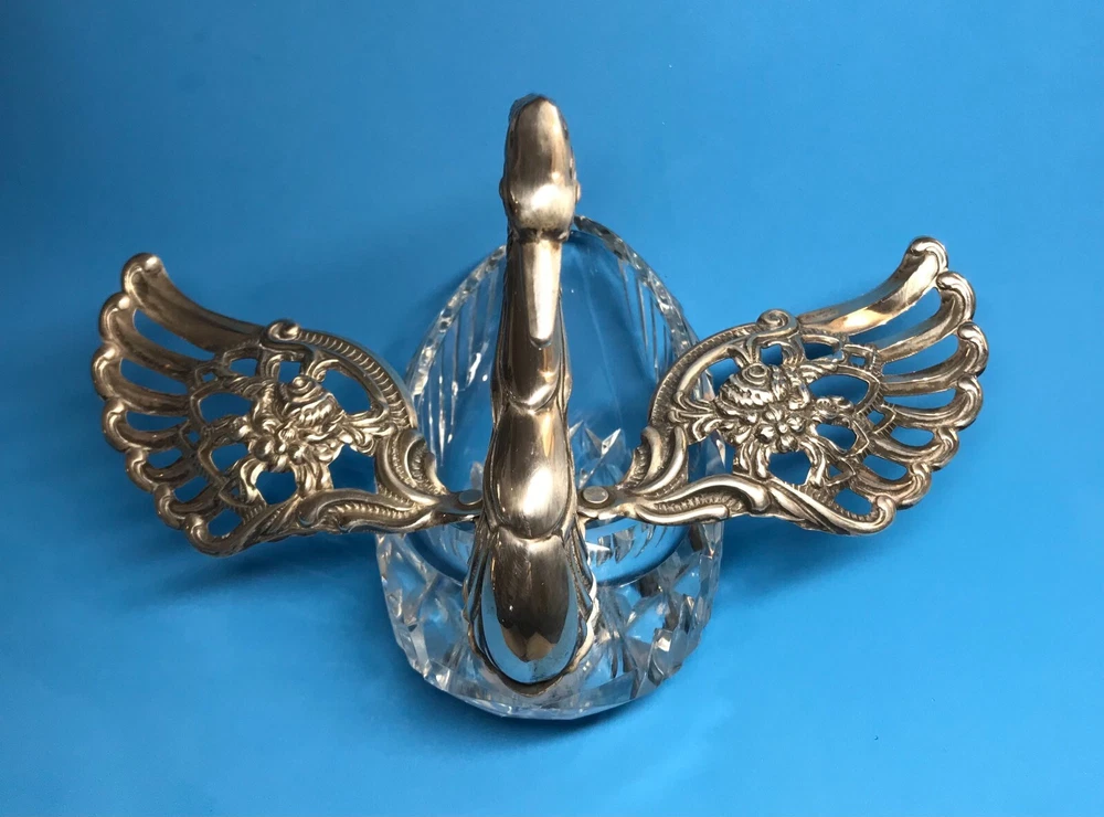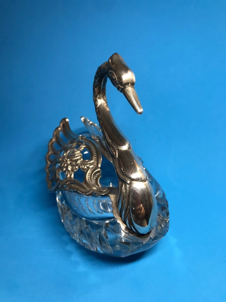 FROM MADEIRA WITH LOVE....! Found in an estate liquidation on the island of Madeira in Portugal, that of a retired antiques dealer. Vintage cut crystal and sterling silver swan bowl / dish that was found being used as a sugar bowl. Suited for use as a trinket catch all or to serve a condiment. The wings are pierced and articulated, moving side to side. One wing is stamped as illustrated, "Sterling, West Germany", hallmarked "AB" in a circle. Research came up with the maker associated with this mark, "August Betz, Schwabisch Gmund". Sitting on a table, it stands 4 3/4 inches tall while measuring it from the chest to the tail feathers, 5 1/4 inches across. Previously owned, it remains in good used condition. No chips or cracks in the crystal while the silver component remains free of dents or repairs. Black with tarnish when found, it has only been lightly polished. I have inserted a standard size playing card in one photo as a reference for size. MUCH OBLIGED