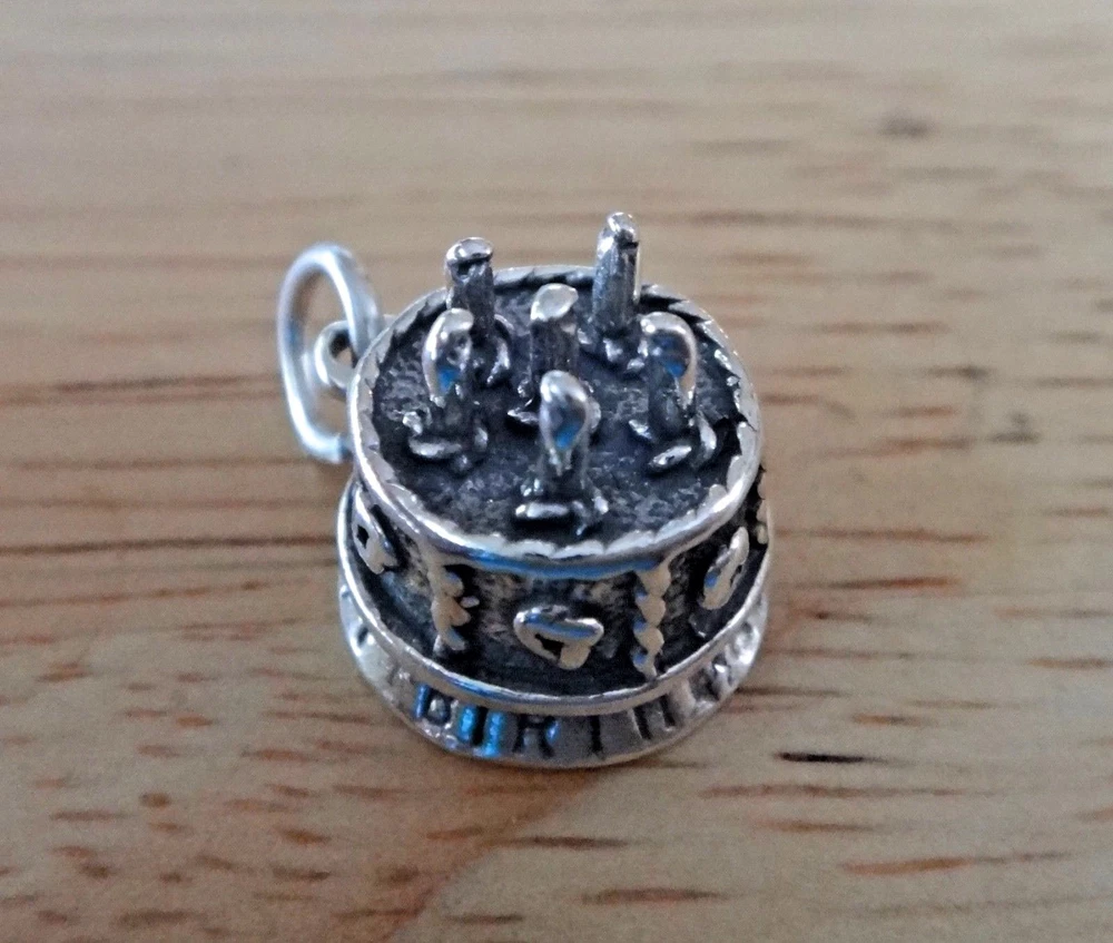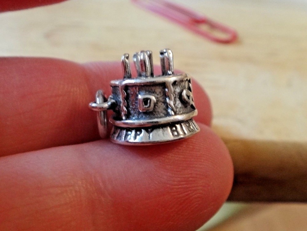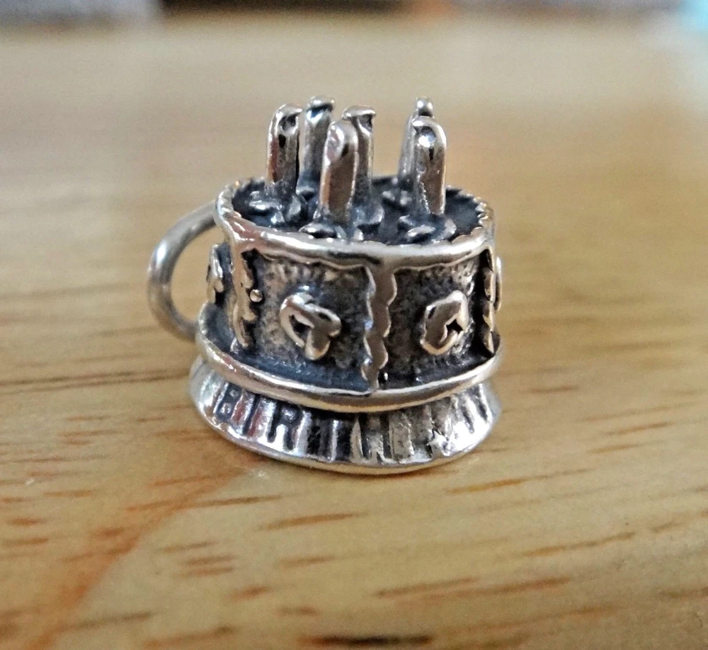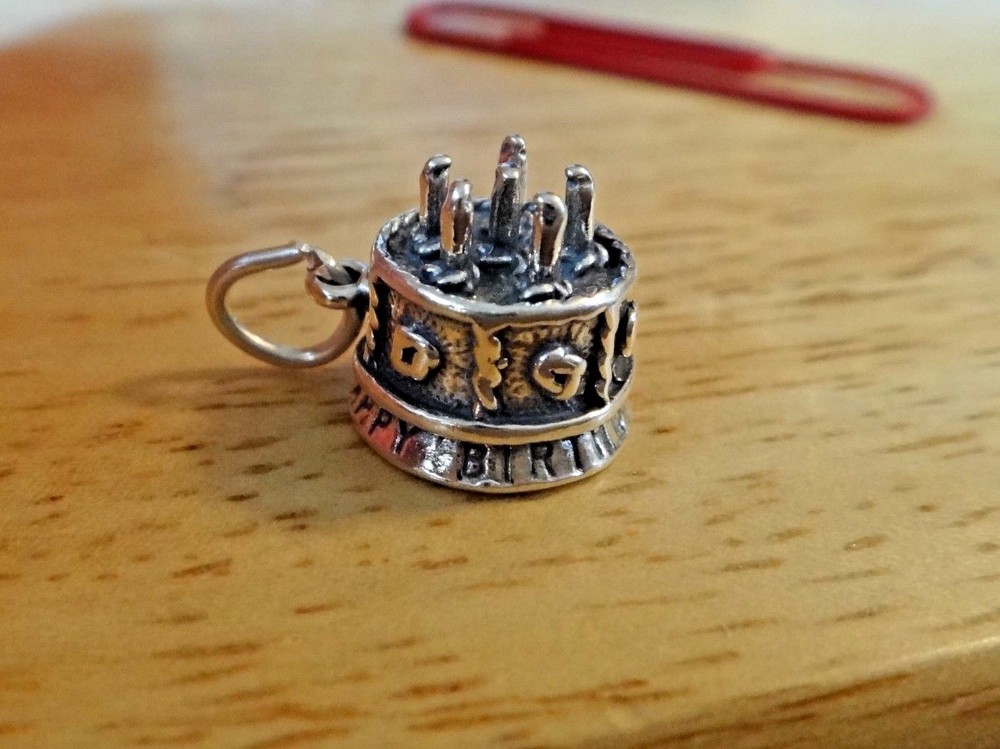 This new sterling silver large decorated birthday cake charm is 3D and says Happy Birthday around the bottom! It has 6 candles on the top and would be perfect for a Birthday gift! The charm is about 13 mm in diameter and 13 mm thick. It is hollow on the bottom. I also have many other items such as 100 different stud earrings as well as bracelets, chains, and over 6000 other charms.