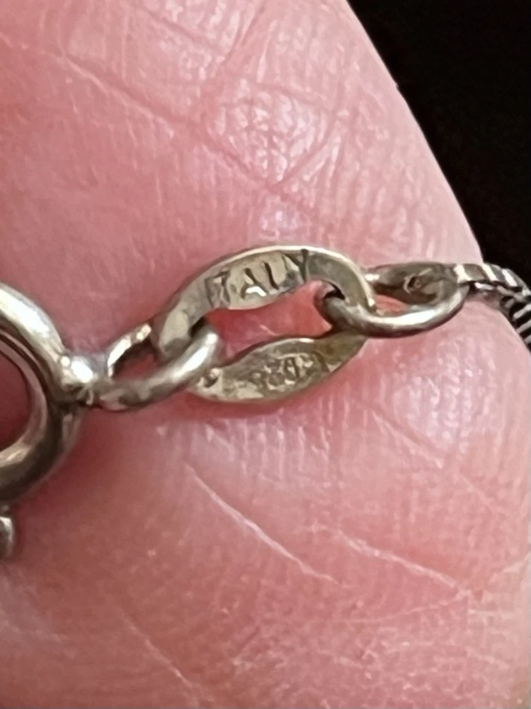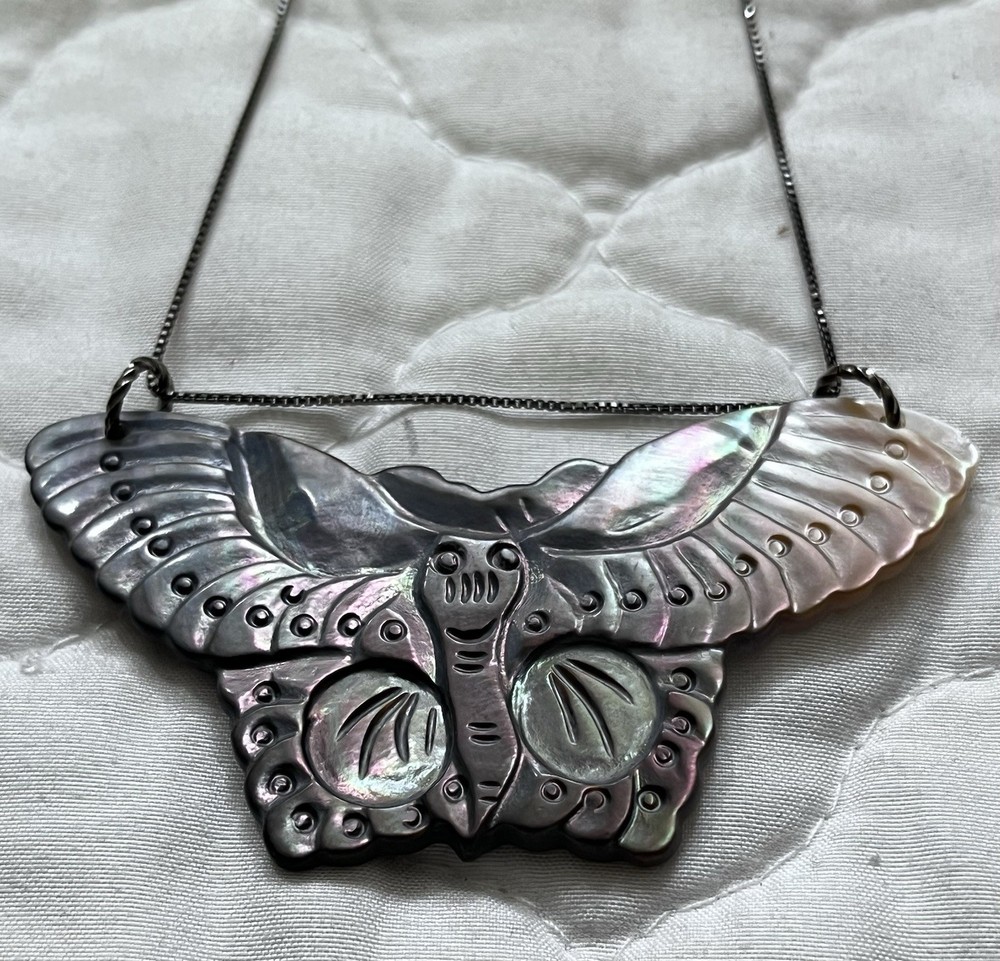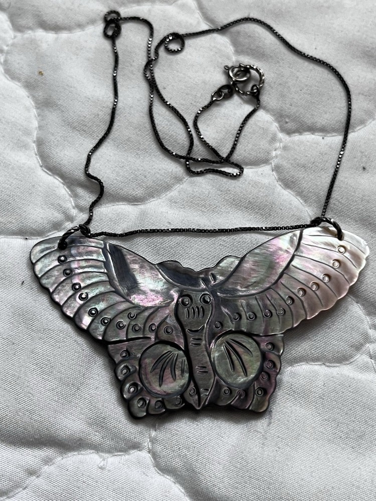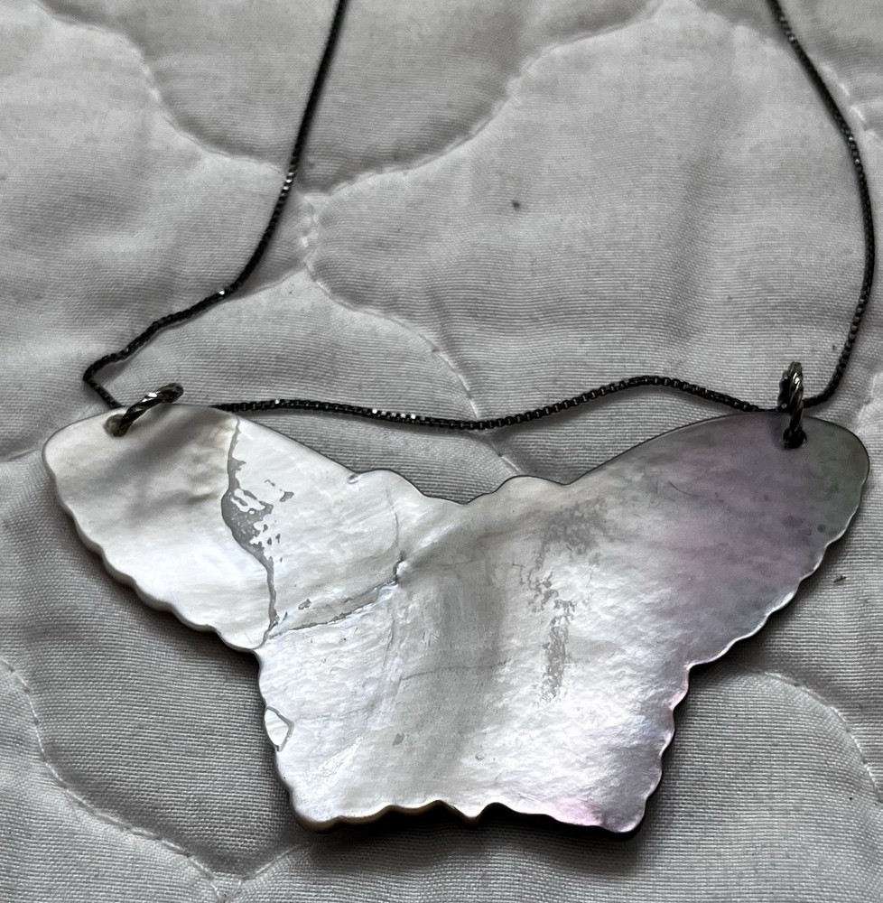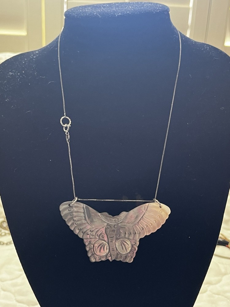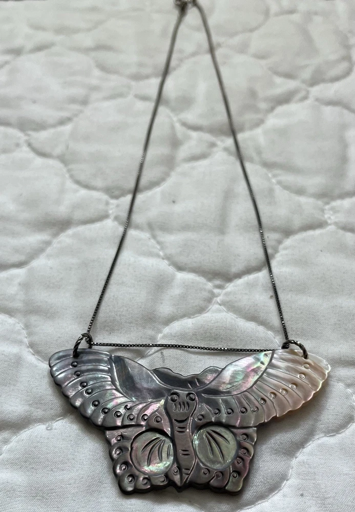 This sterling silver 925 butterfly pendant necklace features a mother of pearl box chain from Italy. The pendant shape is a butterfly, with a mother of pearl/abalone main stone in multicolor. The necklace has a spring ring closure and a charm pendant style, making it a unique and elegant accessory that would be perfect for anyone who loves animal and insect-themed jewelry. The combination of natural materials, sterling silver, and intricate design make this necklace a beautiful and timeless piece that can be worn for any occasion. 18” chain. Butterfly 3“ x 2“.